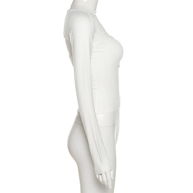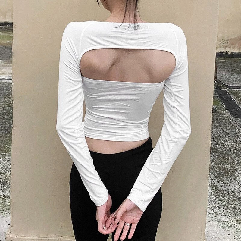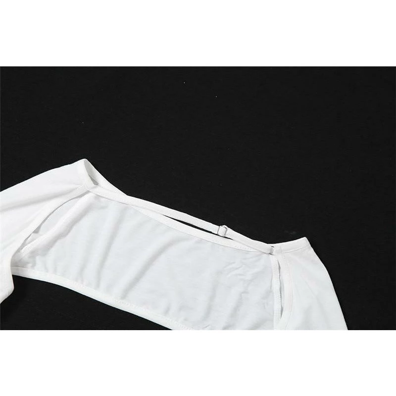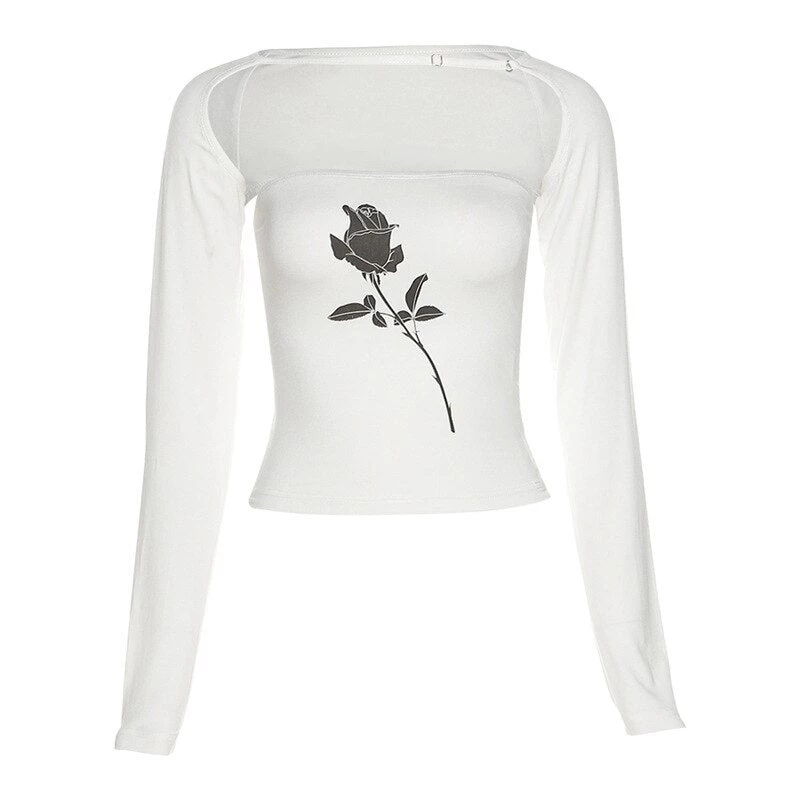 White tube top with a black rise design print and matching tight bolero-style sleeved top.