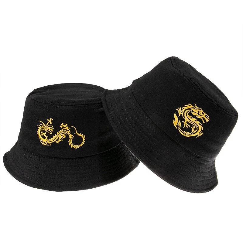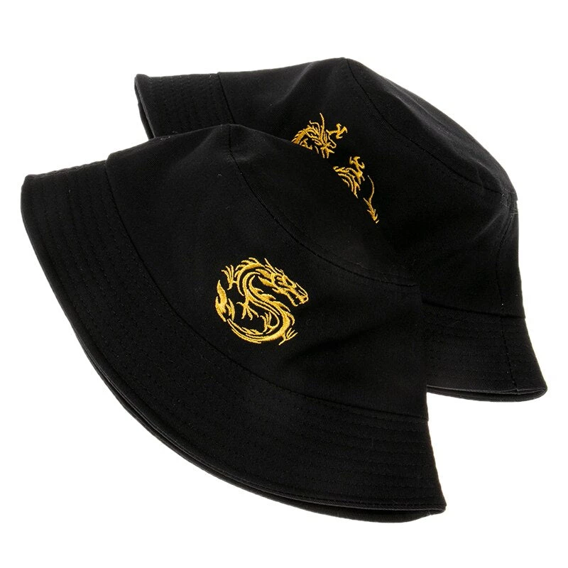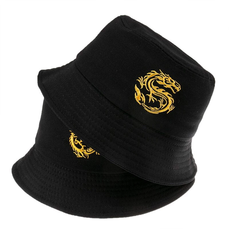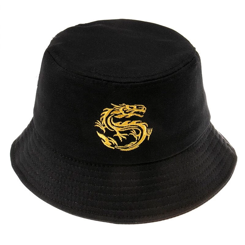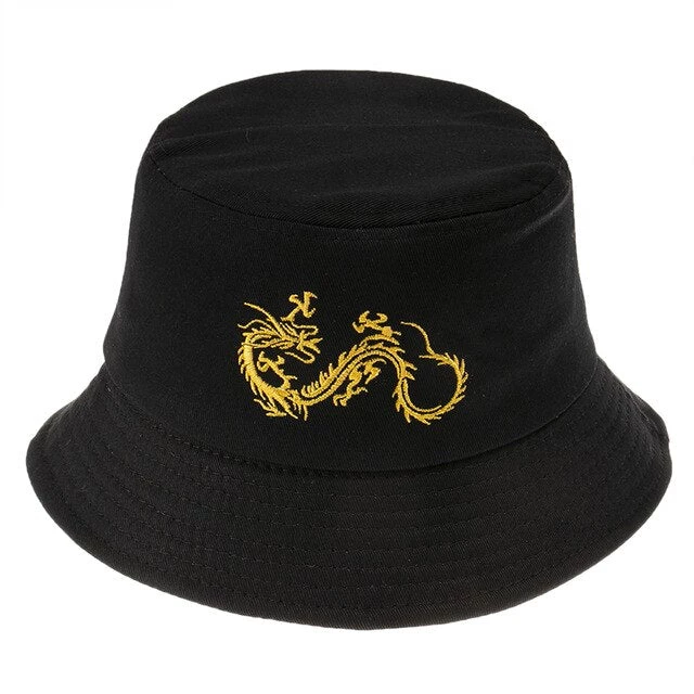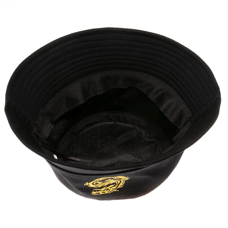 Black bucket hat with an embroidered dragon design.