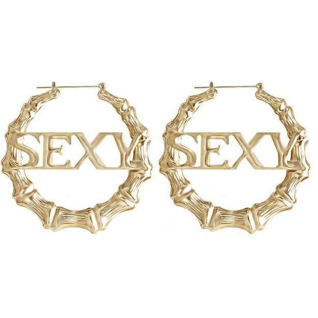 Gold or silver coloured, hollow bamboo-style ‘SEXY’ hoop earrings.