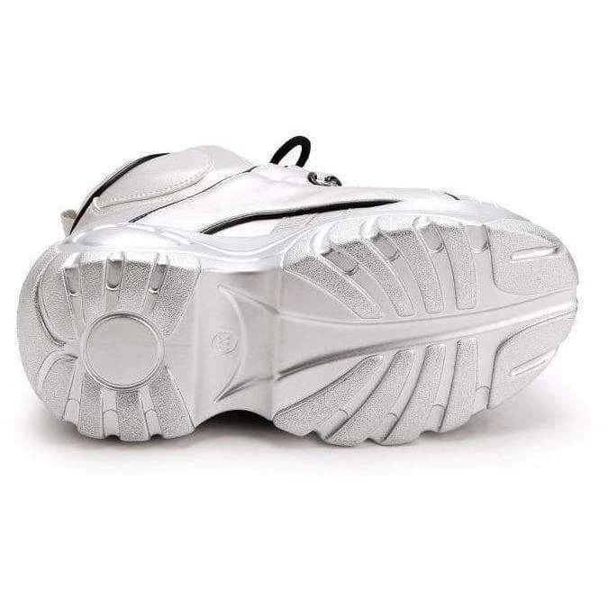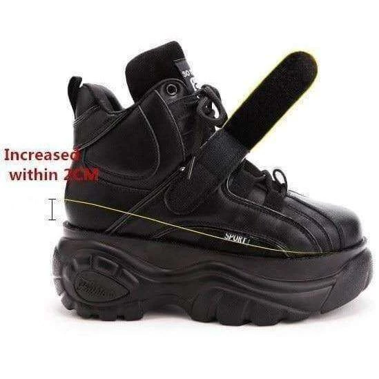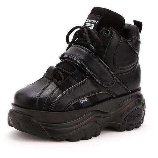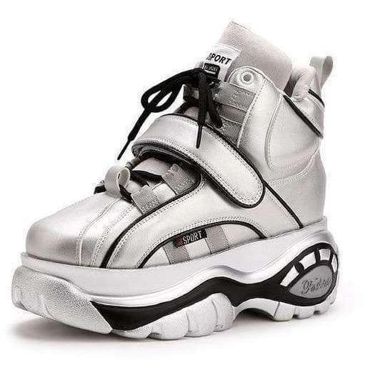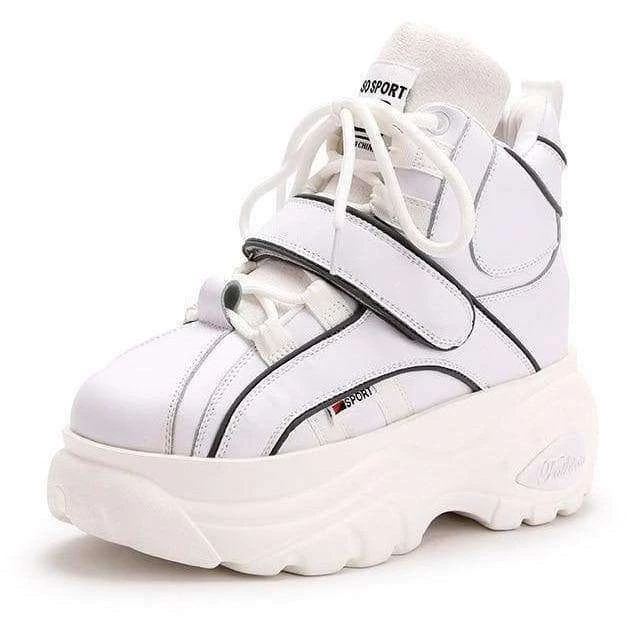 Retro-style, high top chunky platform trainers with laces and velcro fastening. Increasing height wedge inside shoe. Please refer to pictures.
