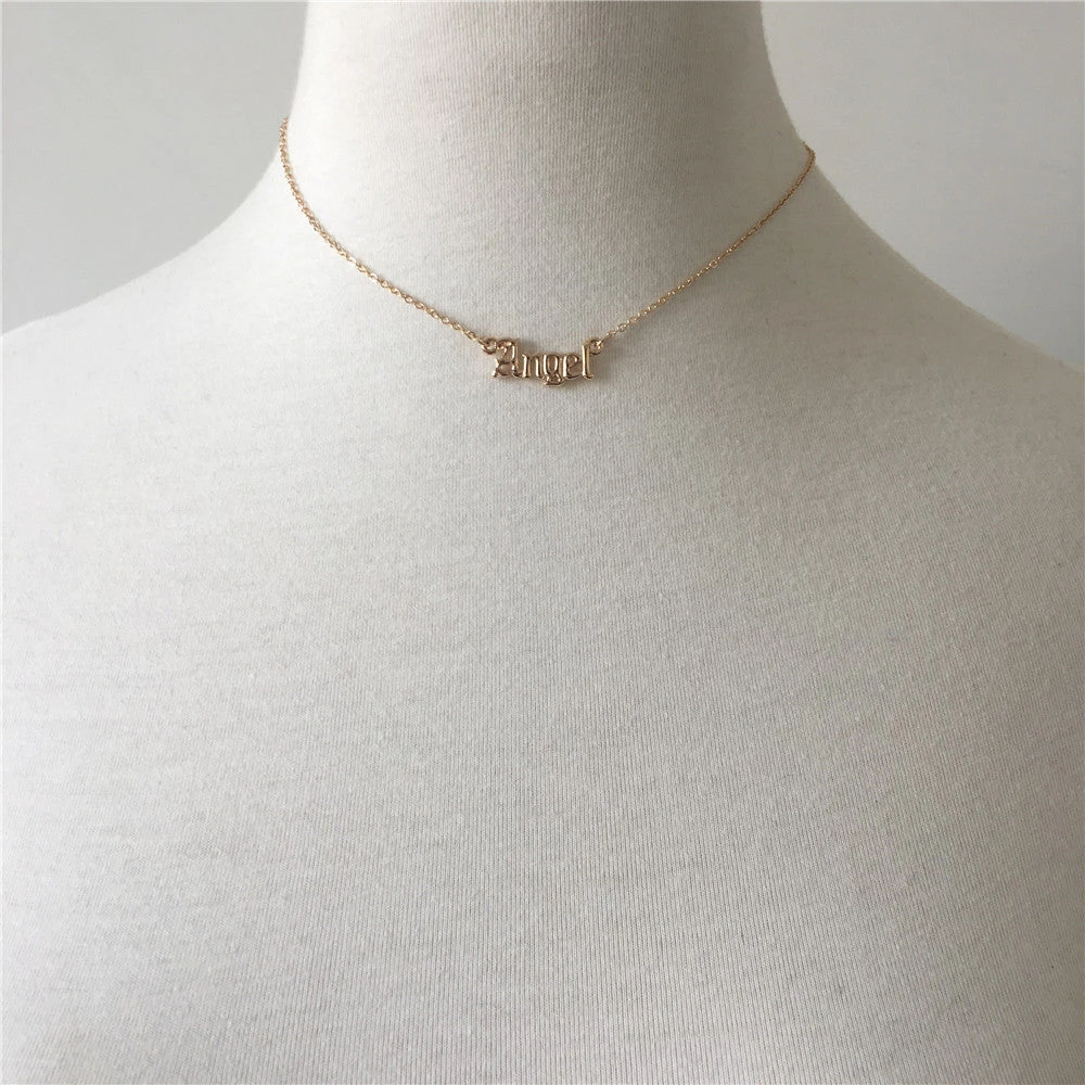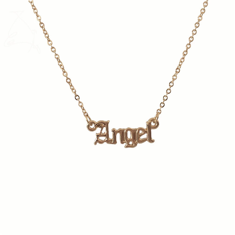 Gold coloured short chain necklace with an ‘ANGEL’ slogan in gothic font.