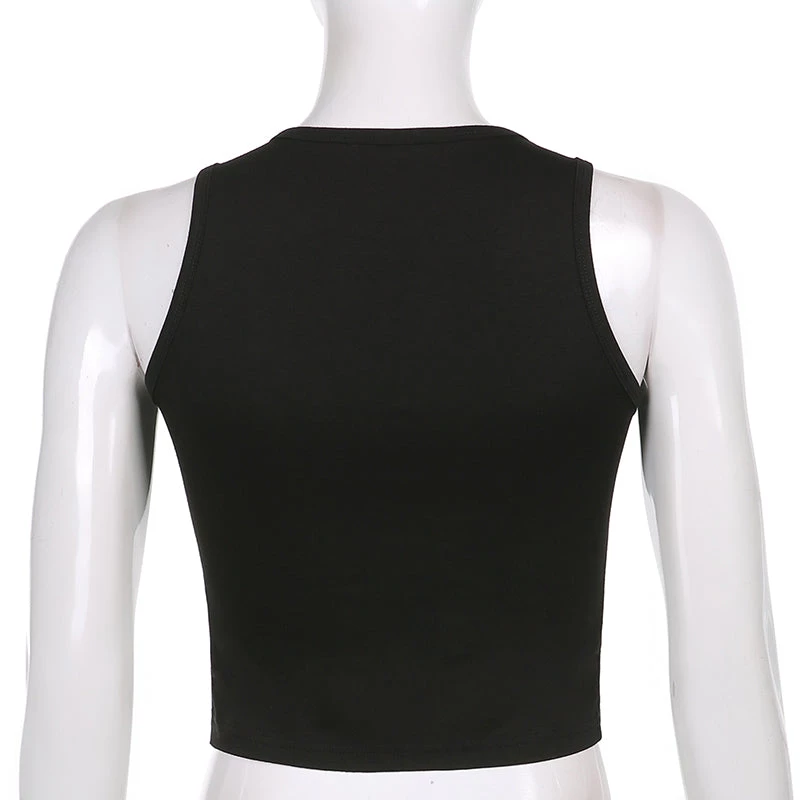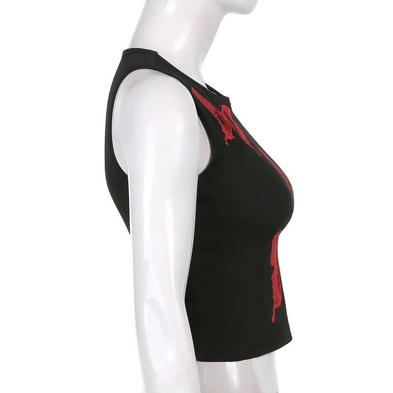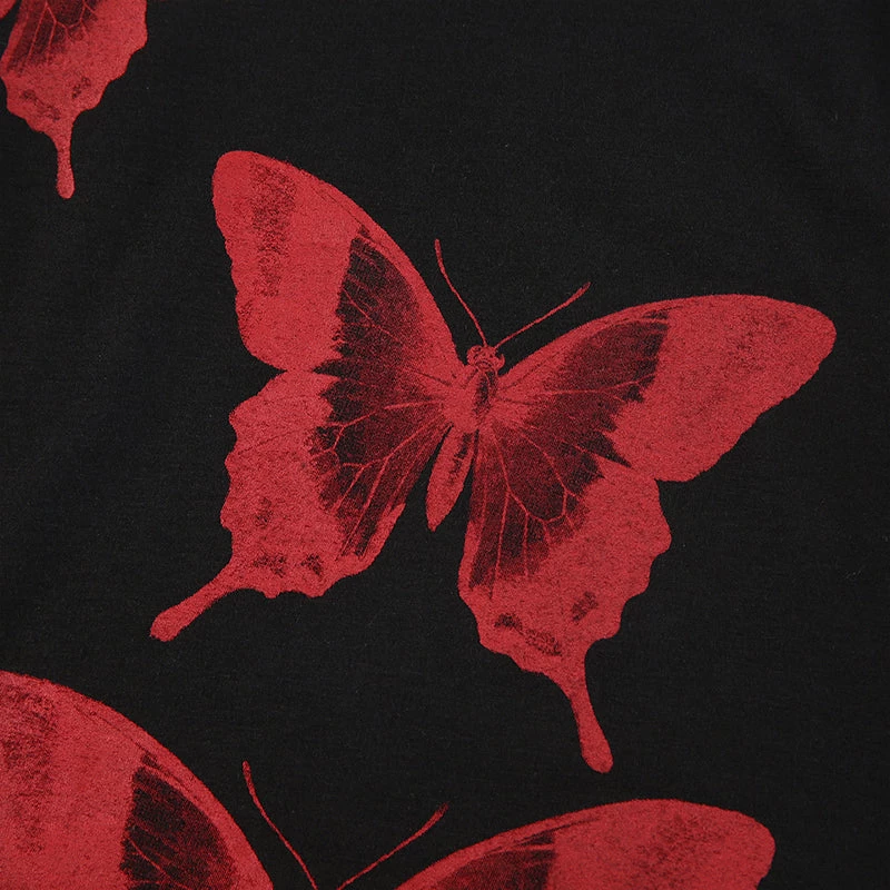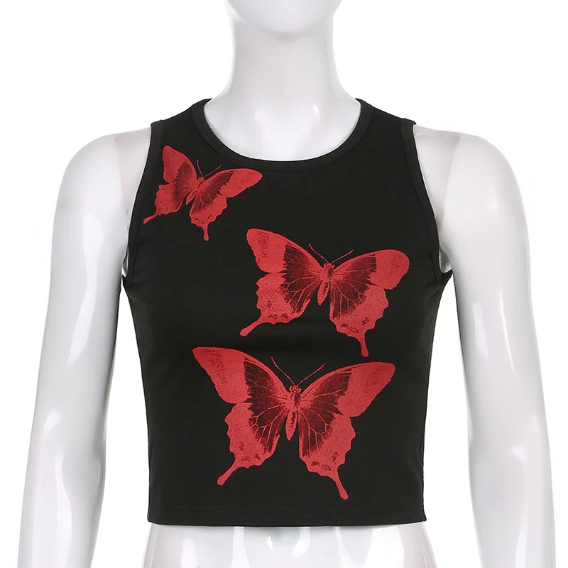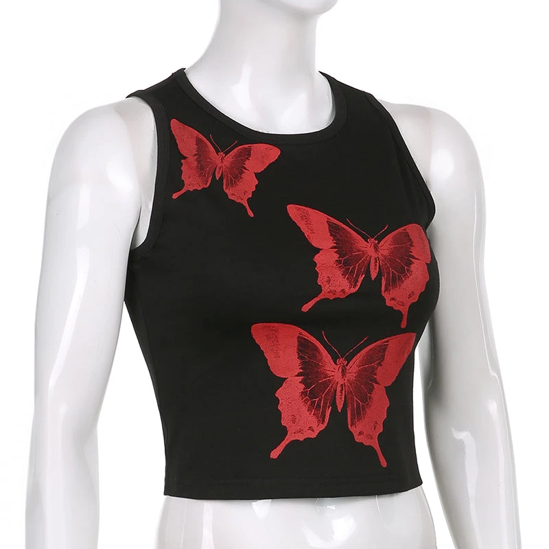 Black tank crop top with a large red butterfly print design.