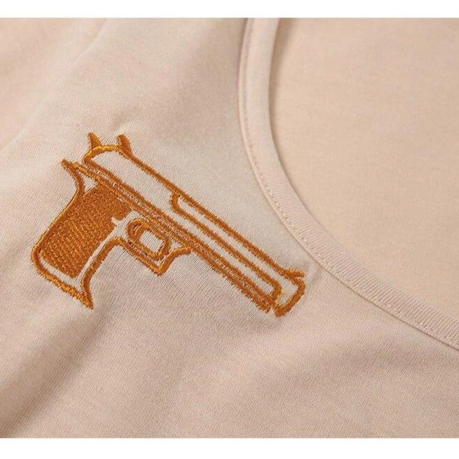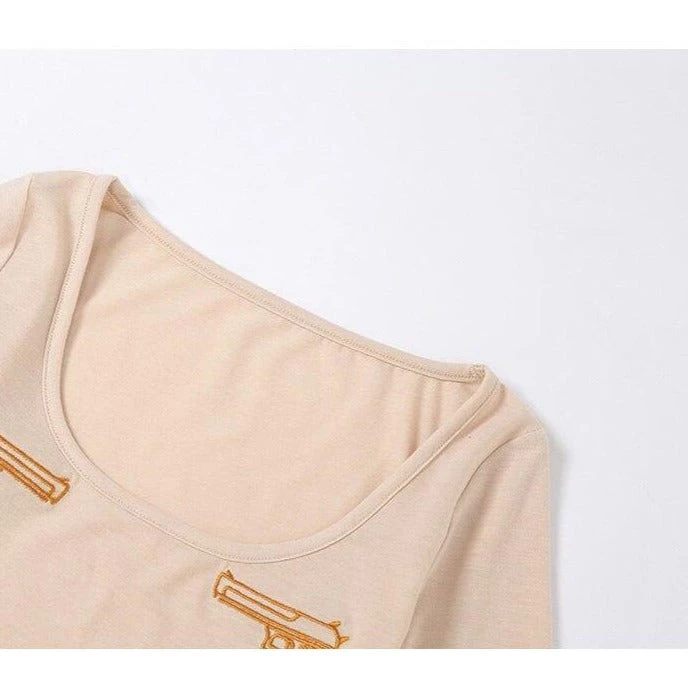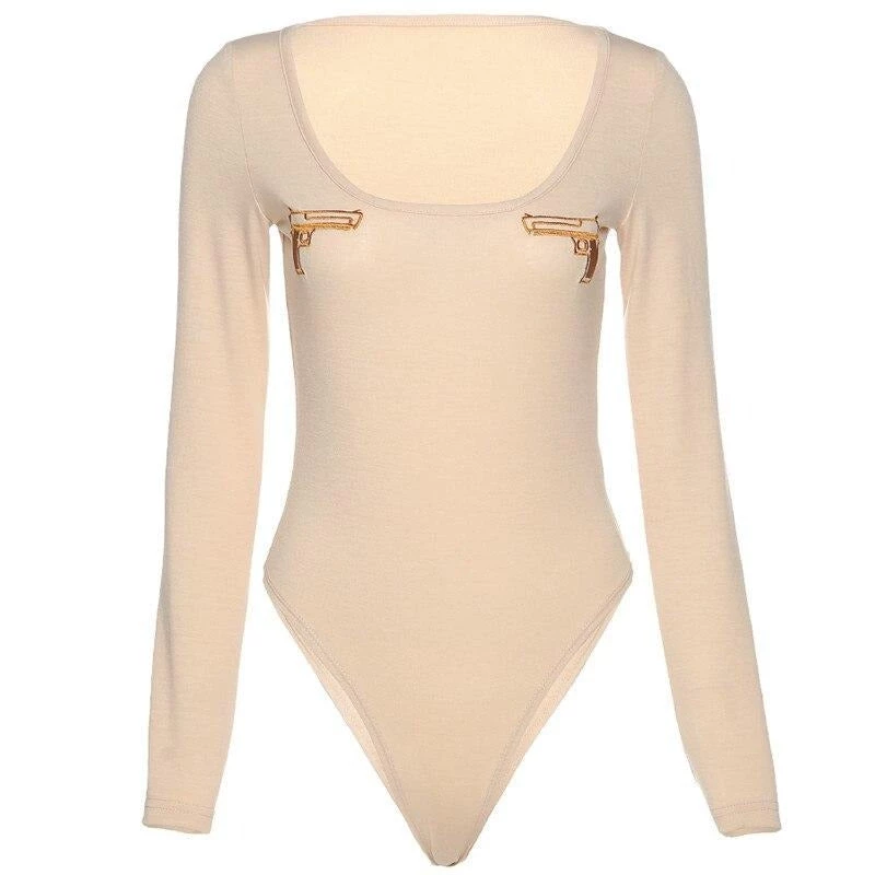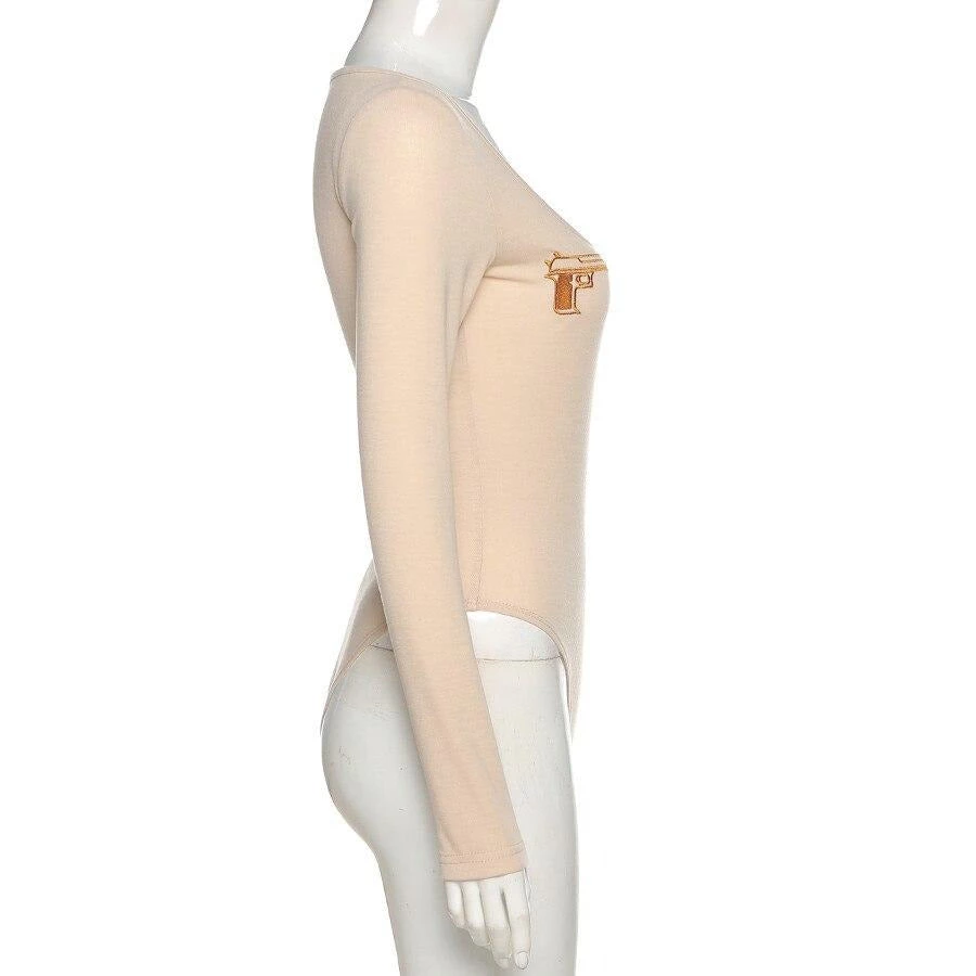 Long sleeved khaki bodysuit with a chest gun embroidery design.