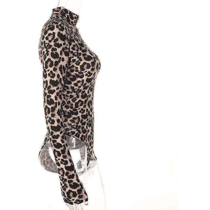 Long sleeved, leopard print turtleneck bodysuit.