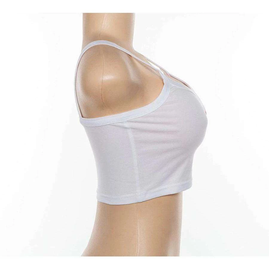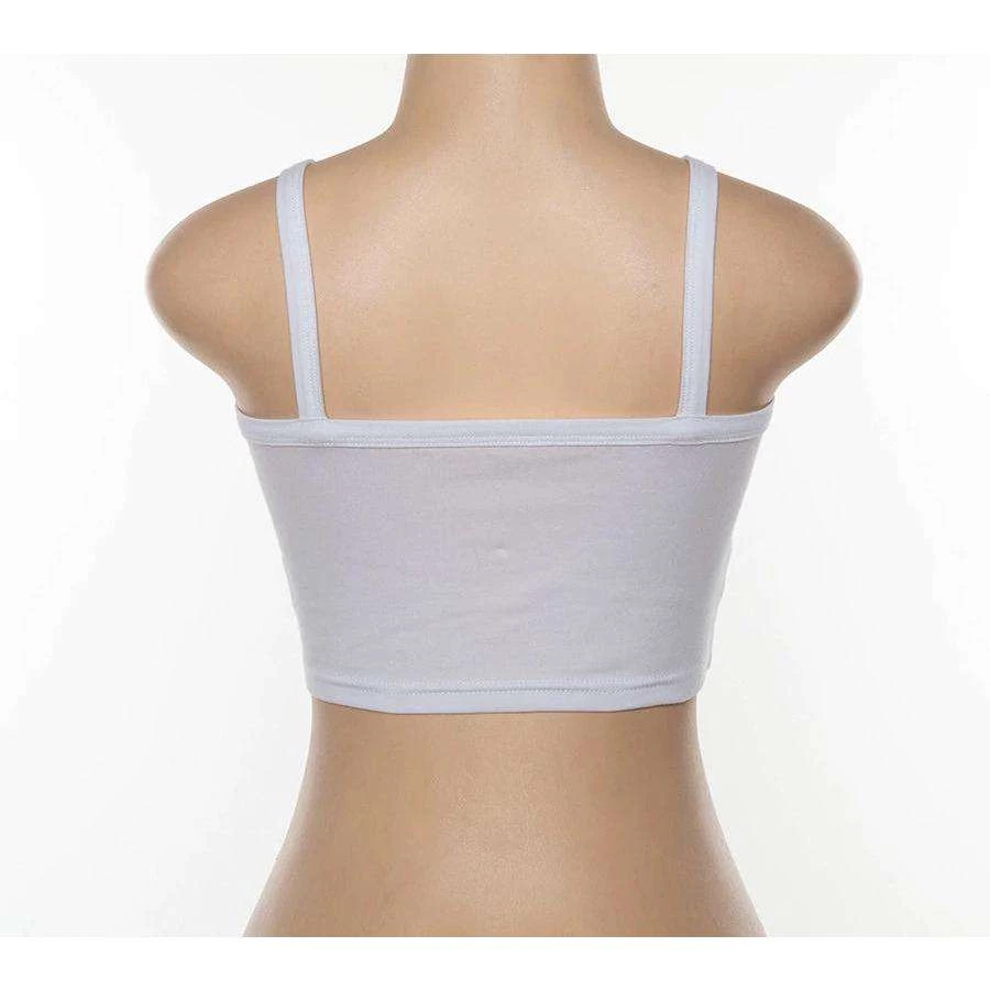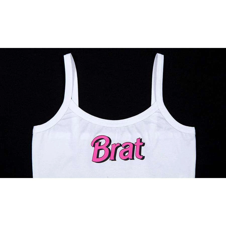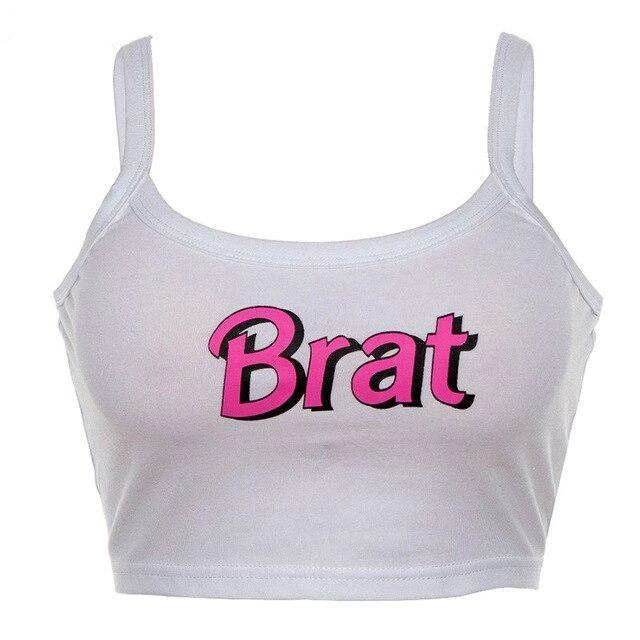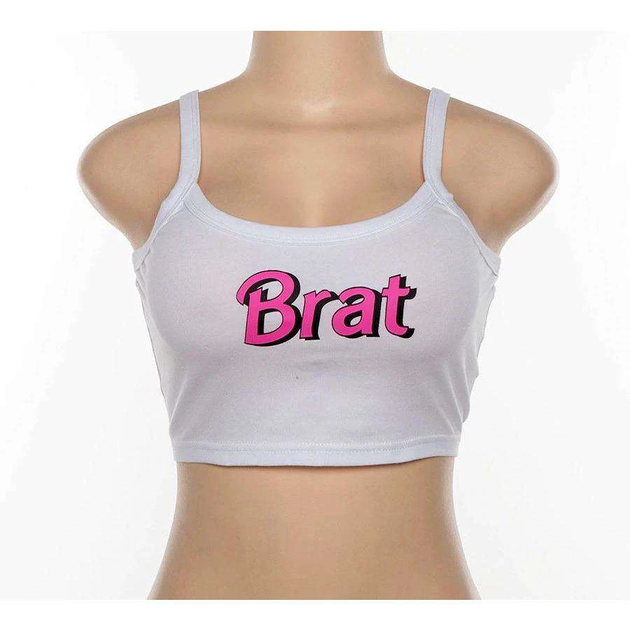 White cami crop top with ‘BRAT’ slogan print.