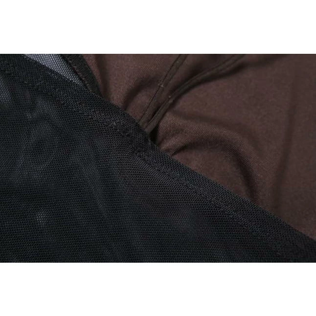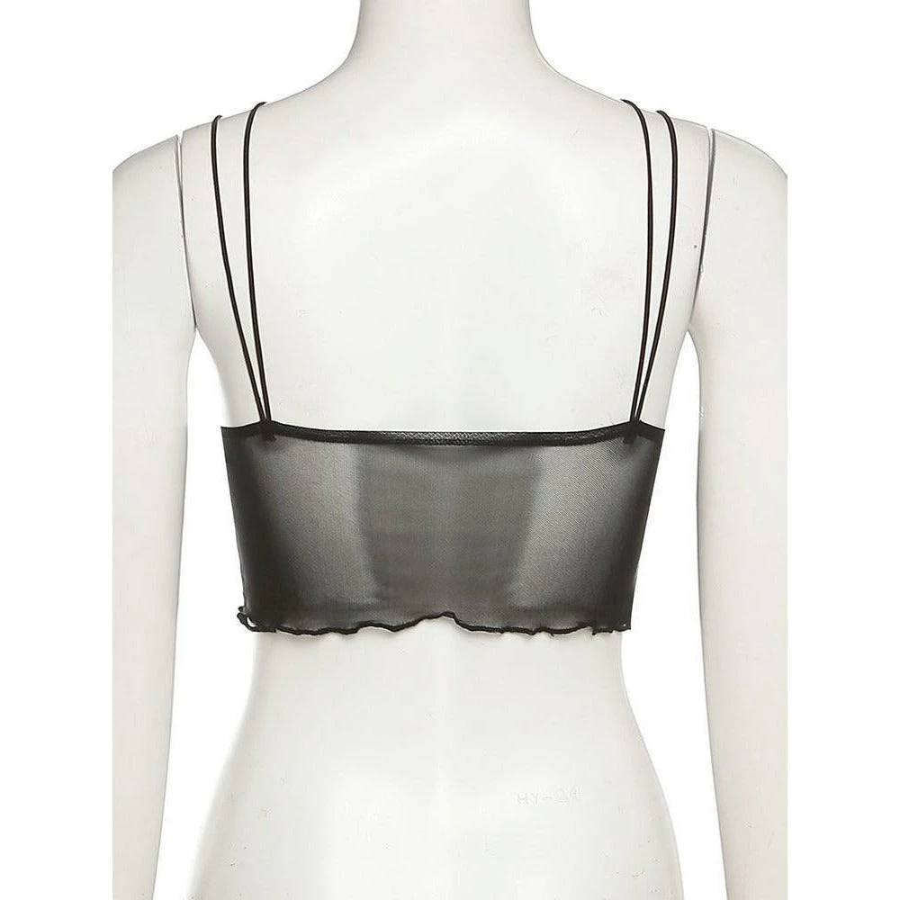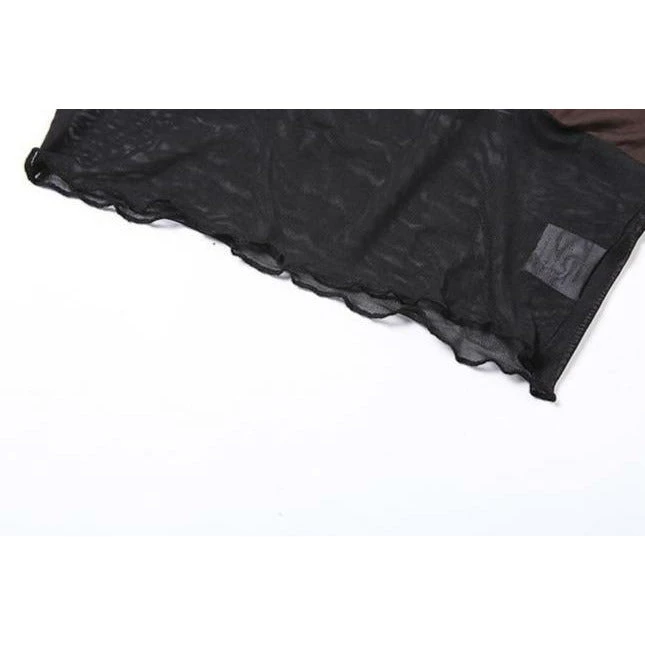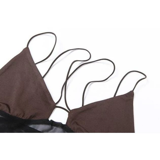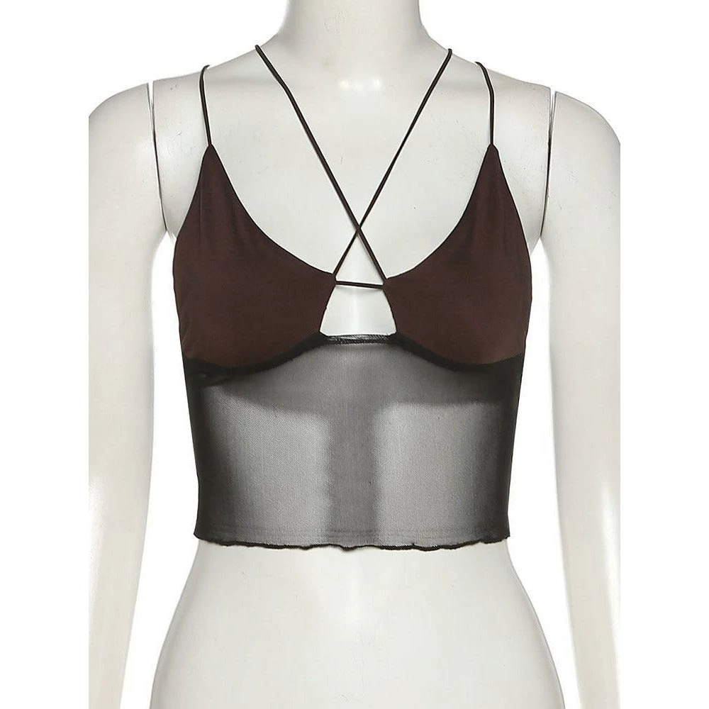 Brown crop top with a semi-sheer bottom panel and cross straps.