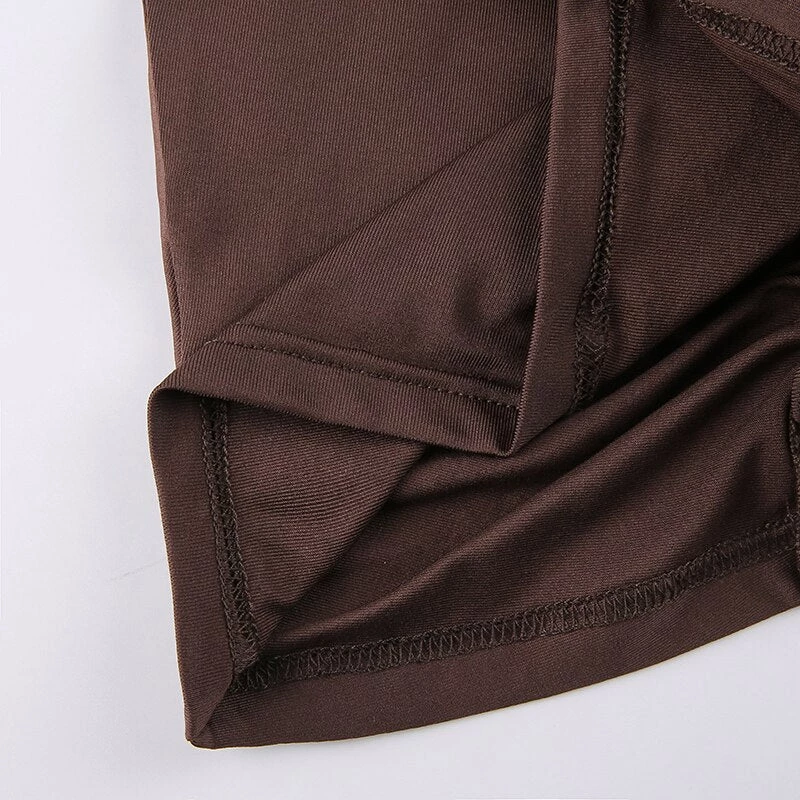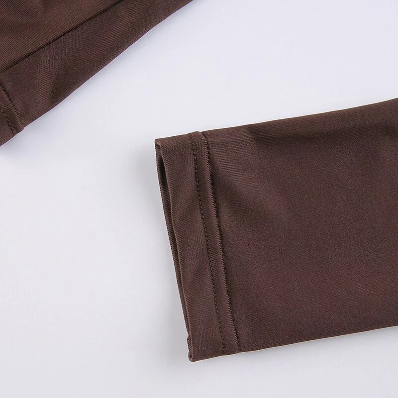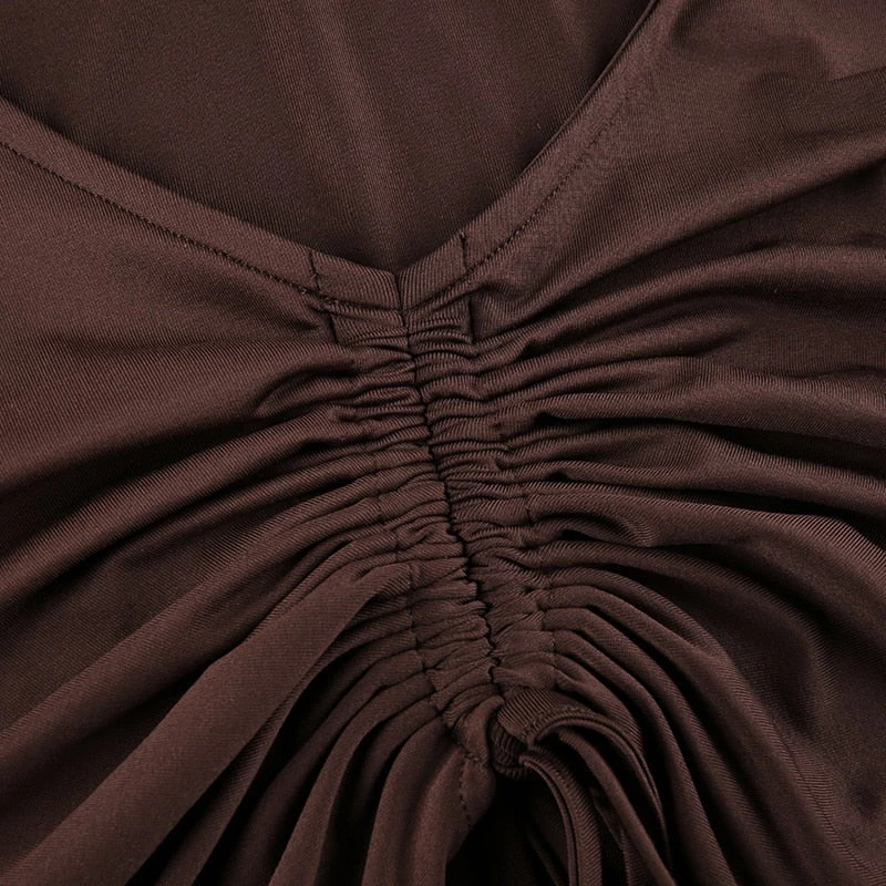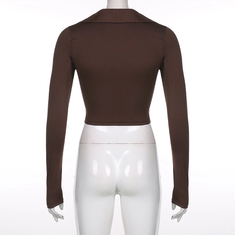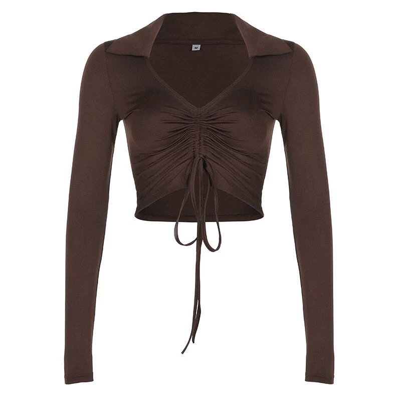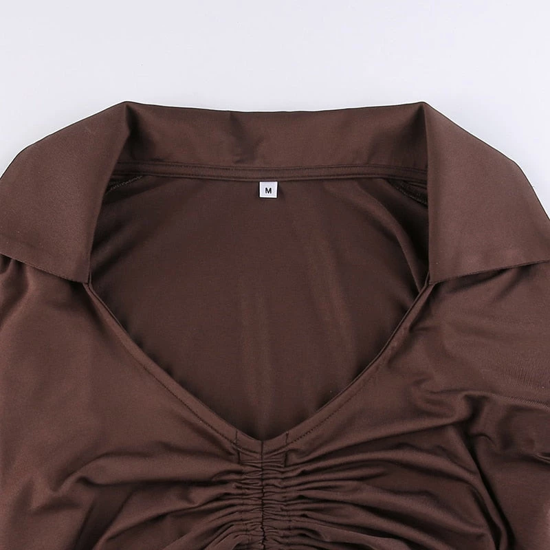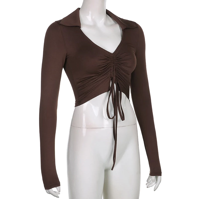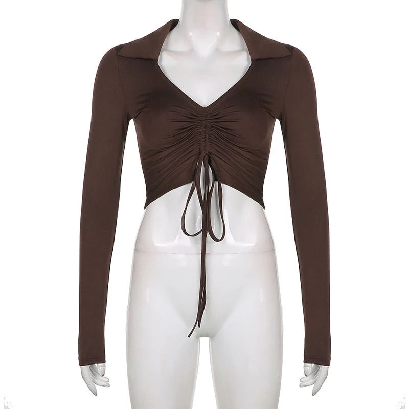Brown long sleeved collared crop top with a centre ruched design and V-neck.
