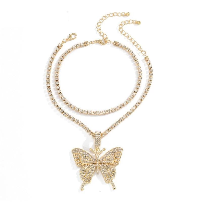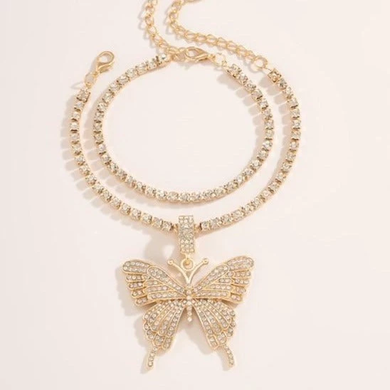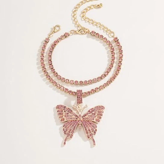 Double rhinestone anklet, one with a dangling butterfly pendant.