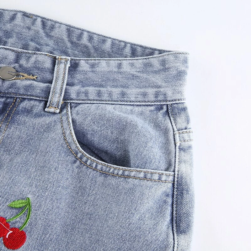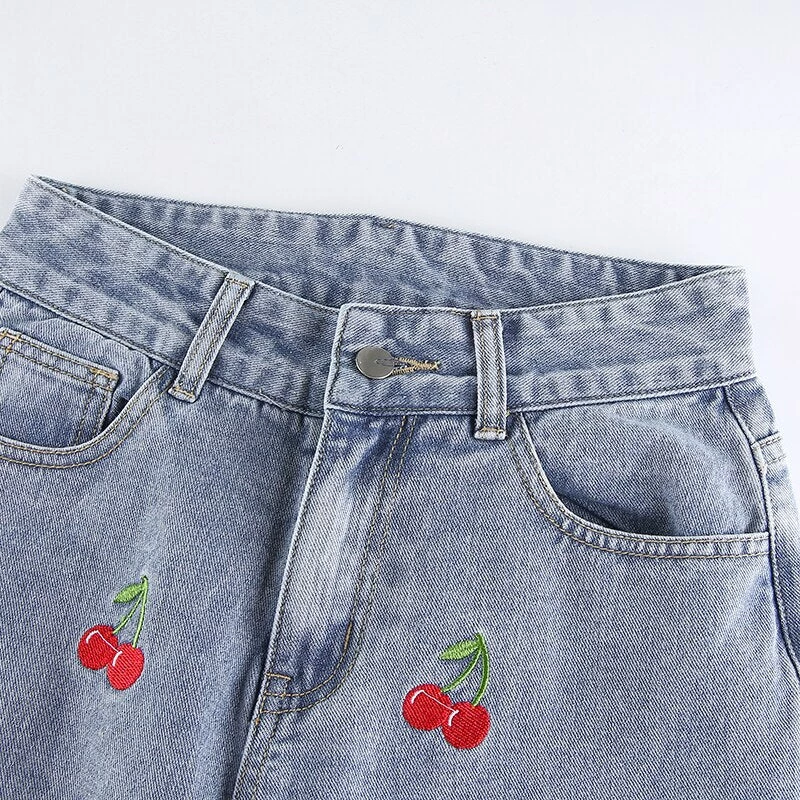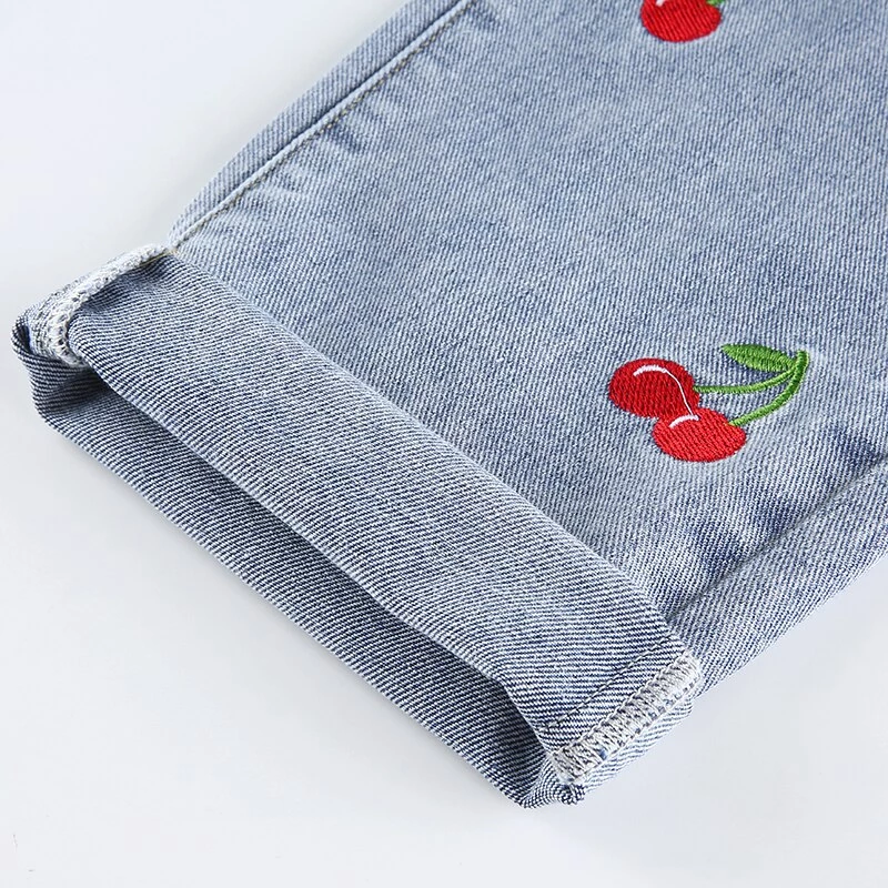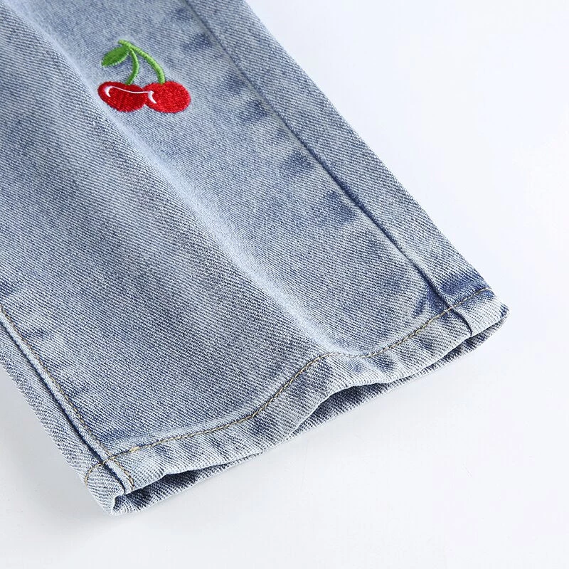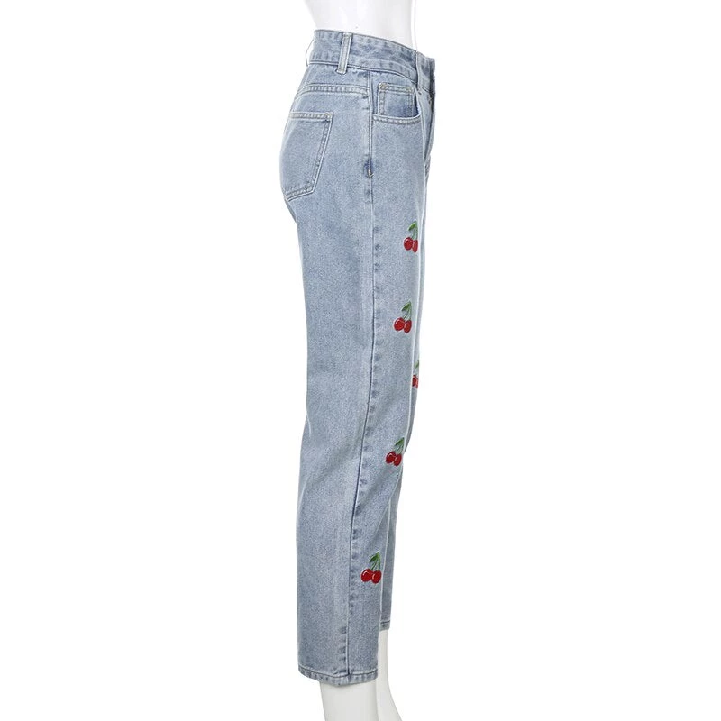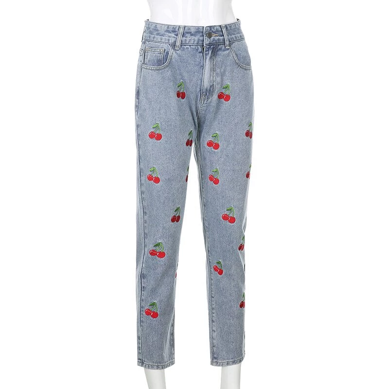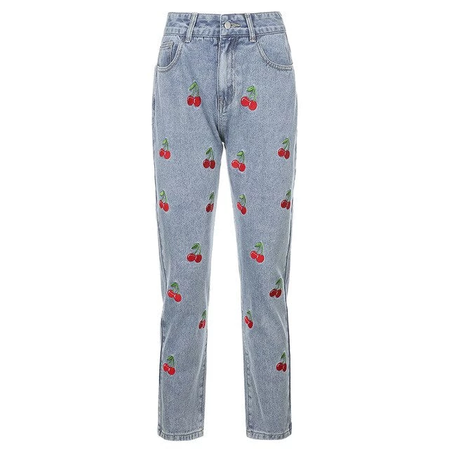Slim fit midwash blue denim jeans with an embroidered all over front cherry design.