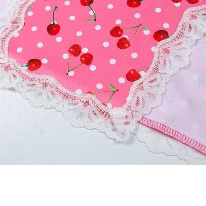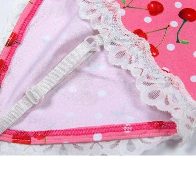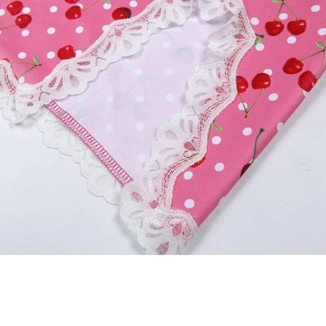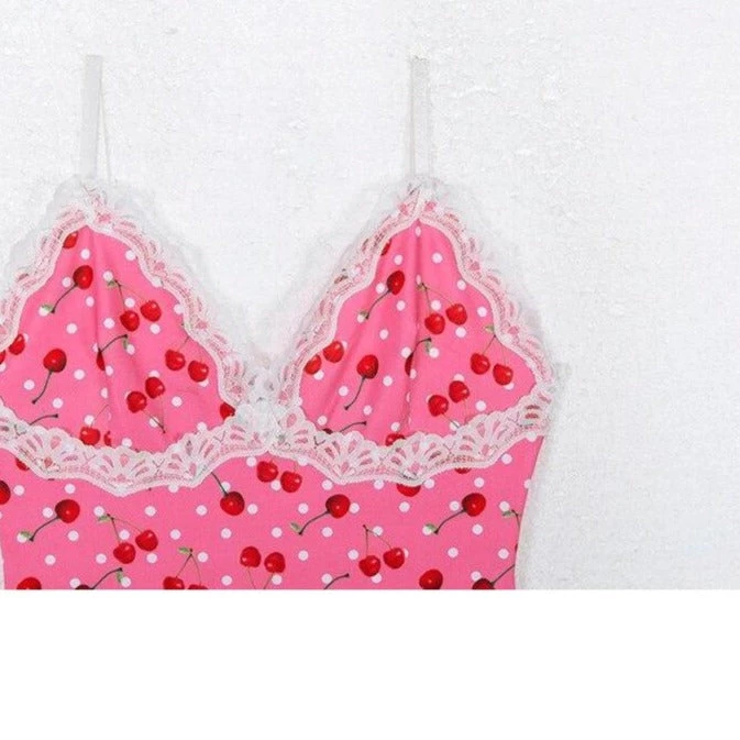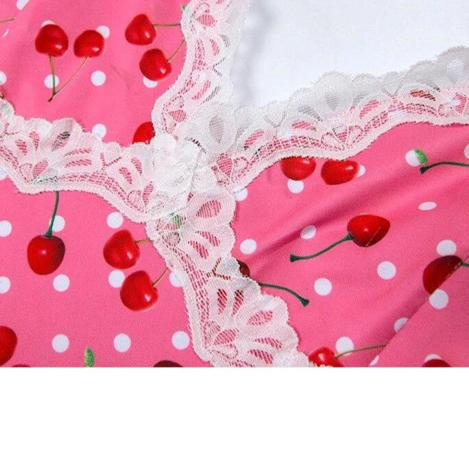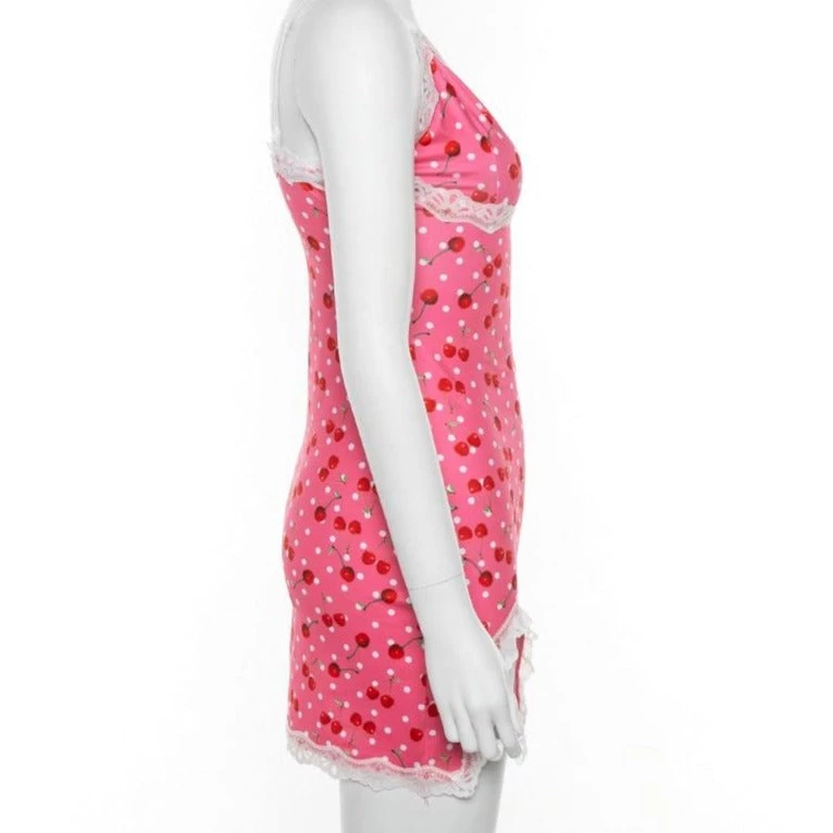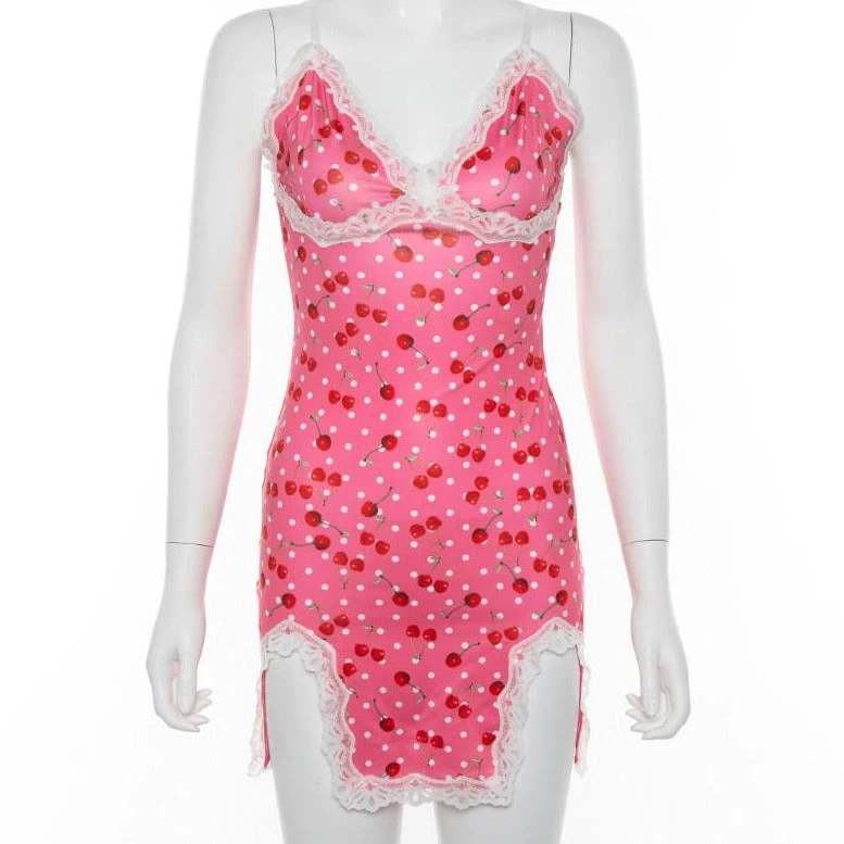 Vibrant pink and red cherry print lace negligee-style mini dress.