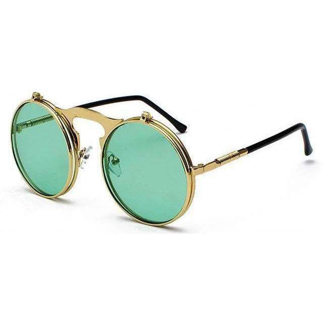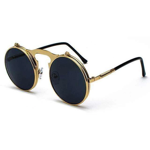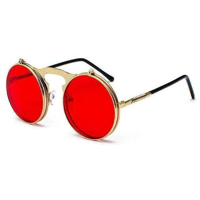 Steampunk-style round flip sunglasses with a coloured outer lens.