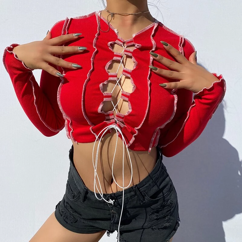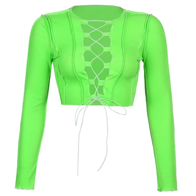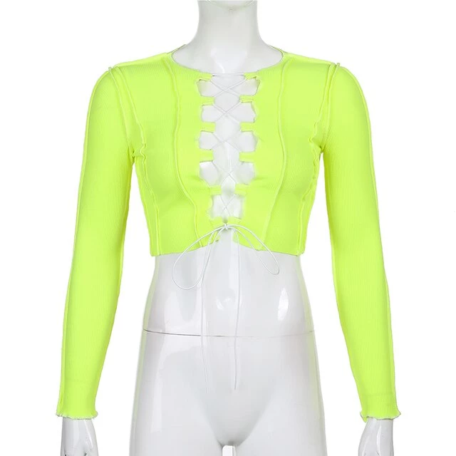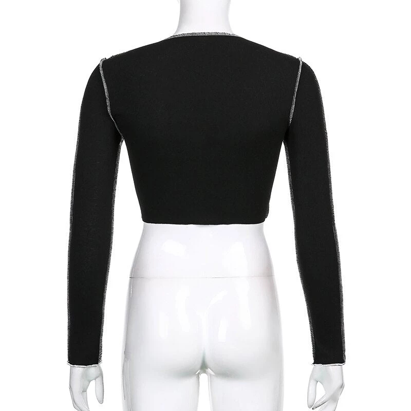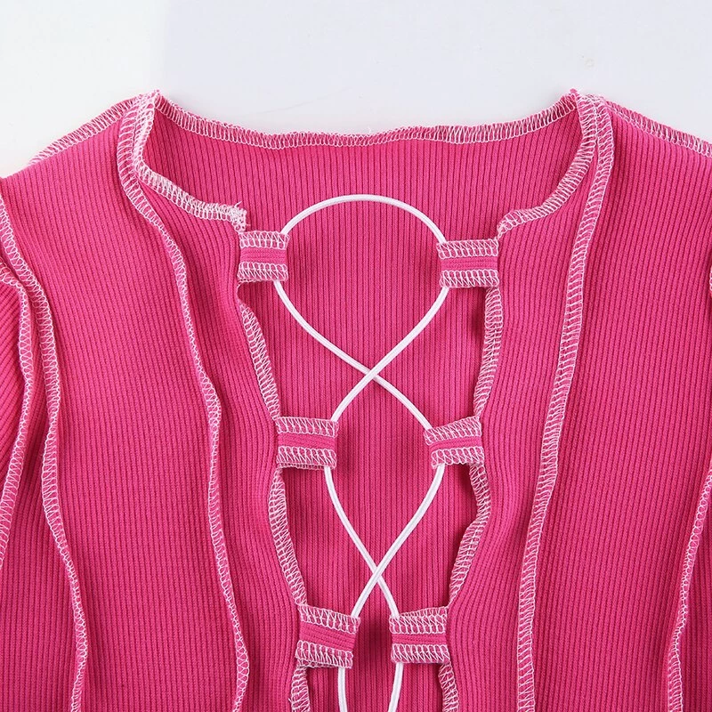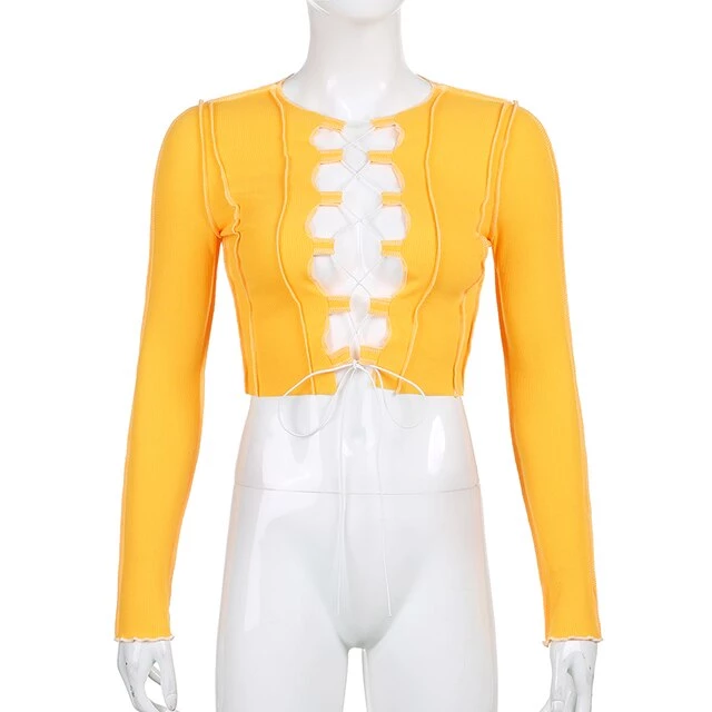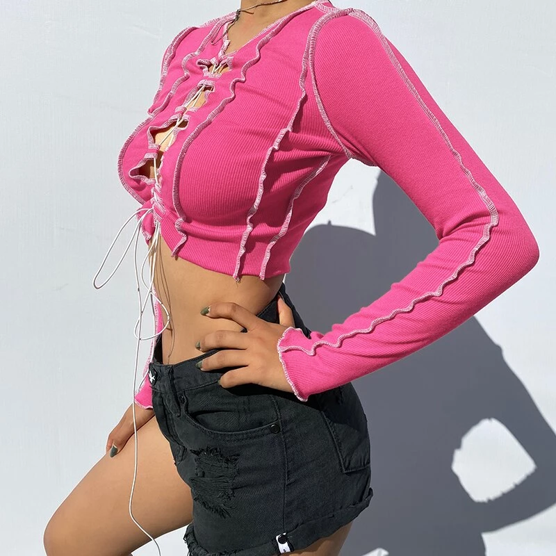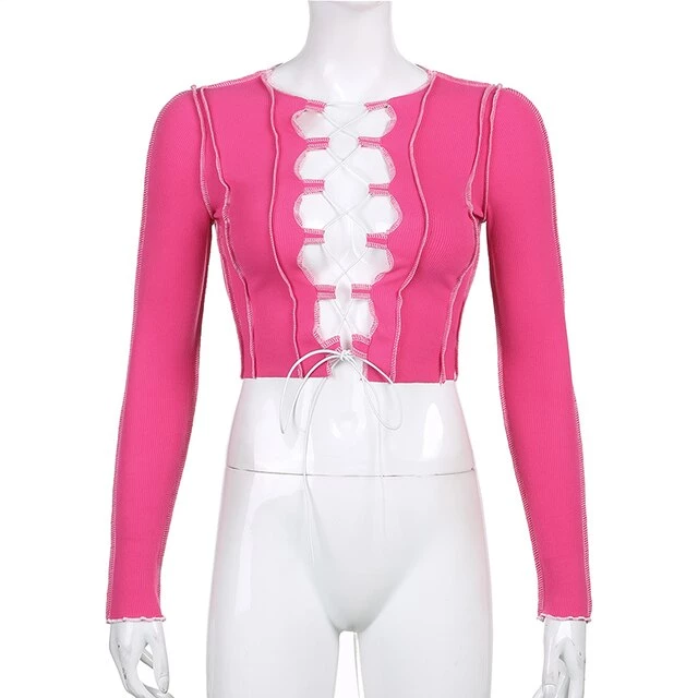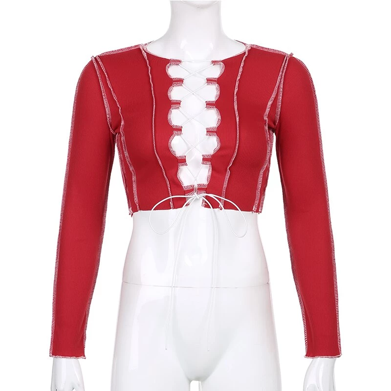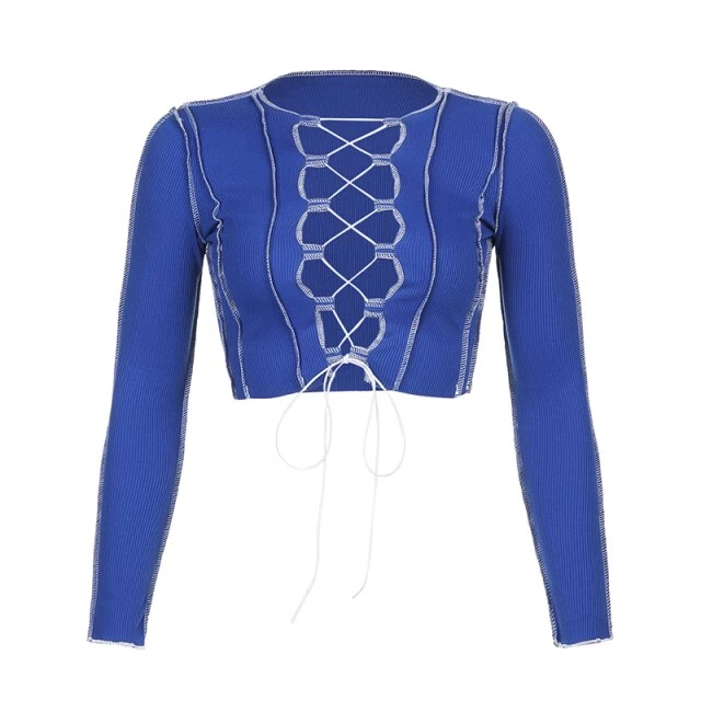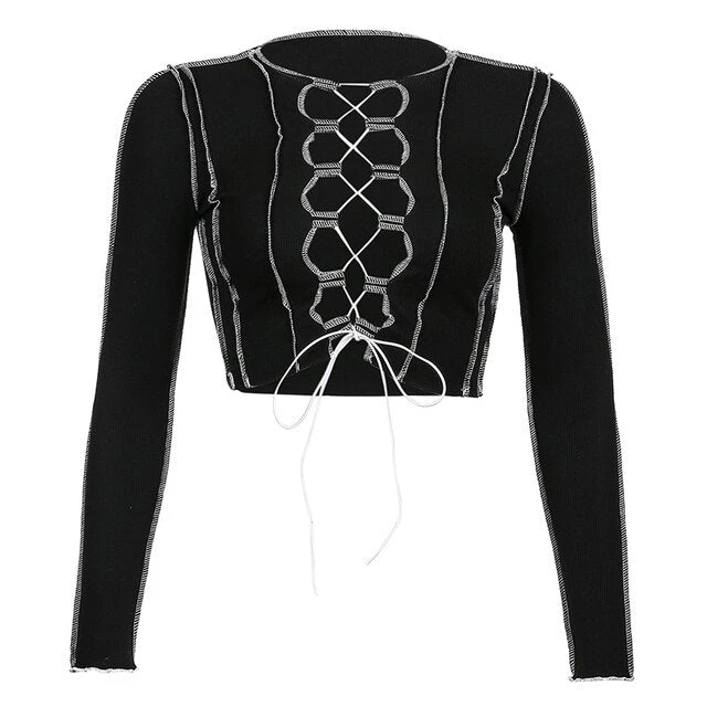 Long sleeved crop top with contrast stitching and a lace up centre design.