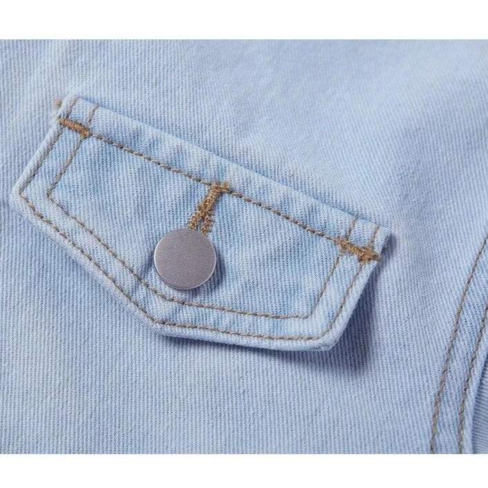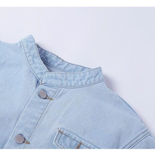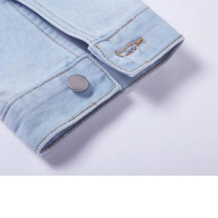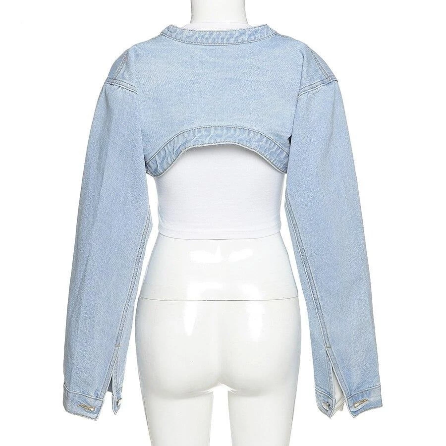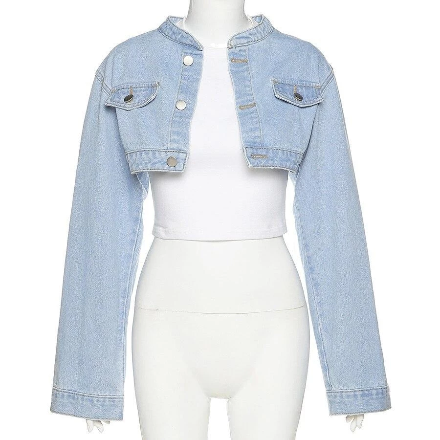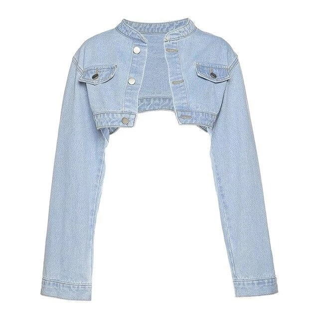 Light blue wash thin denim crop jacket with wide sleeves.
