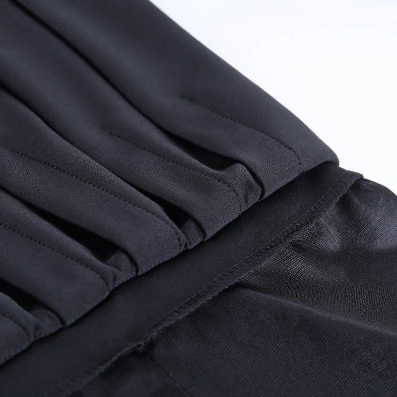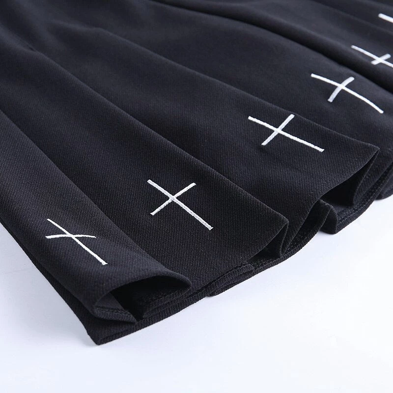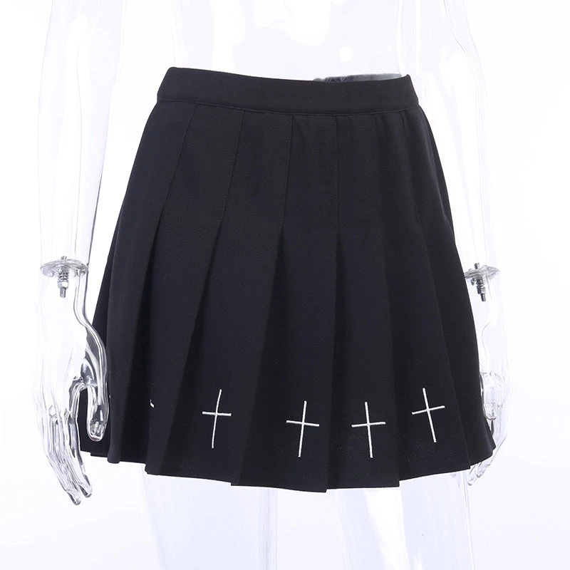 Black pleated mini skirt with a white embroidered cross design.