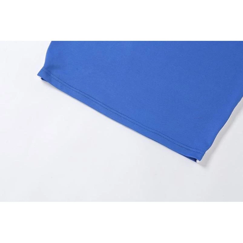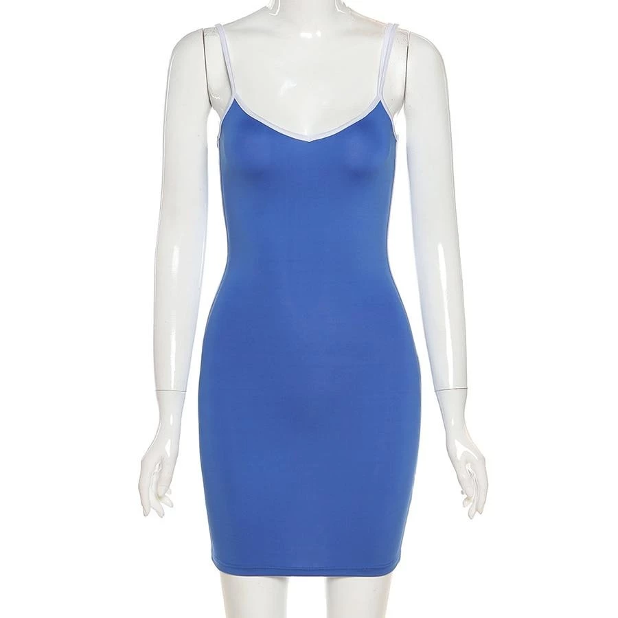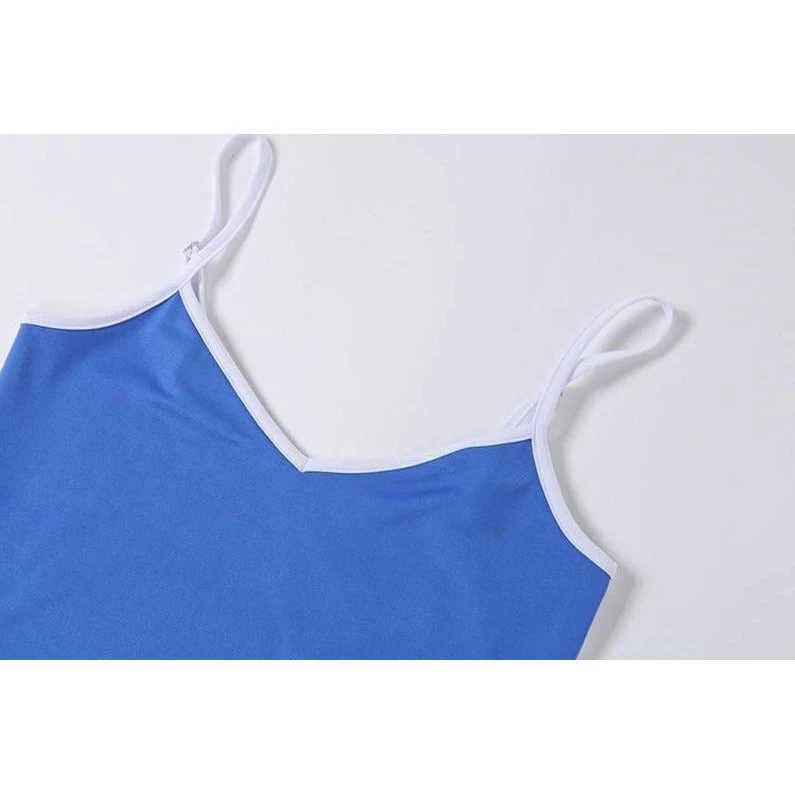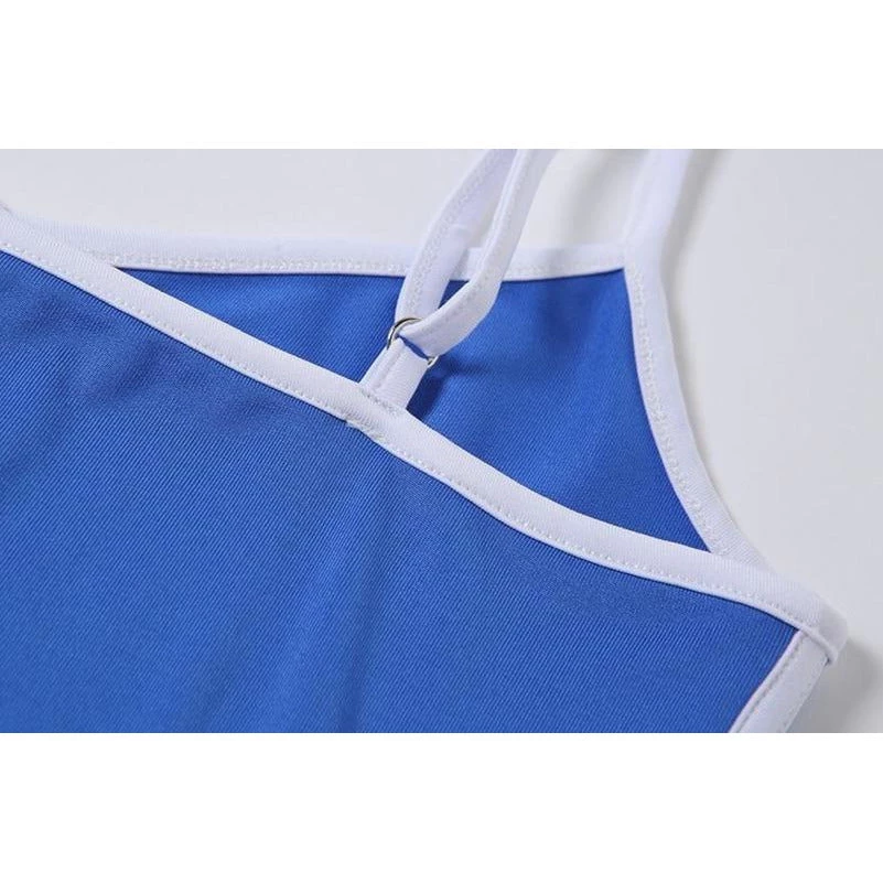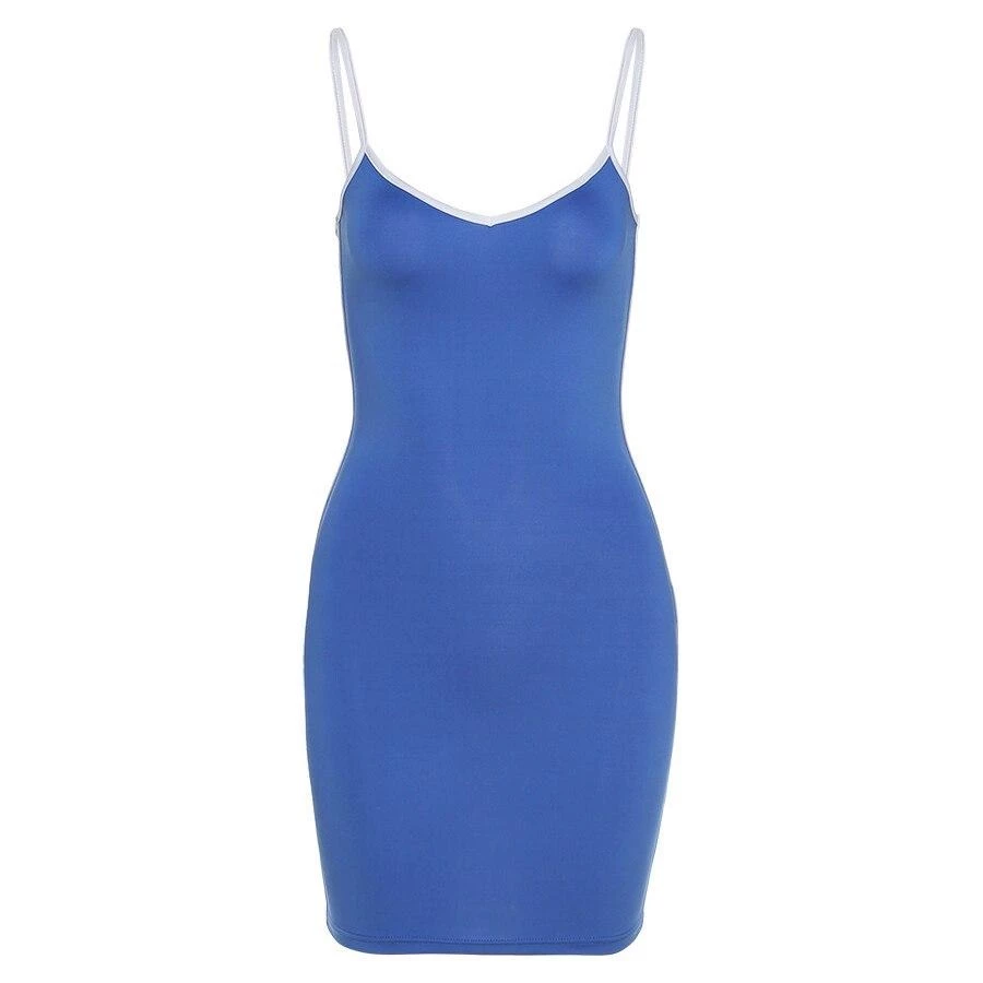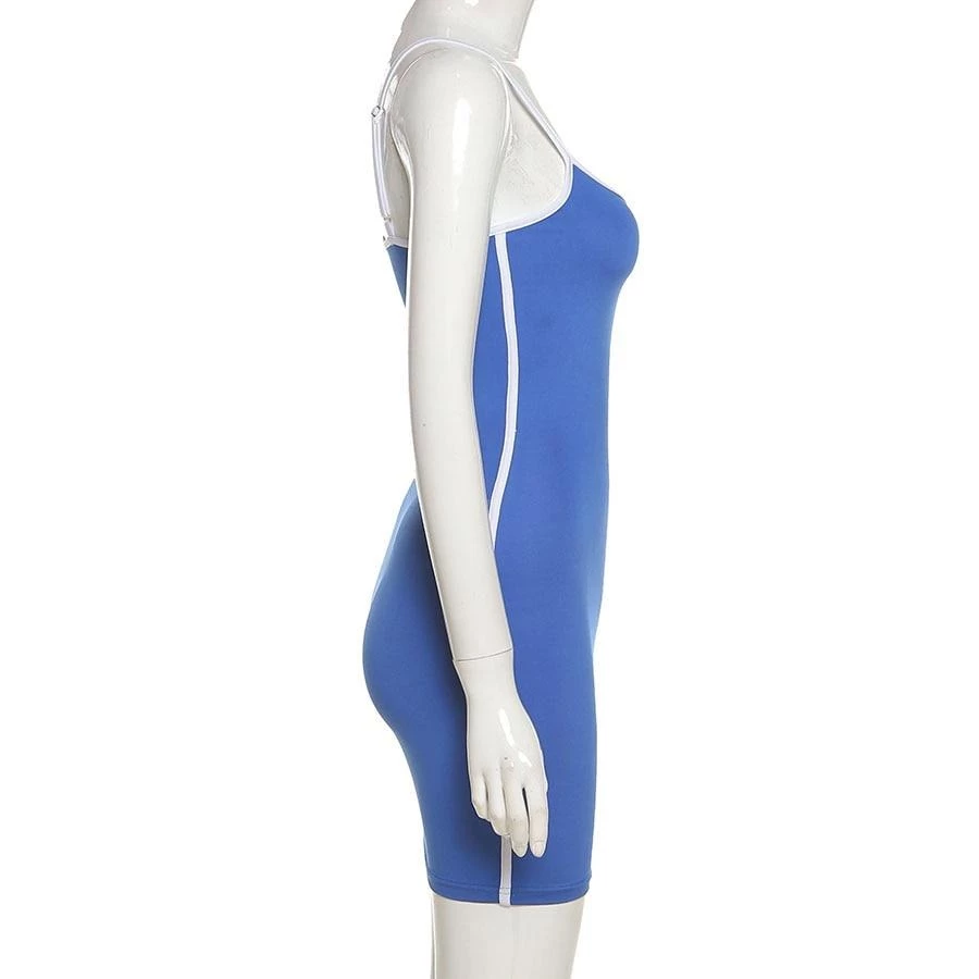 Blue mini dress with a white trim, white spaghetti straps and white side stripe.