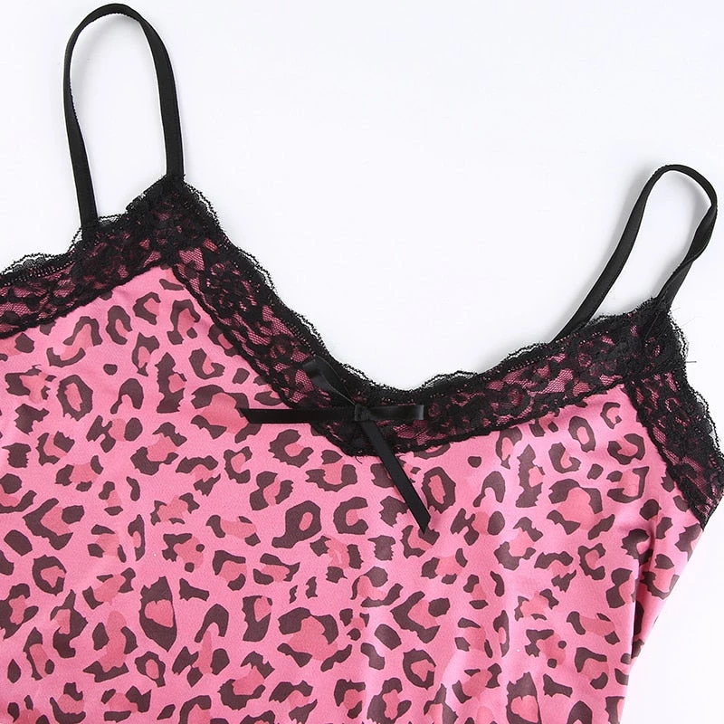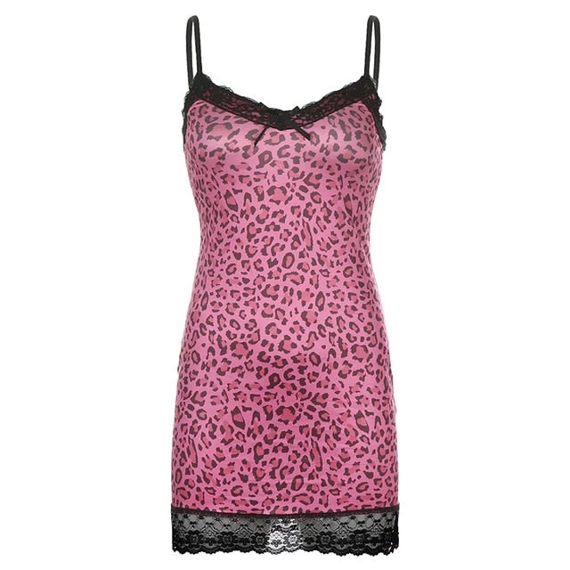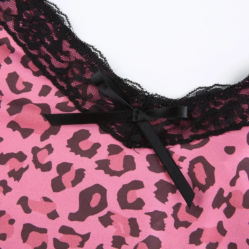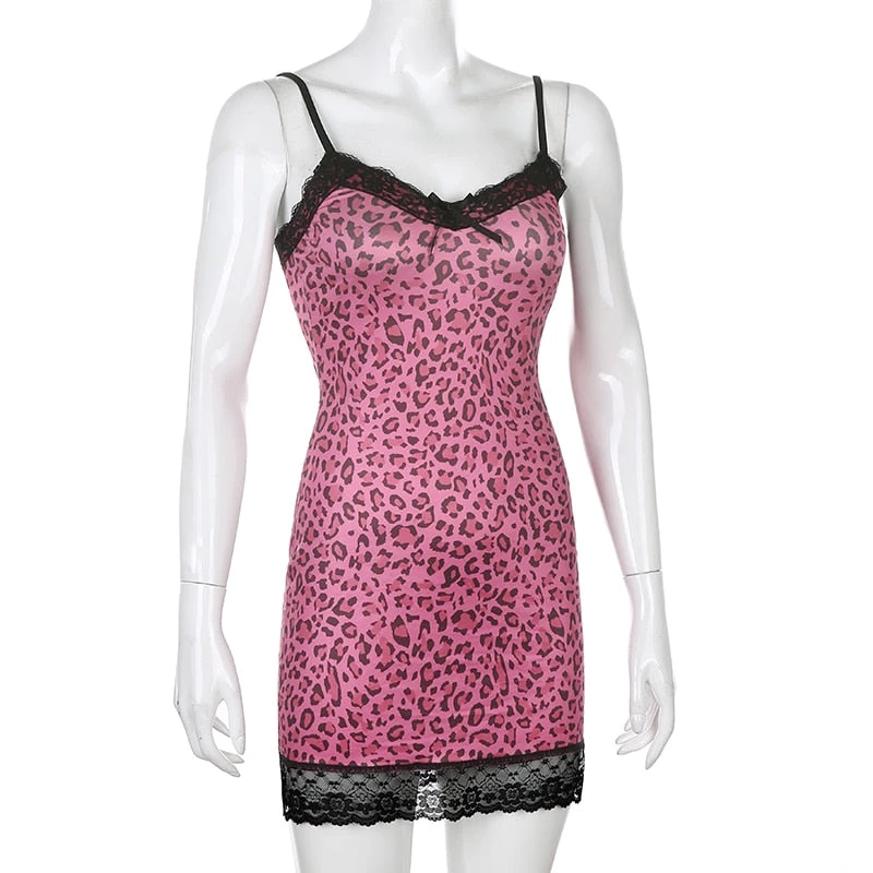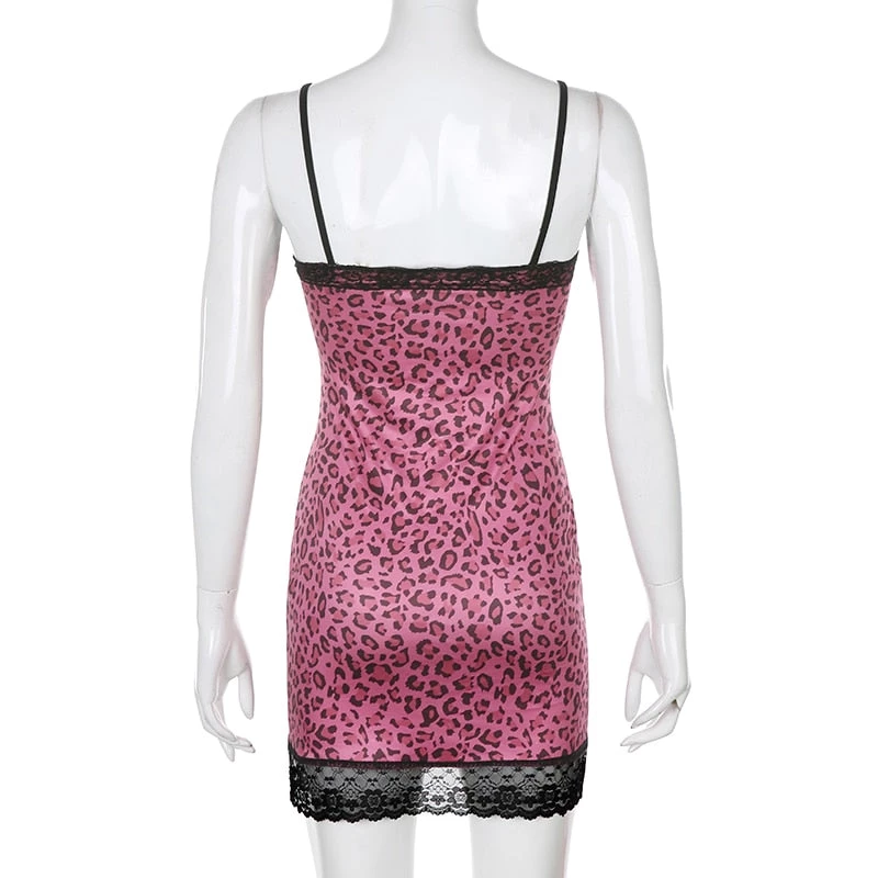 Burgundy leopard print underwear as outerwear-style mini dress with a black lace frilled hemline.