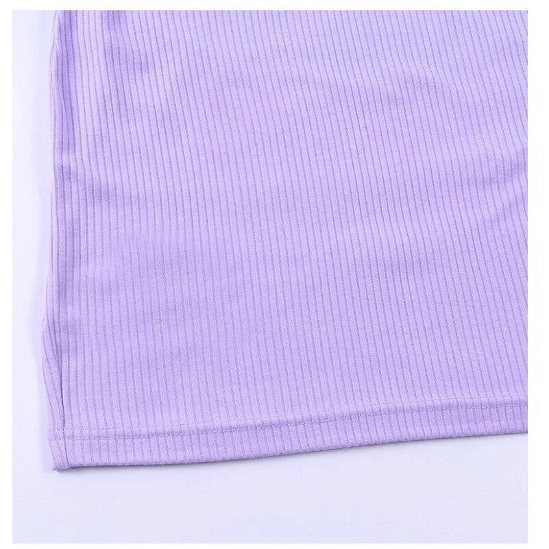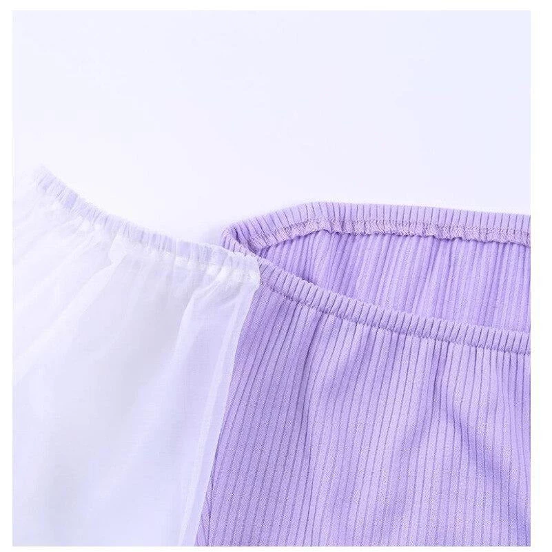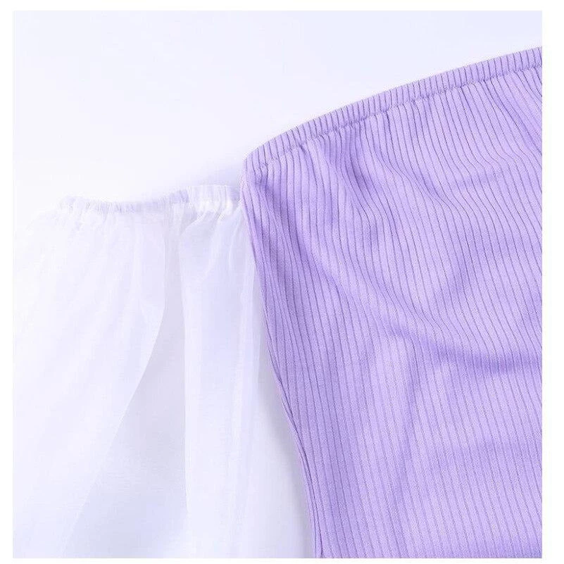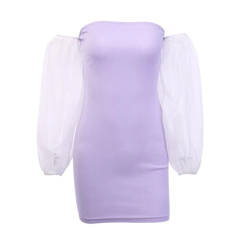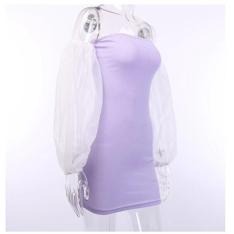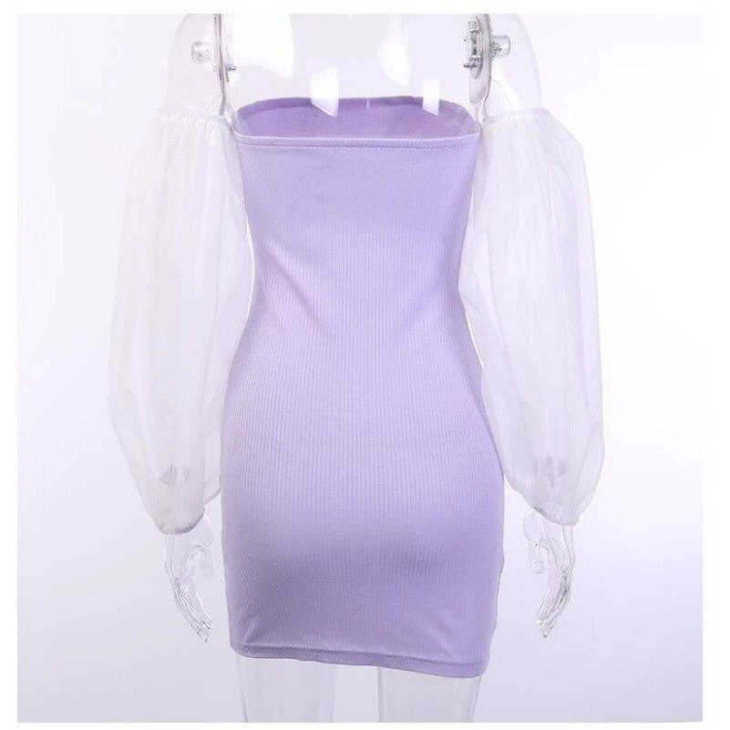 Purple bodycon mini dress with transparent mesh puff sleeves.