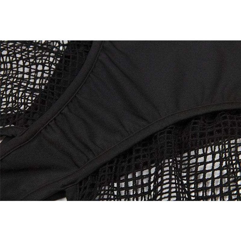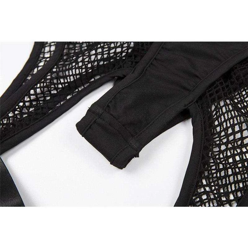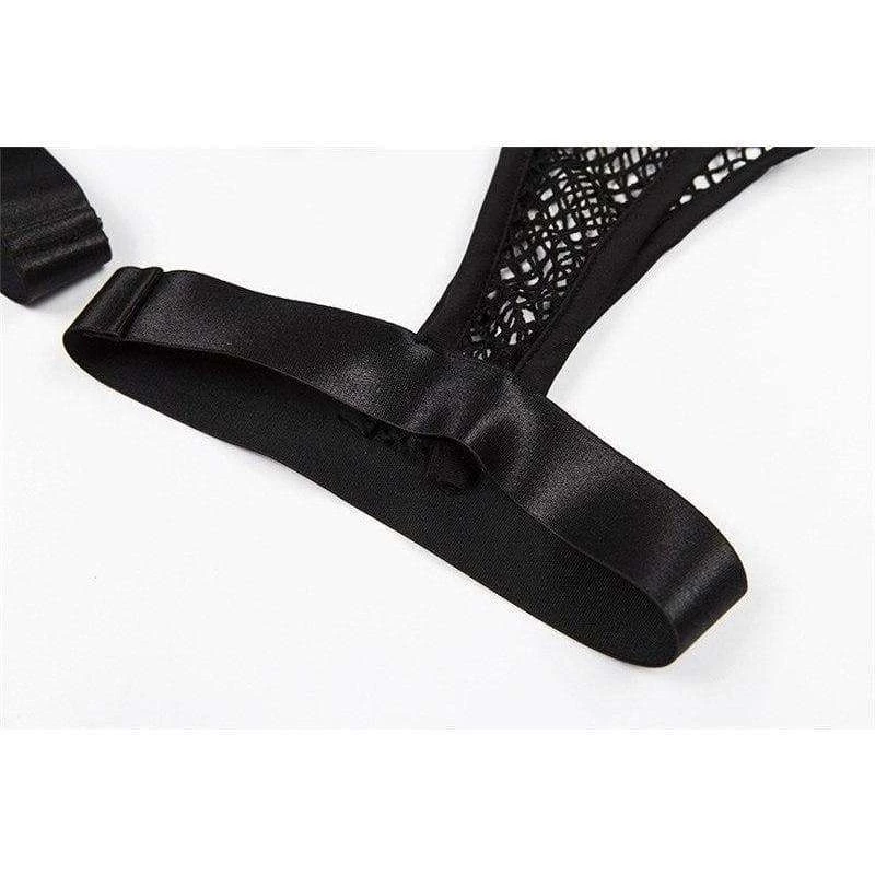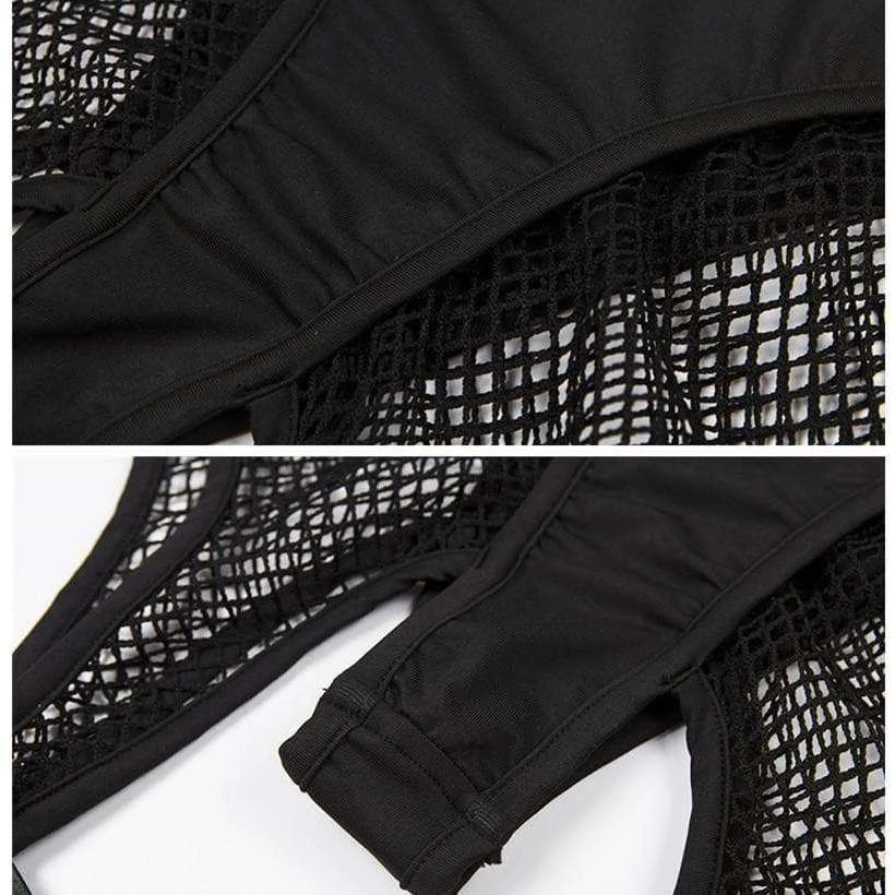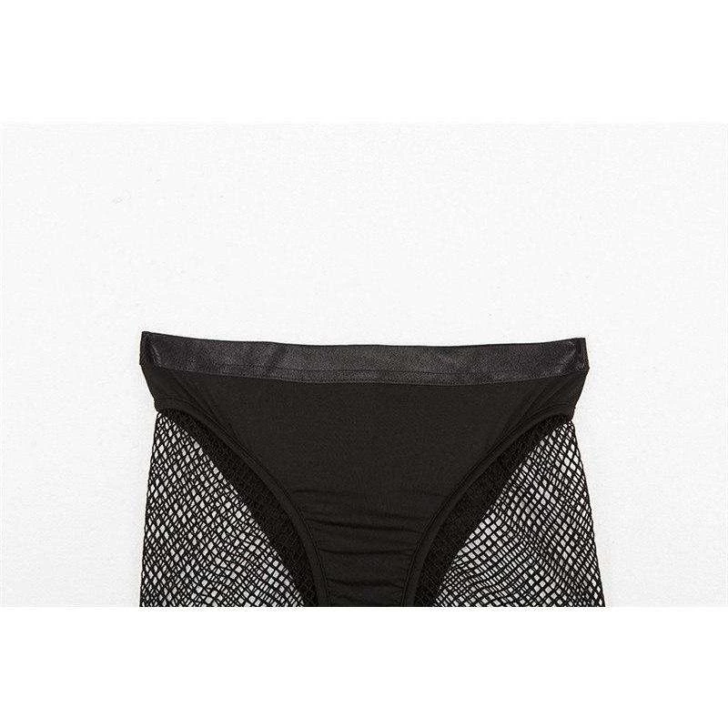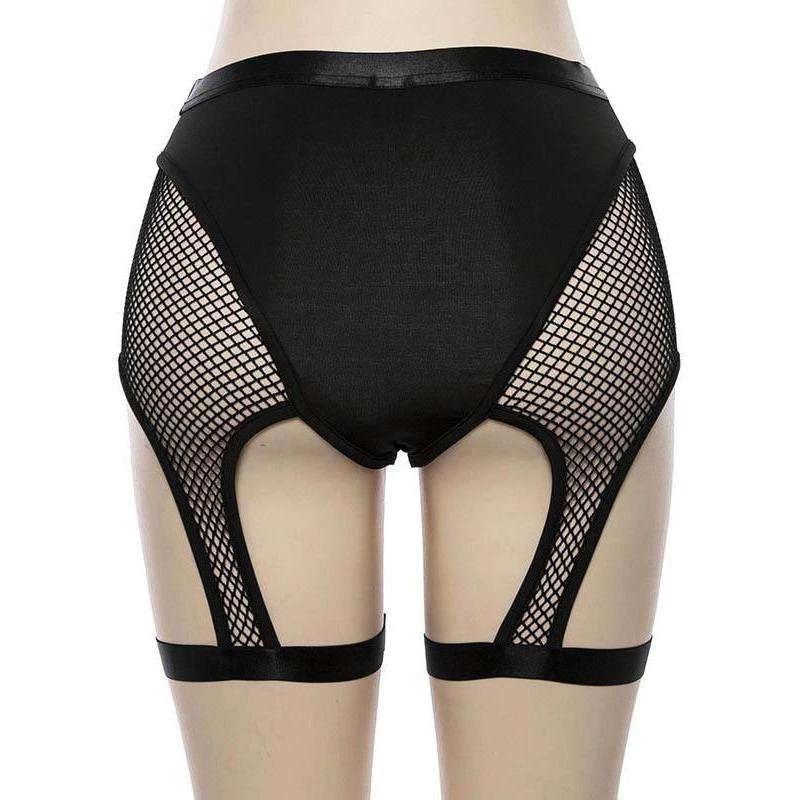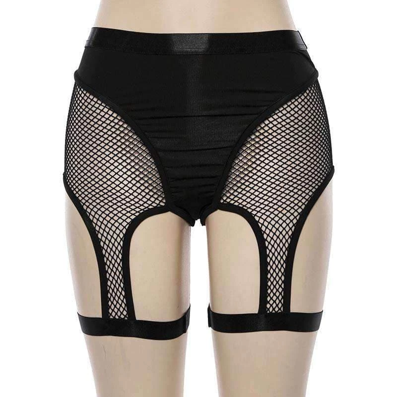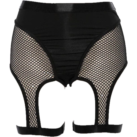 Black stretch thong briefs with fishnet shorts and suspender design.