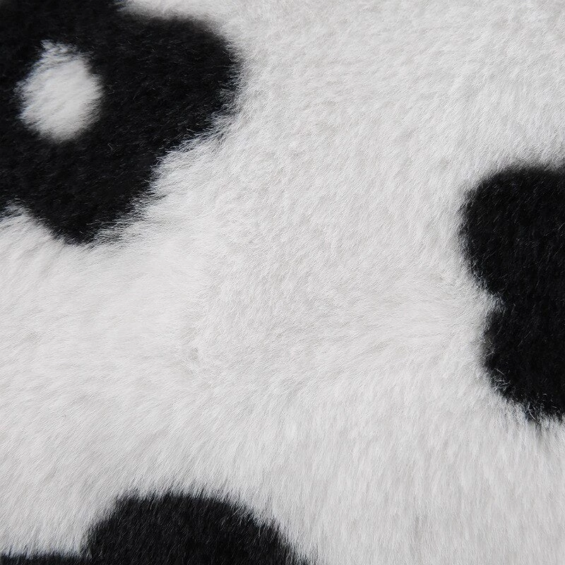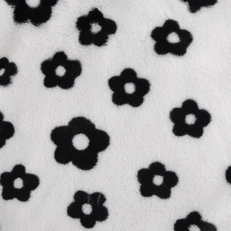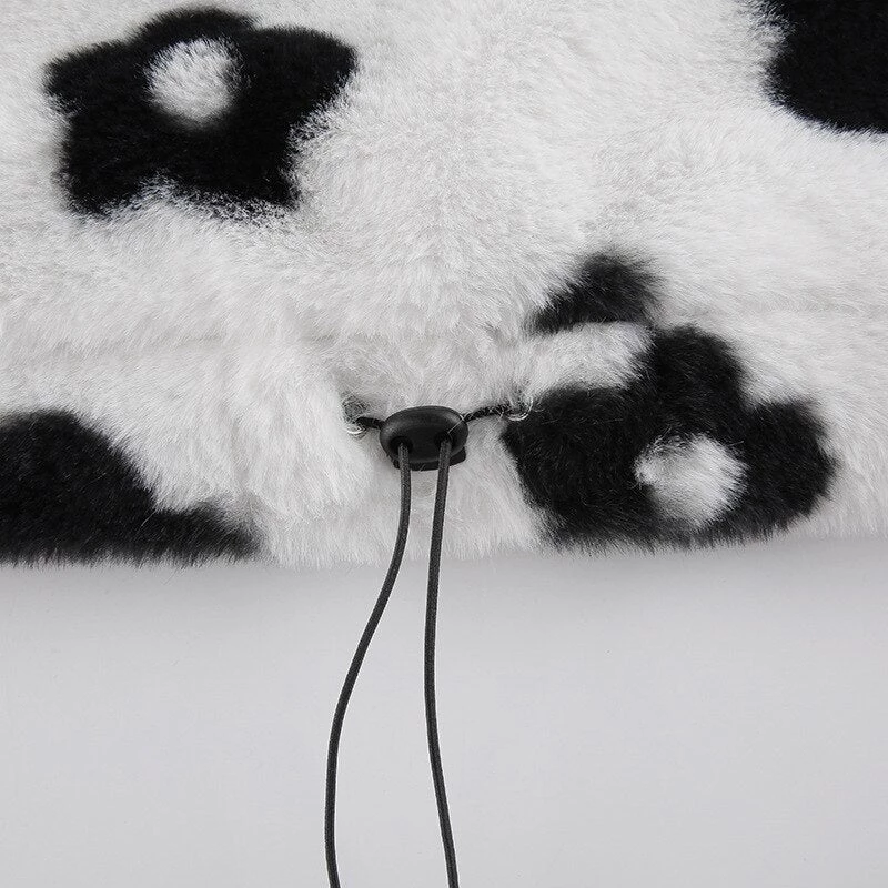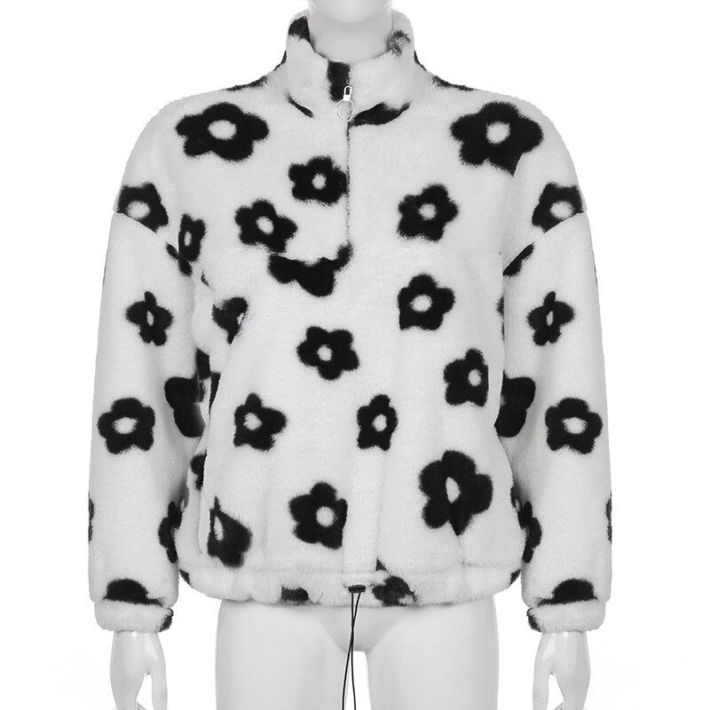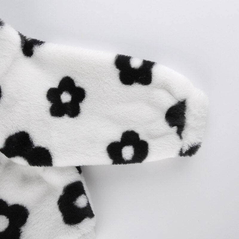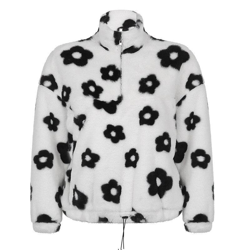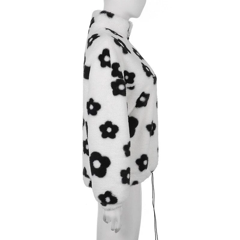 White fuzzy fur fur zip up sweatshirt with a black all flower floral design and drawstring hemline.