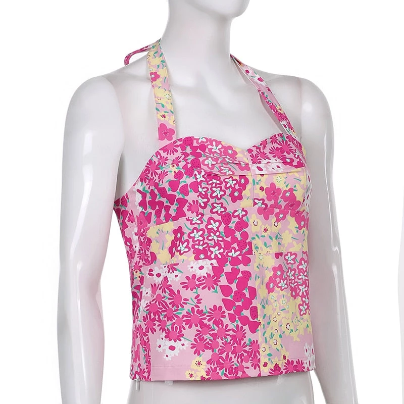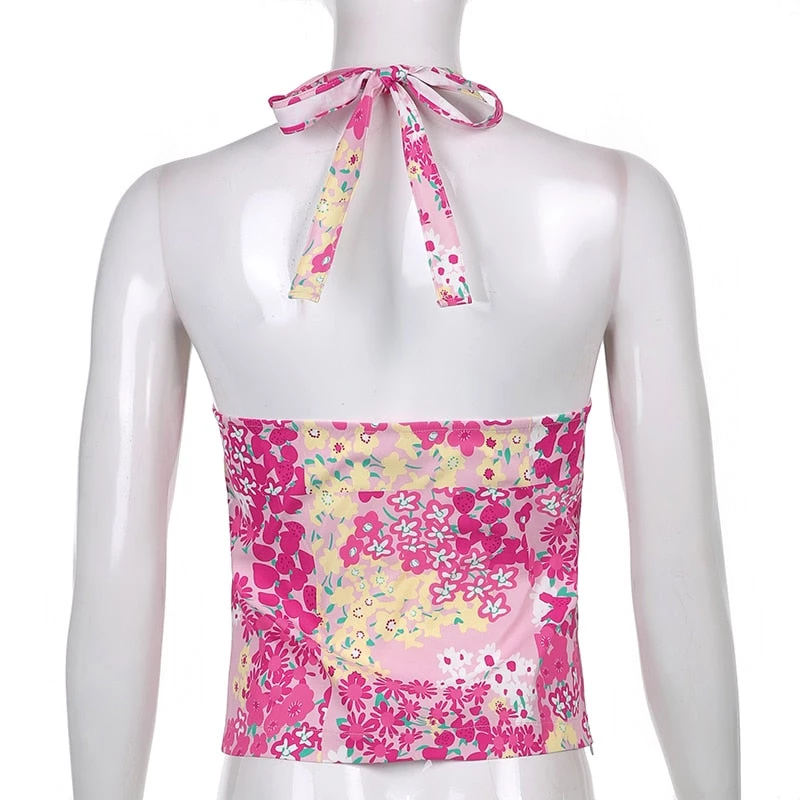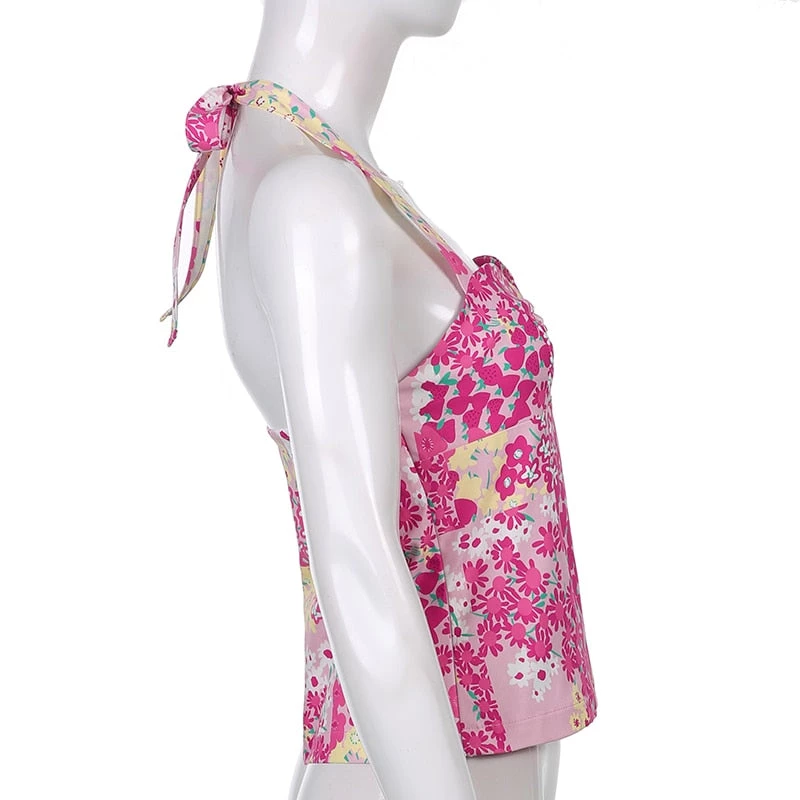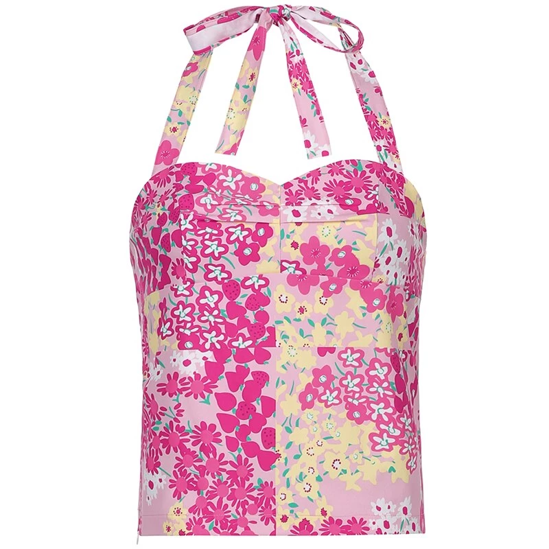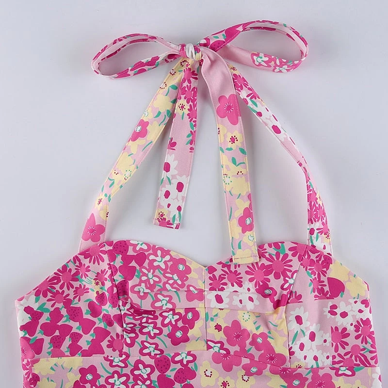 Pink and yellow floral print tie up halter top.