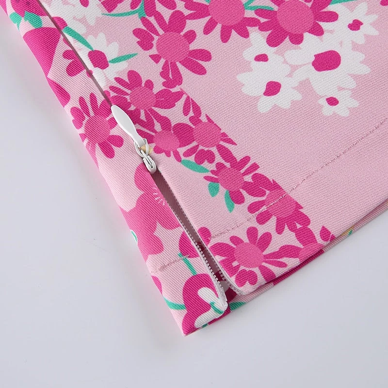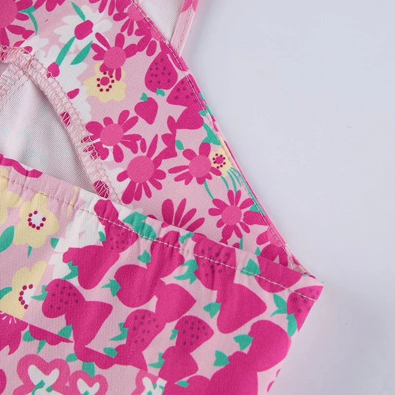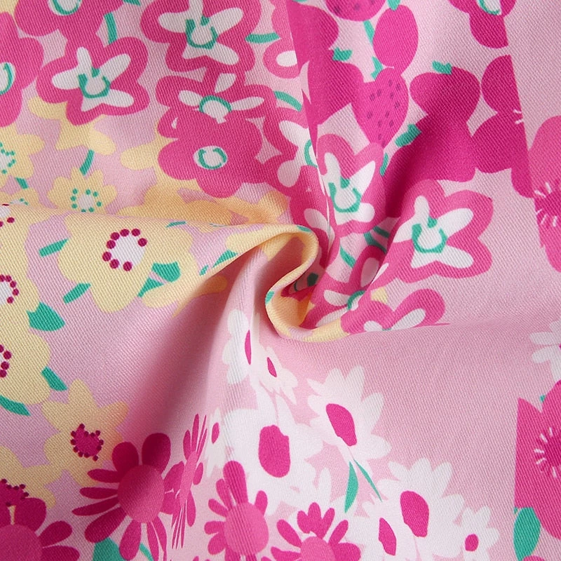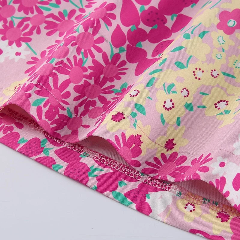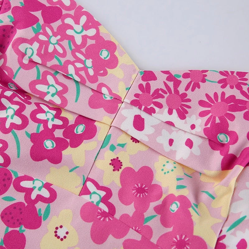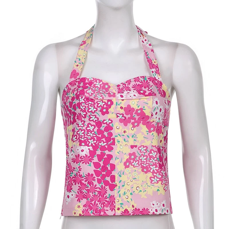 Pink and yellow floral print tie up halter top.