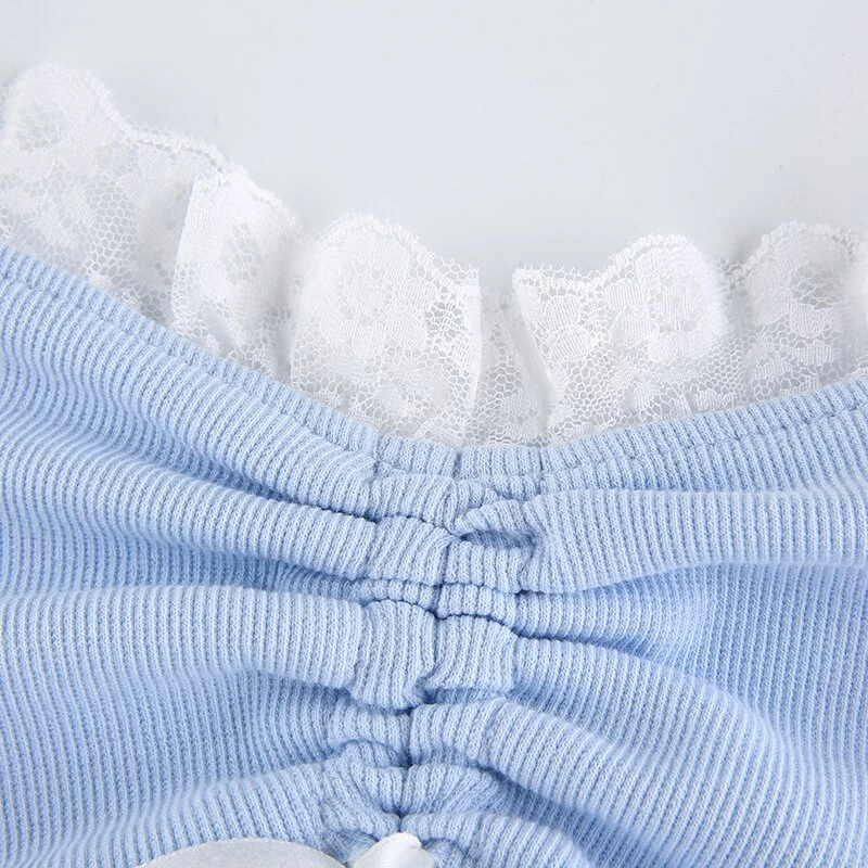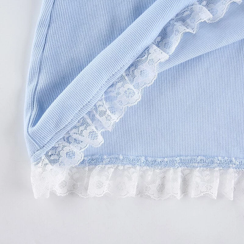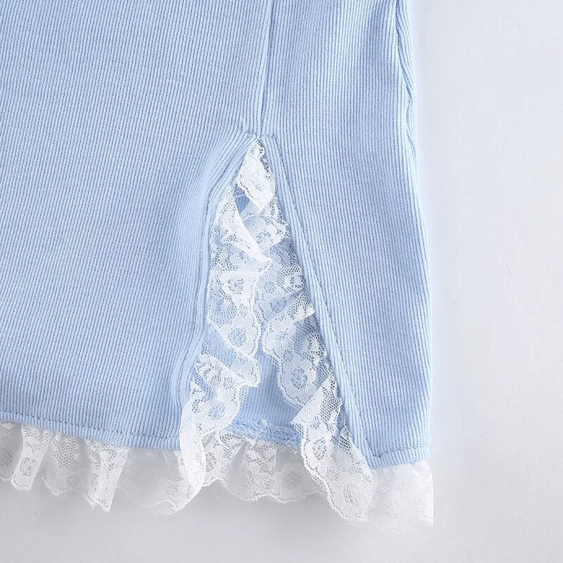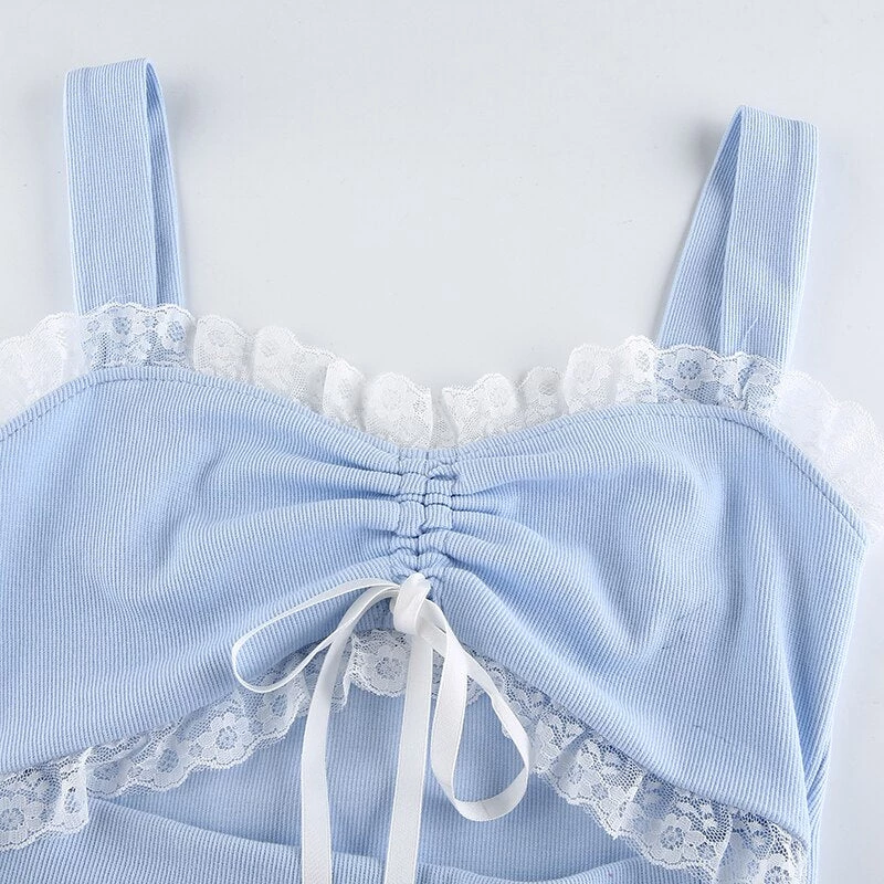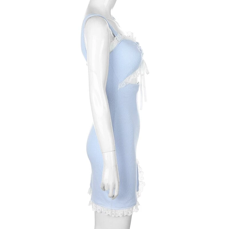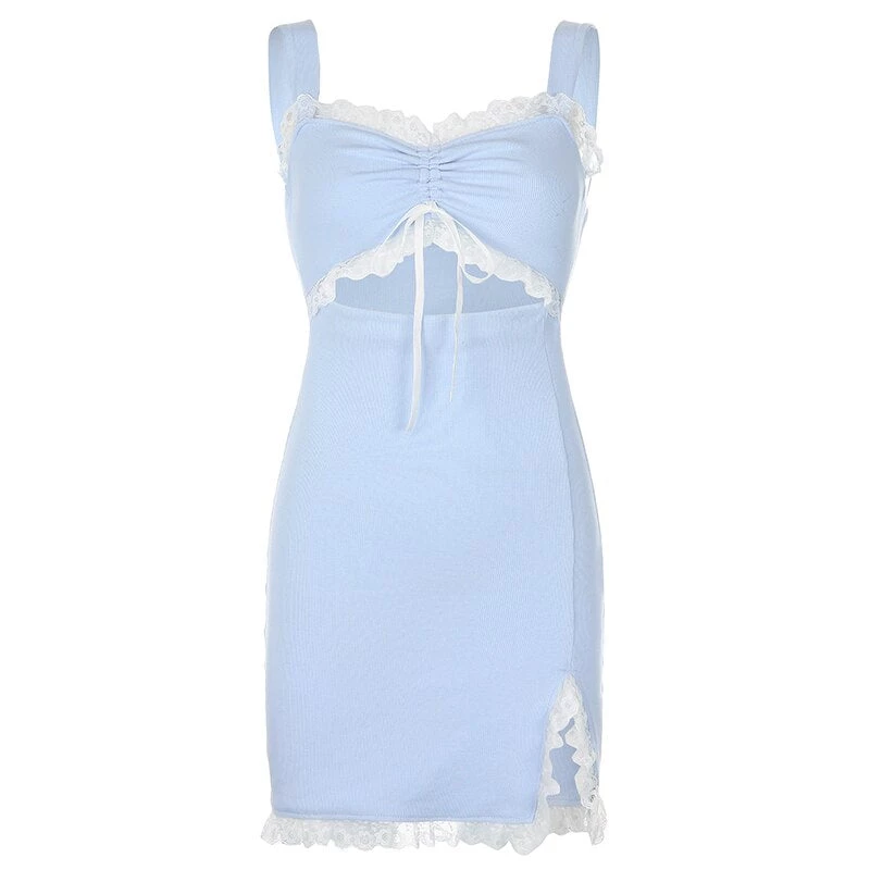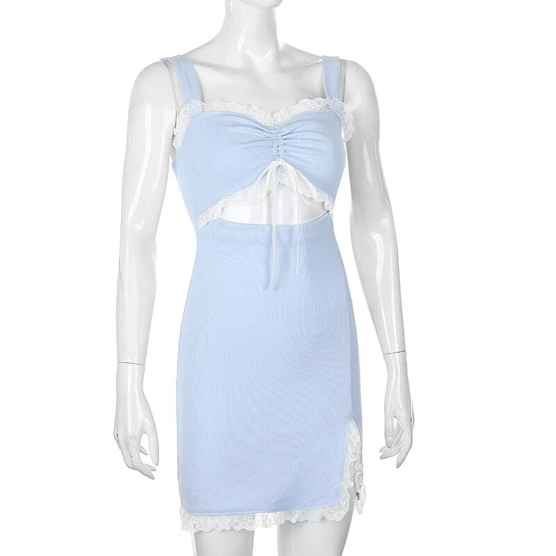 Light blue mini dress with a ruched bust, white frill trim, side split and centre cut out.