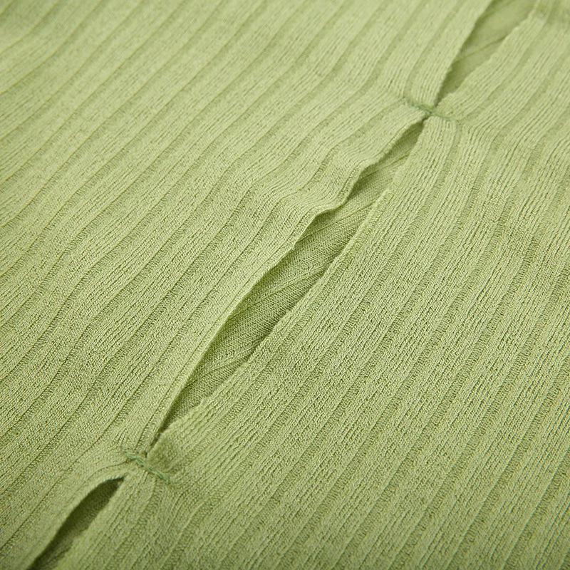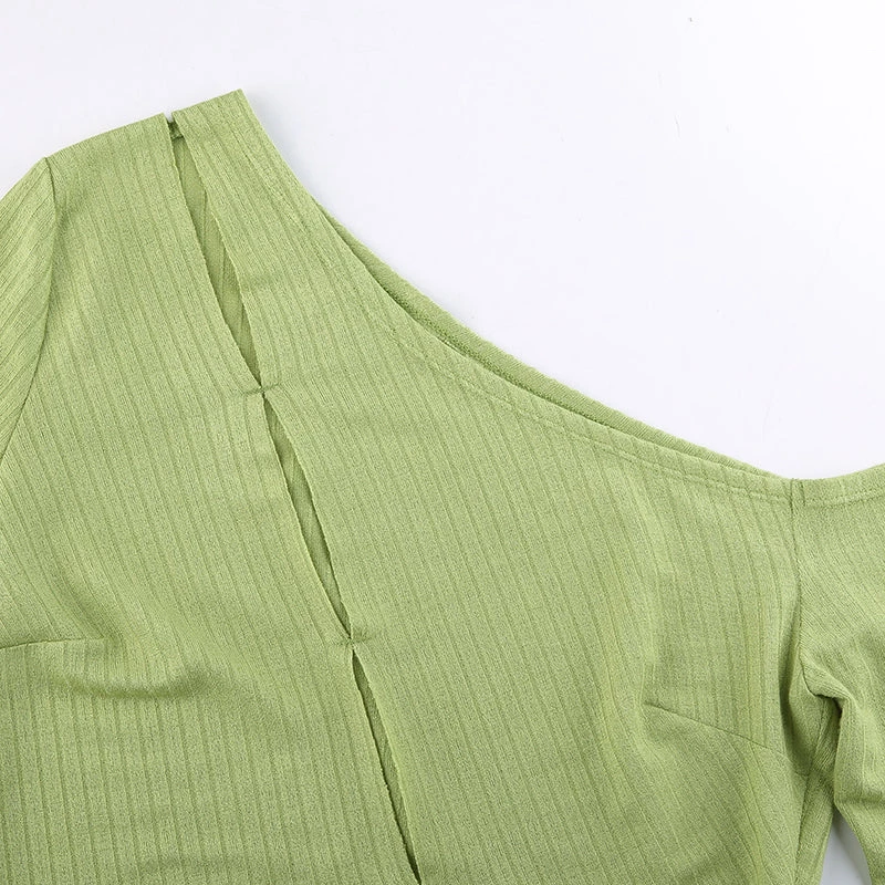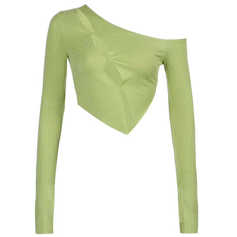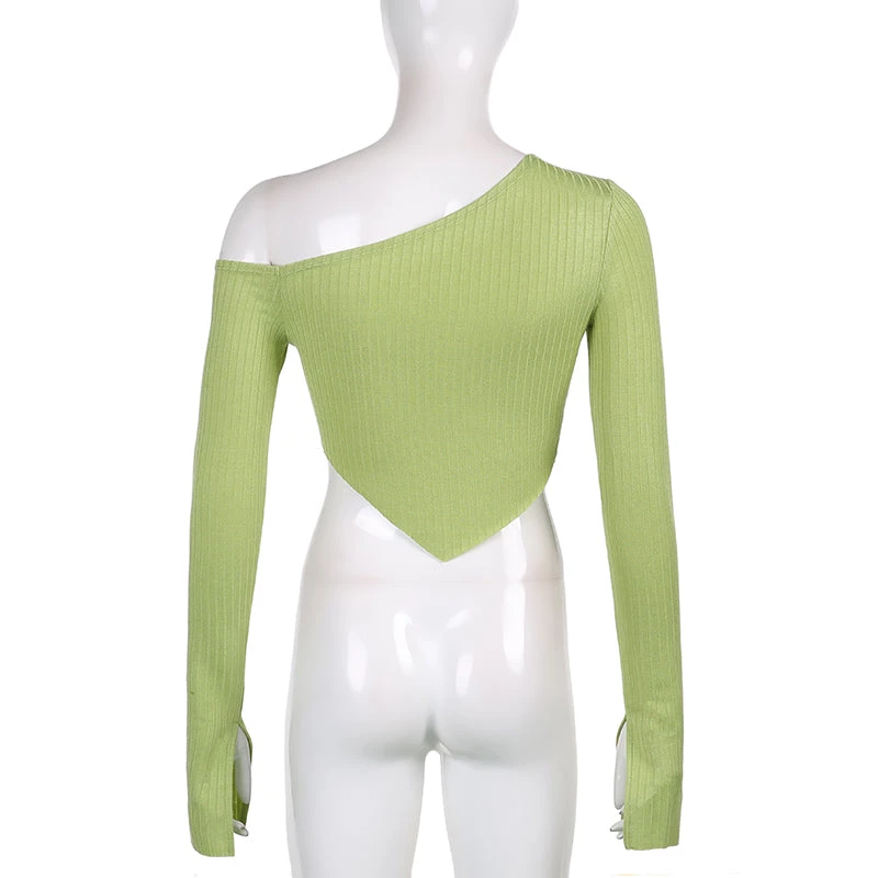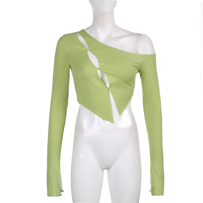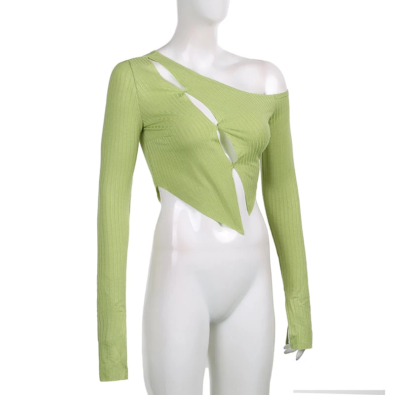 Green ribbed cold shoulder point crop top with sliced cuffs and a peekaboo design.