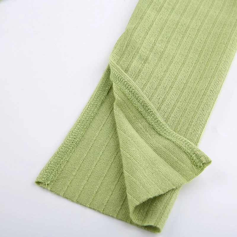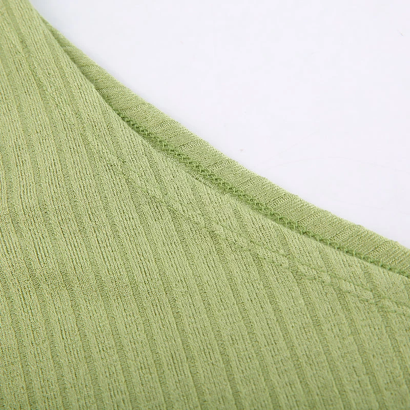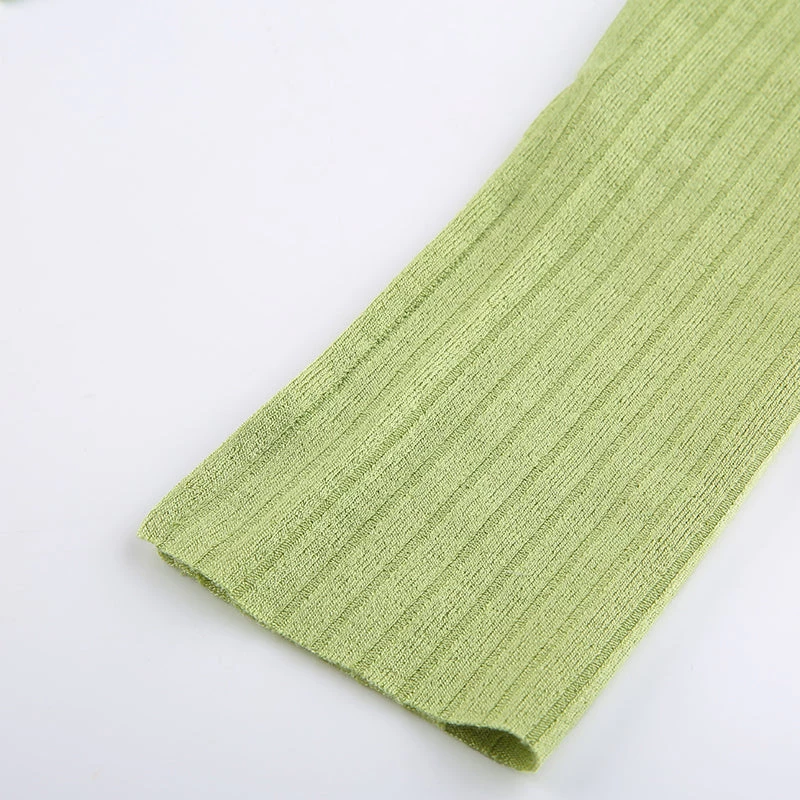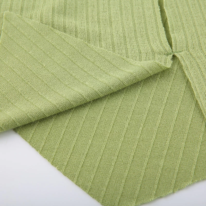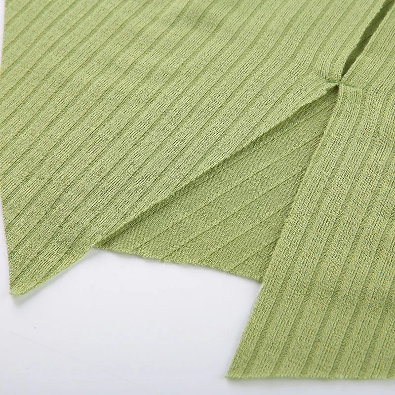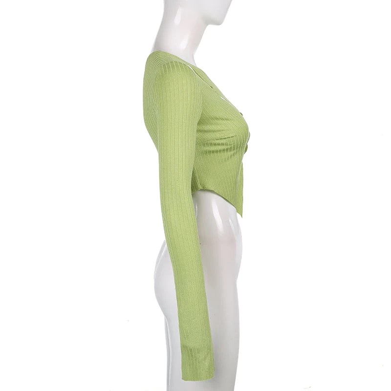 Green ribbed cold shoulder point crop top with sliced cuffs and a peekaboo design.