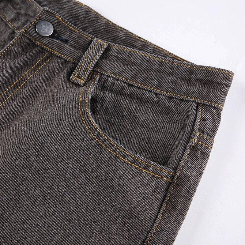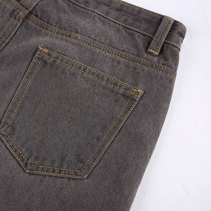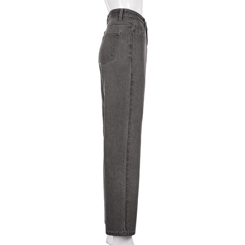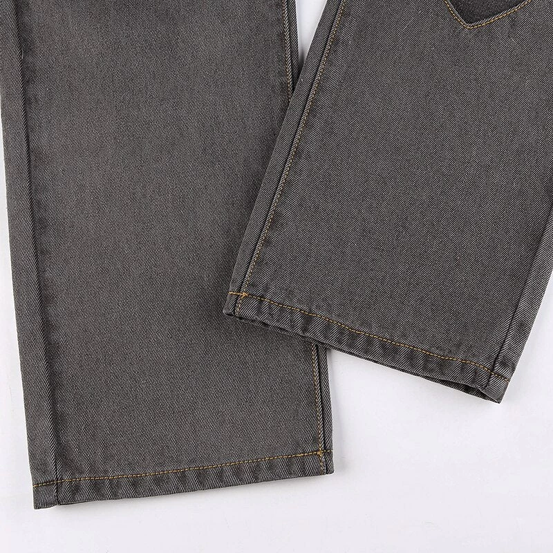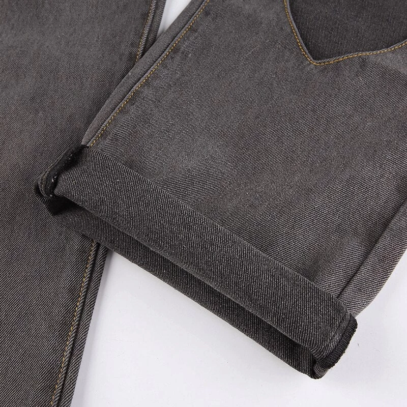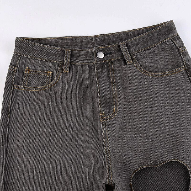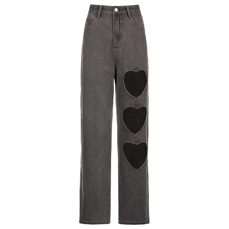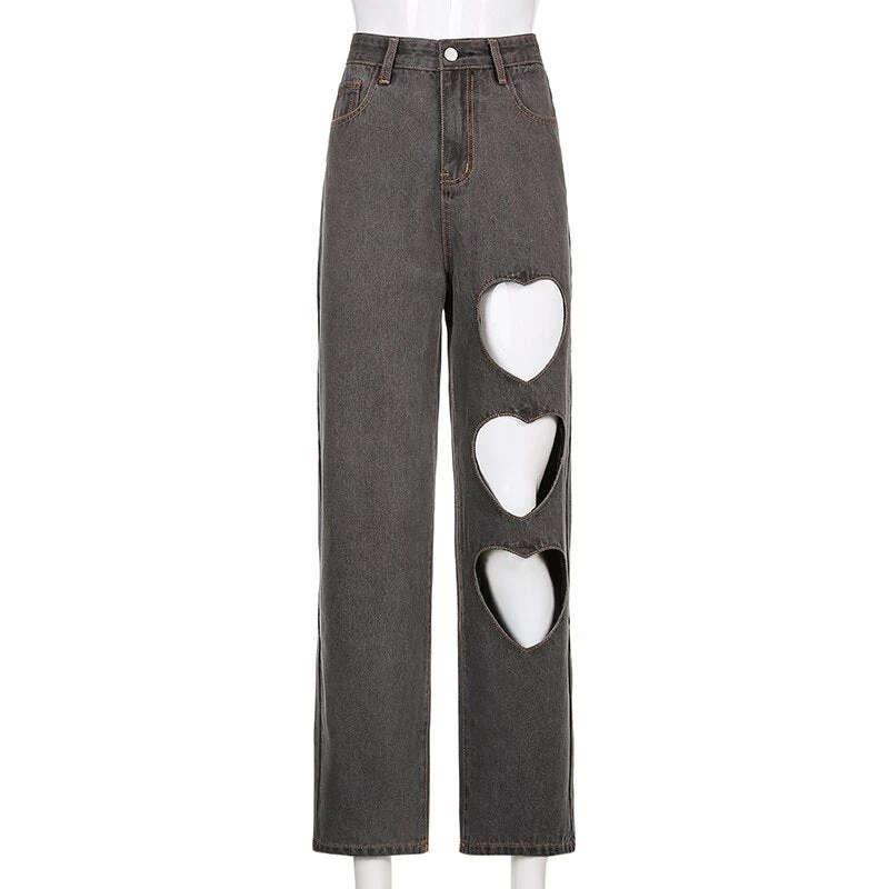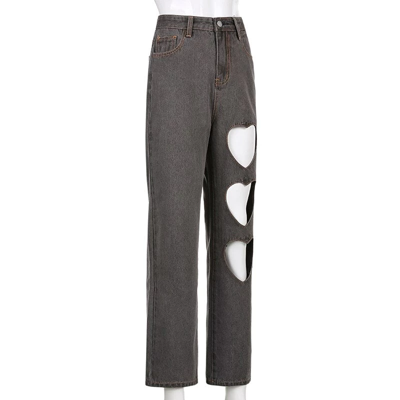 Washed out black/grey regular fit jeans with a three large heart cut out design on the left leg.