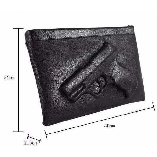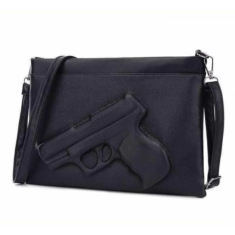 Black clutch back with a 3D gun design and long shoulder strap.