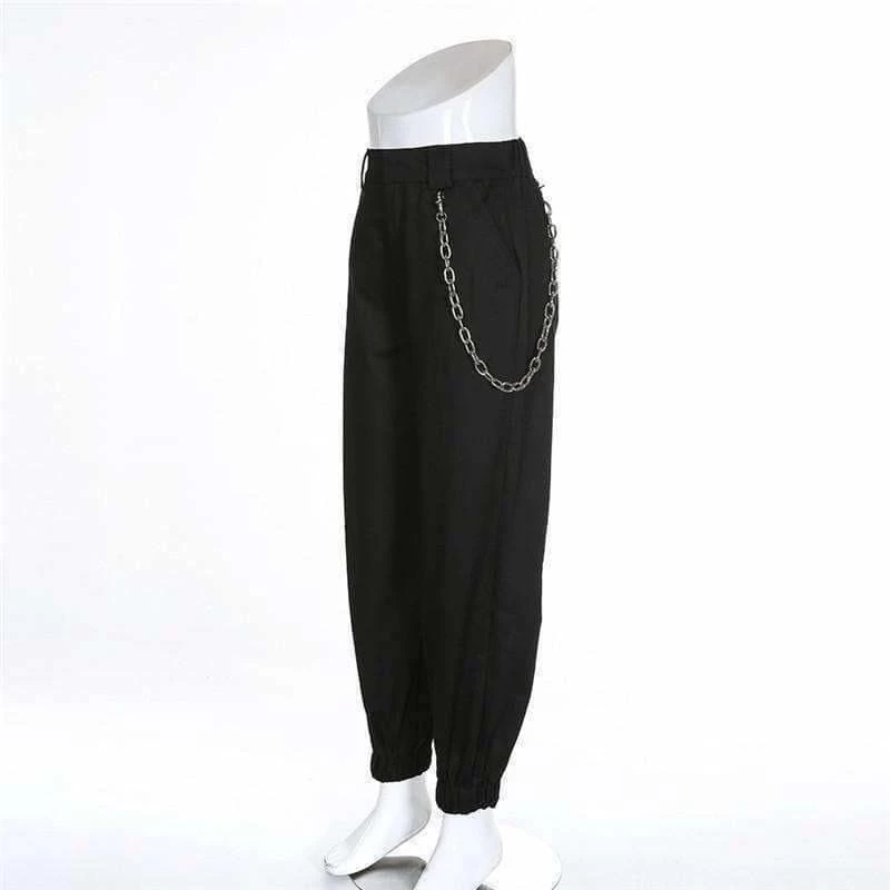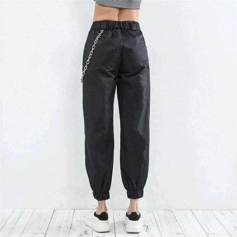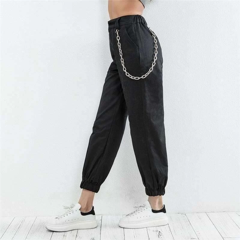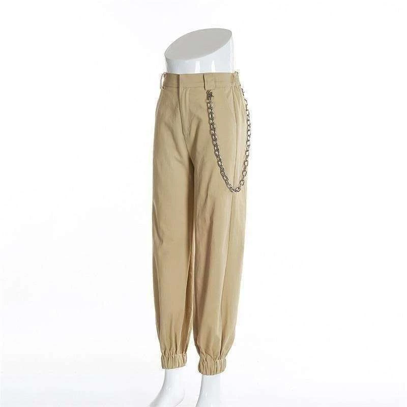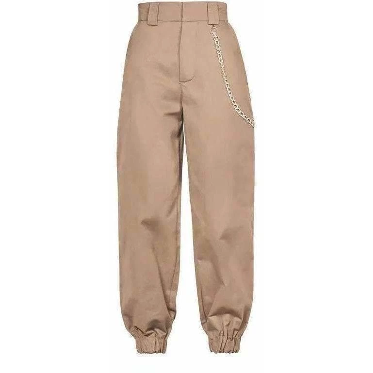 Casual trousers with an elasticated cuff hem and chain decoration.