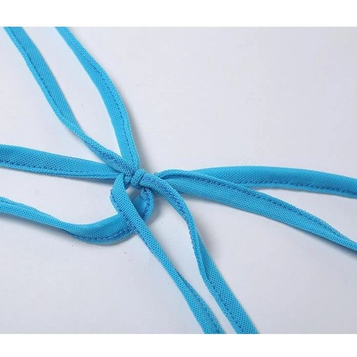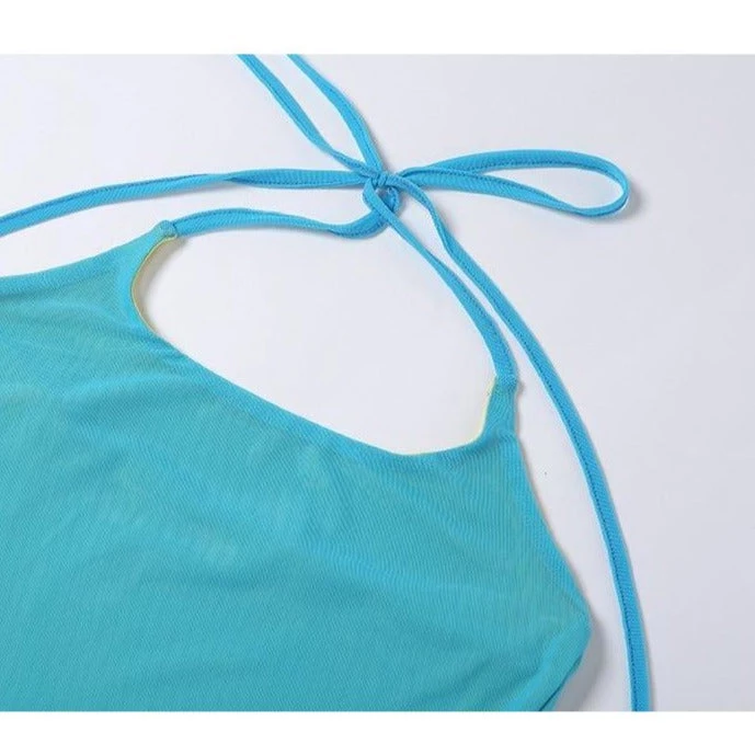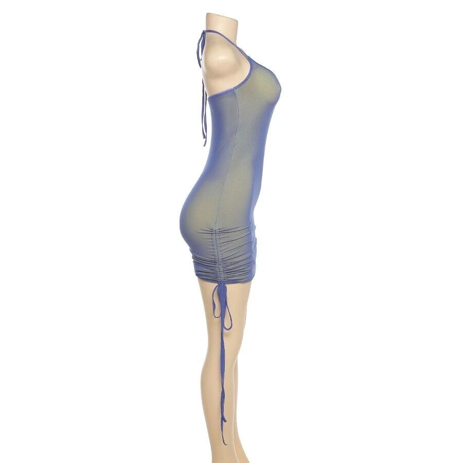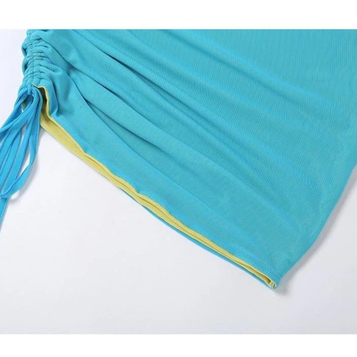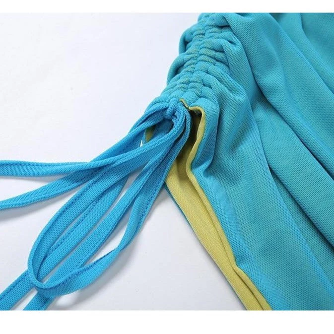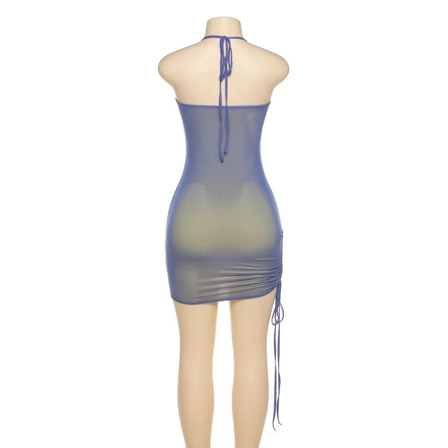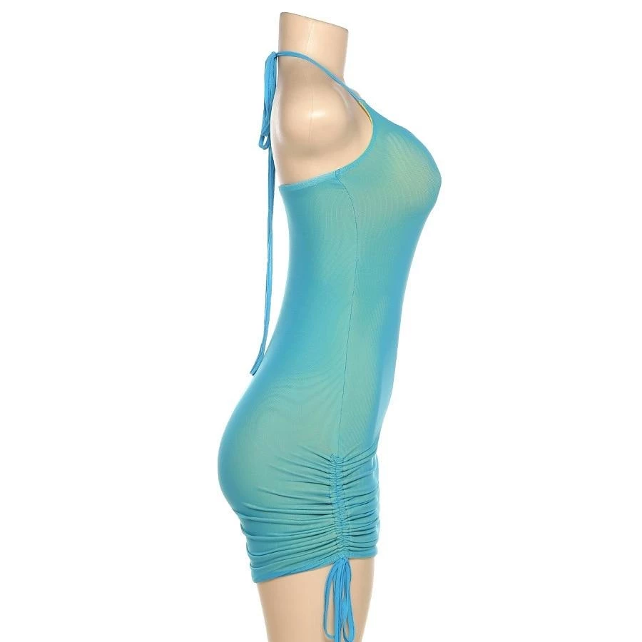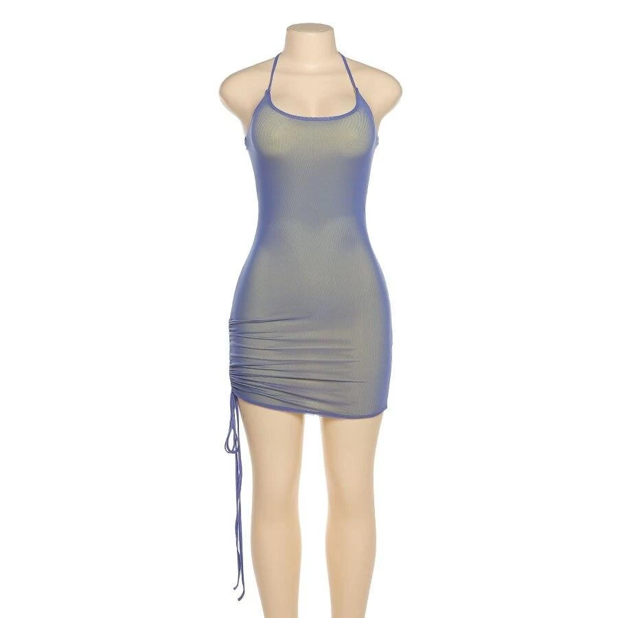 Holo-style halter neck mini dress with side ruched and a contrast colour undertone.