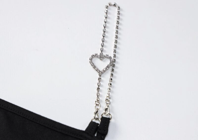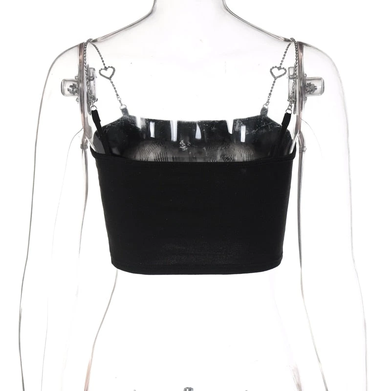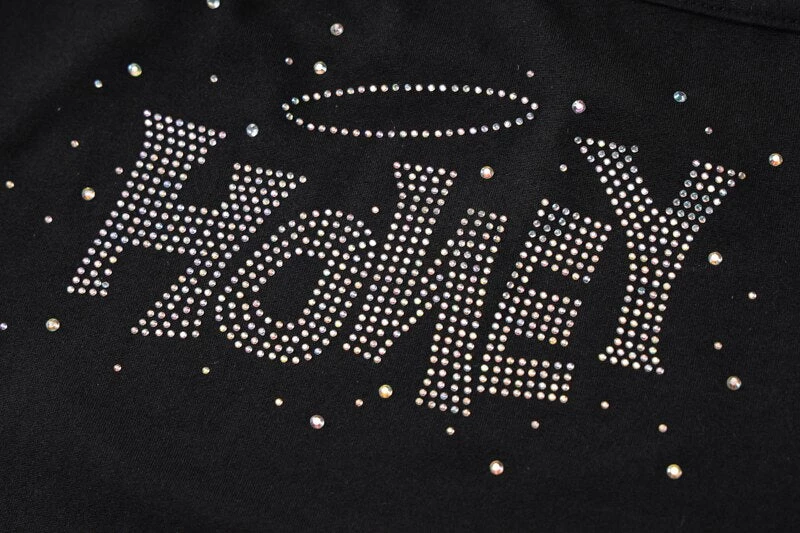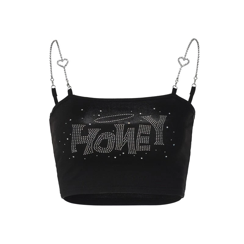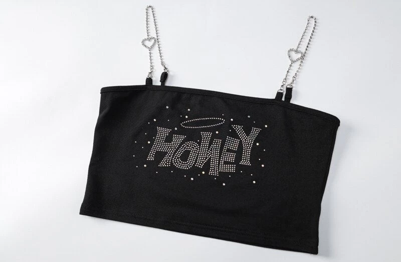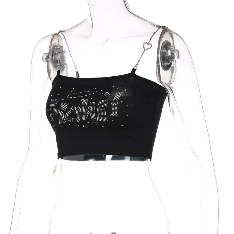 Black cami crop top with a rhinestone ‘HONEY’ slogan and rhinestone straps.