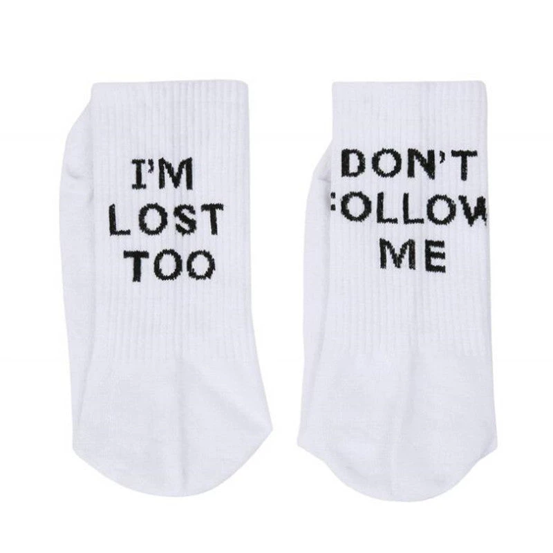 White ‘DON’T FOLLOW ME I’M LOST TOO’ slogan socks.