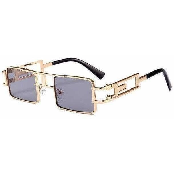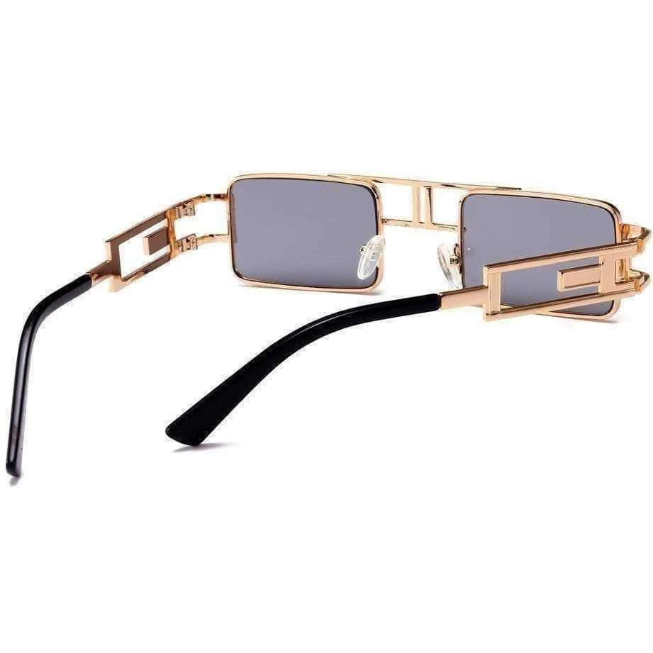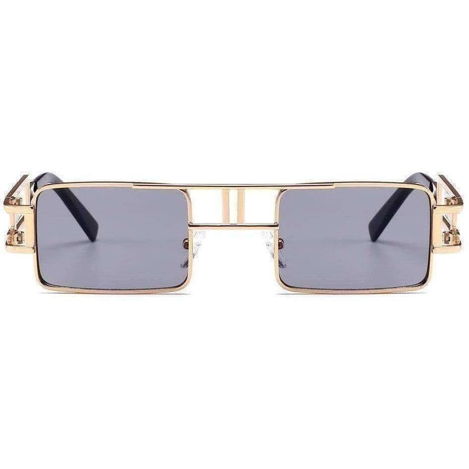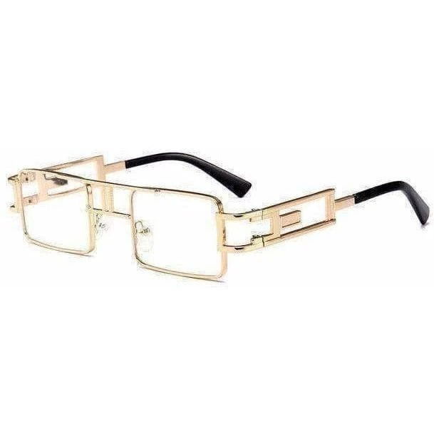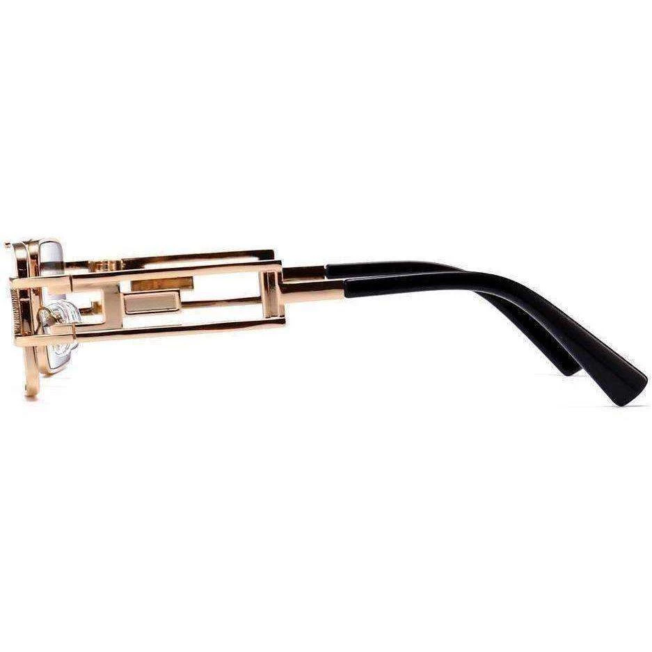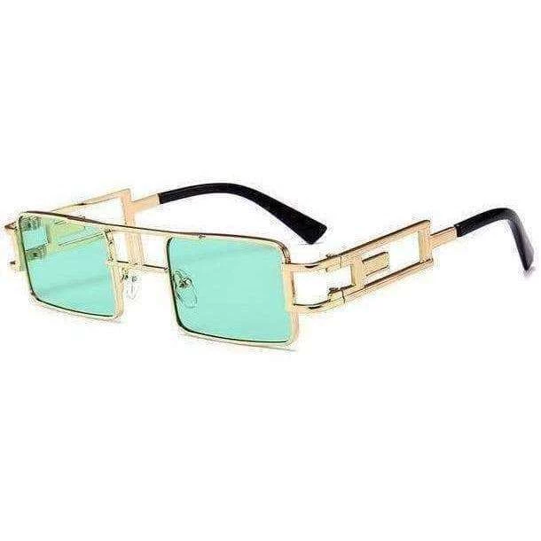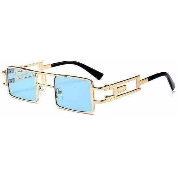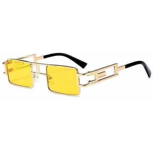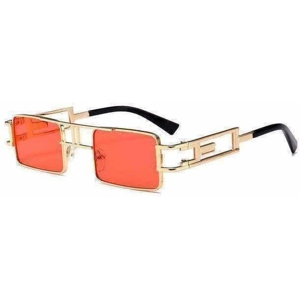 Gold plated frame rectangular sunglasses with coloured lenses.