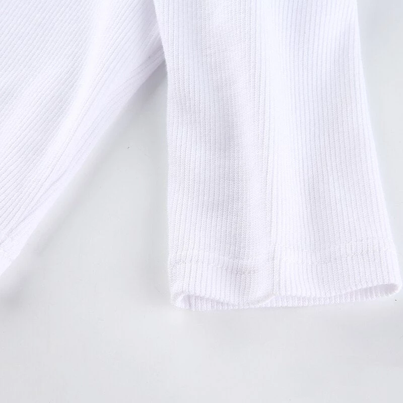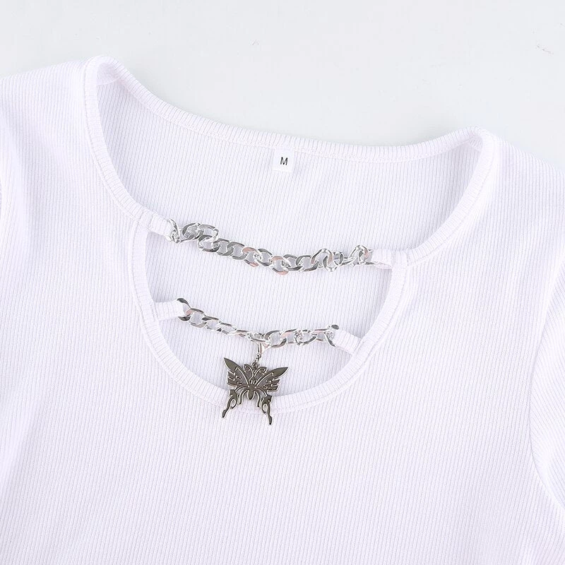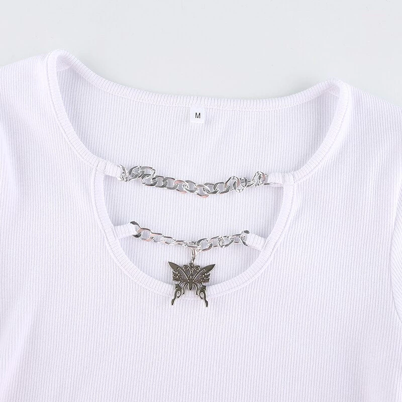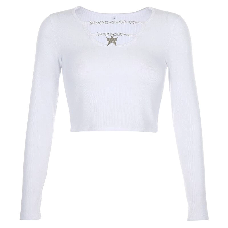 Ribbed white long sleeve crop with a chain butterfly dangle design.