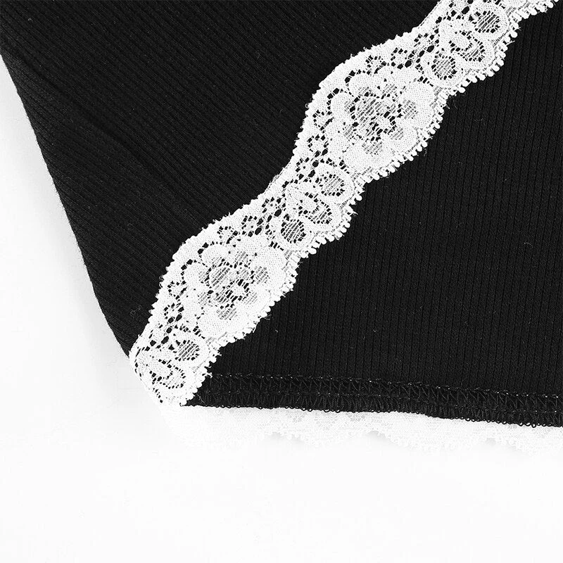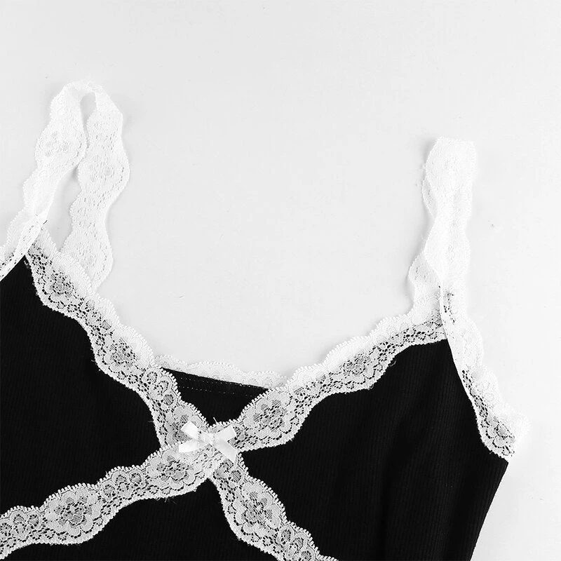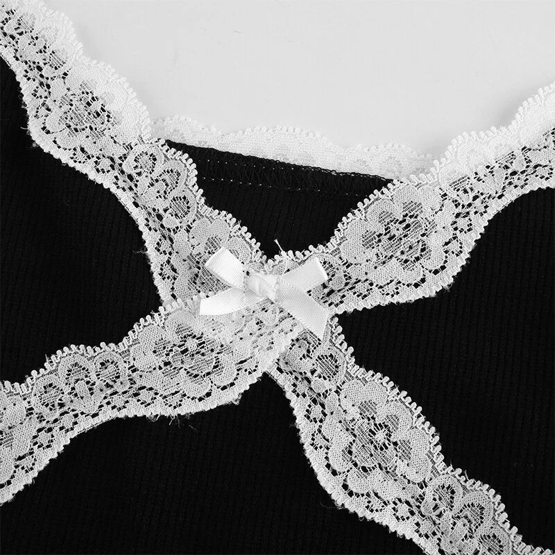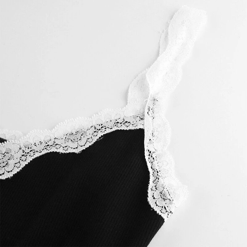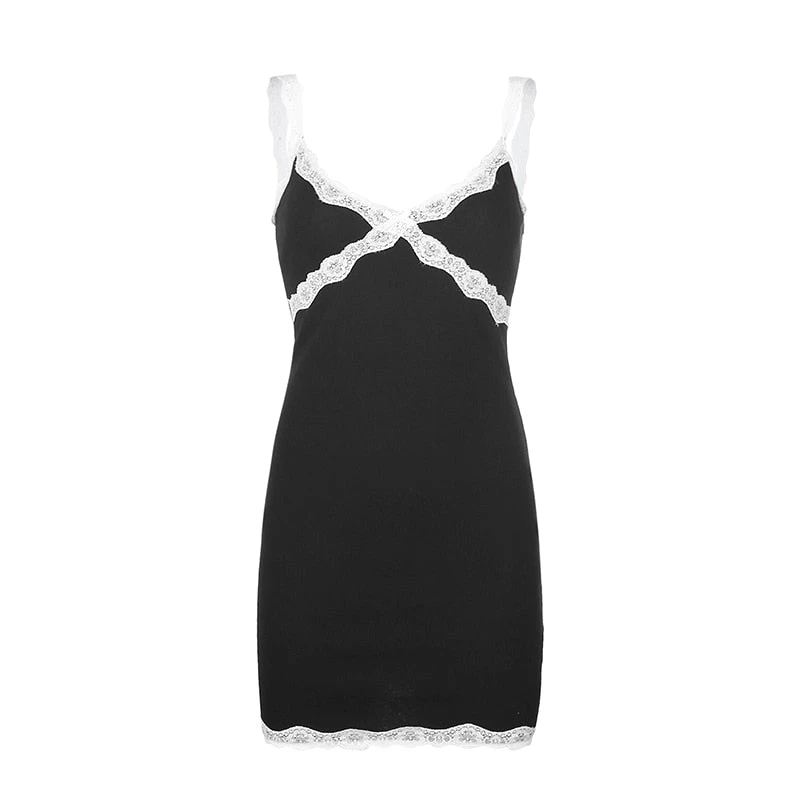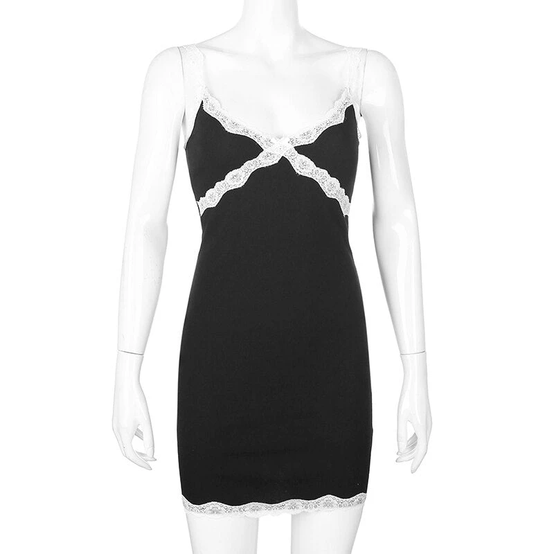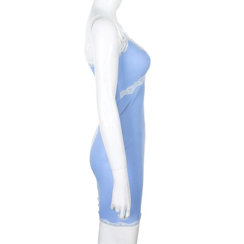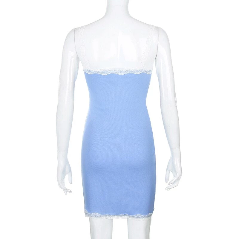 Blue or black bodycon mini dress with a white lace bust, strap and hemline trim.