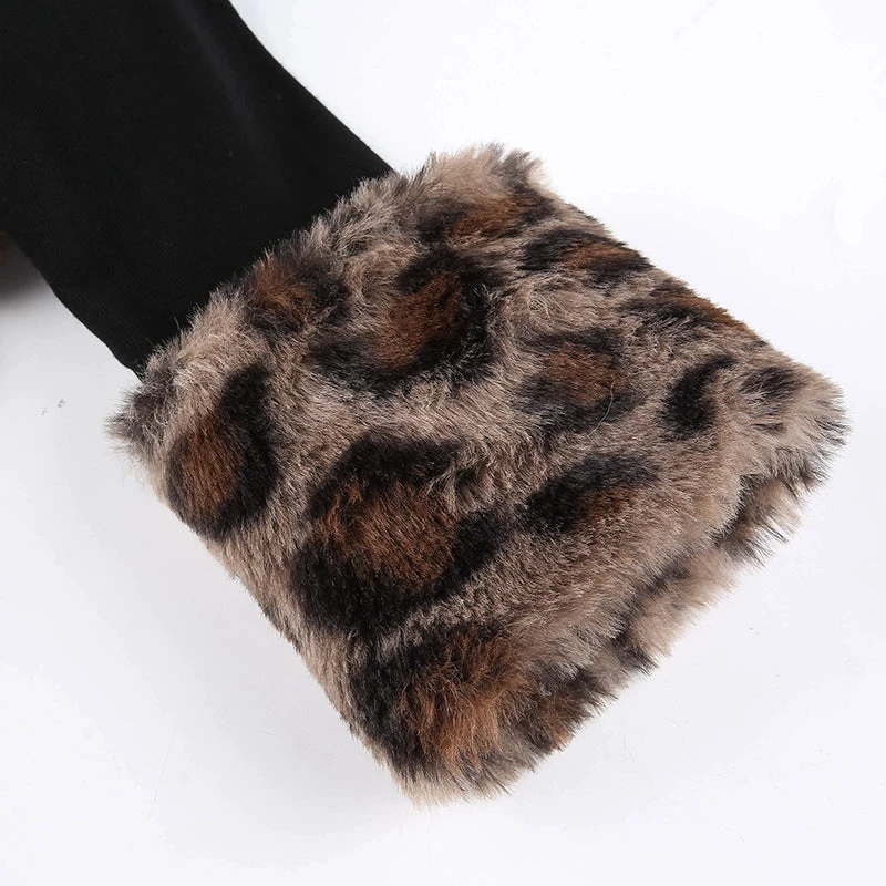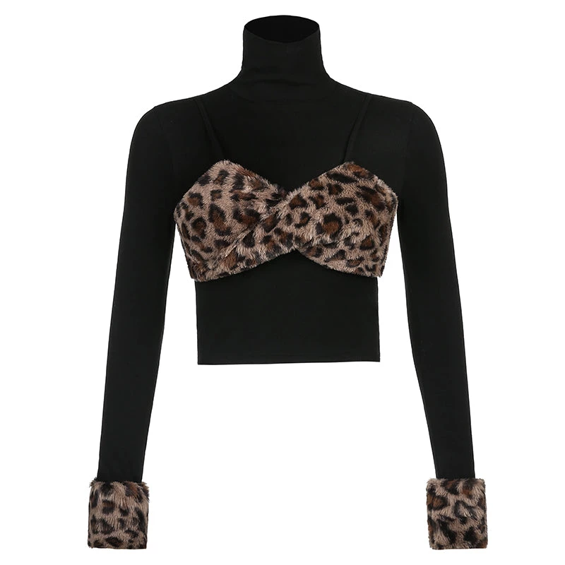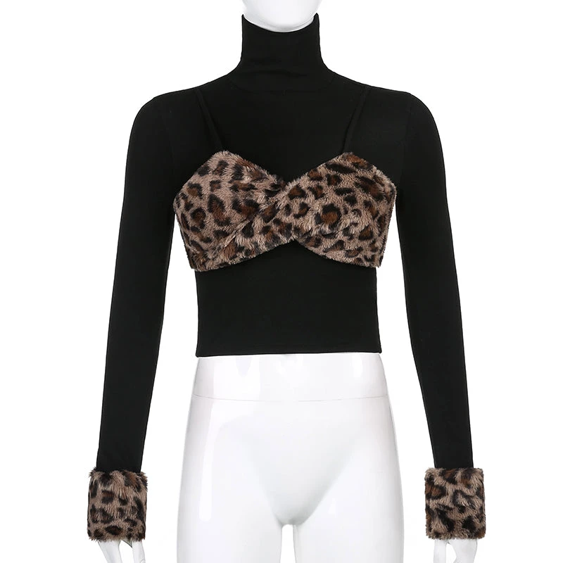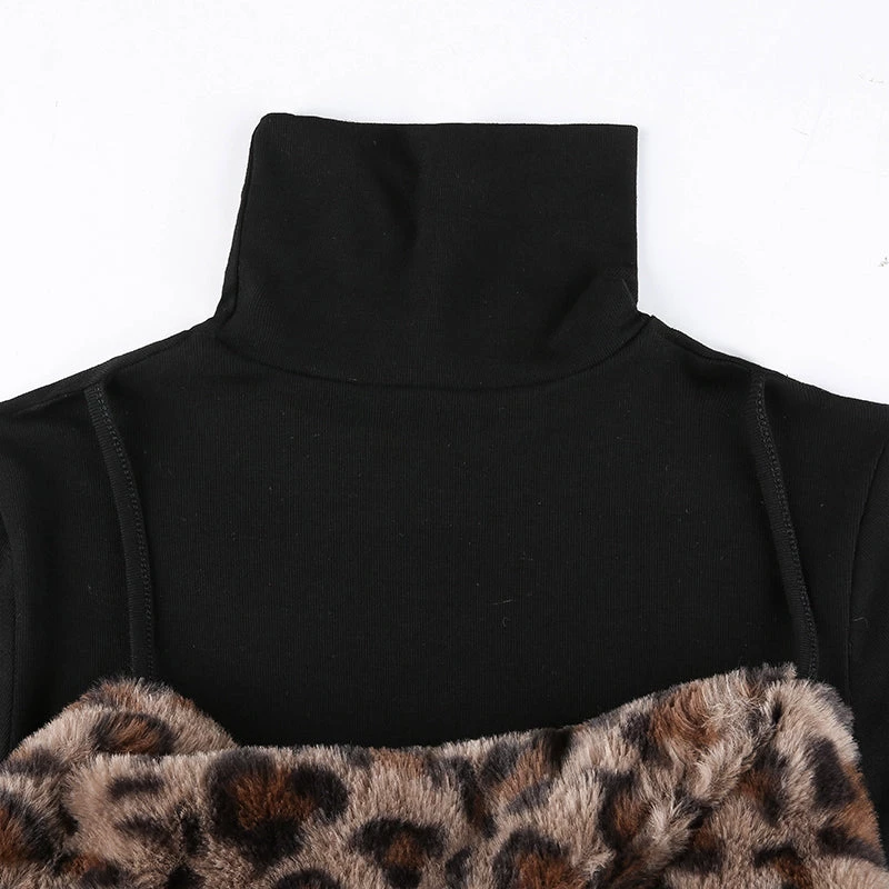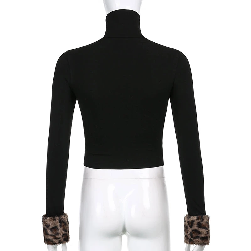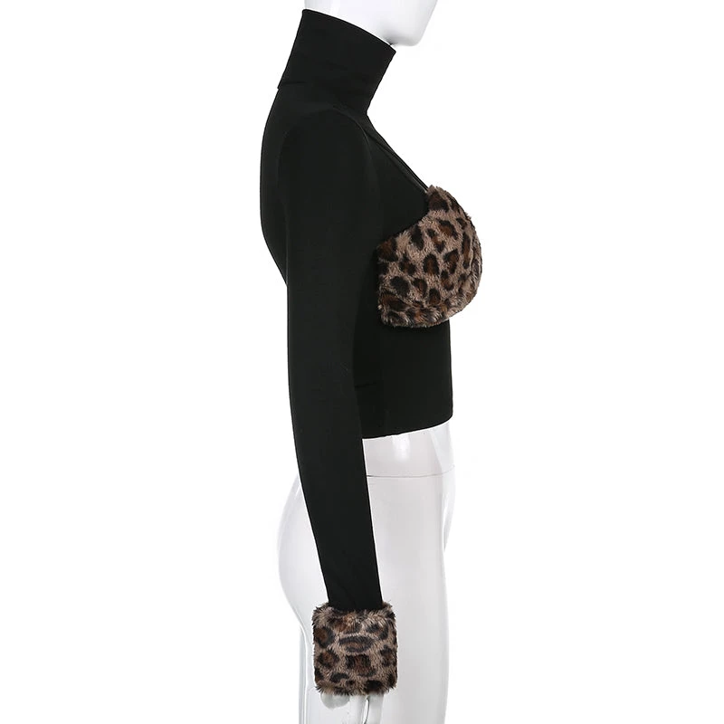 Black turtleneck top with a chunky leopard print faux fur bust and cuffs.
