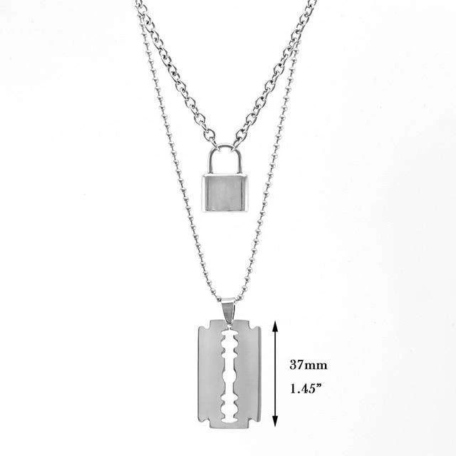 Silver coloured double layer necklace with a blade and lock pendant. 50-60cm length.