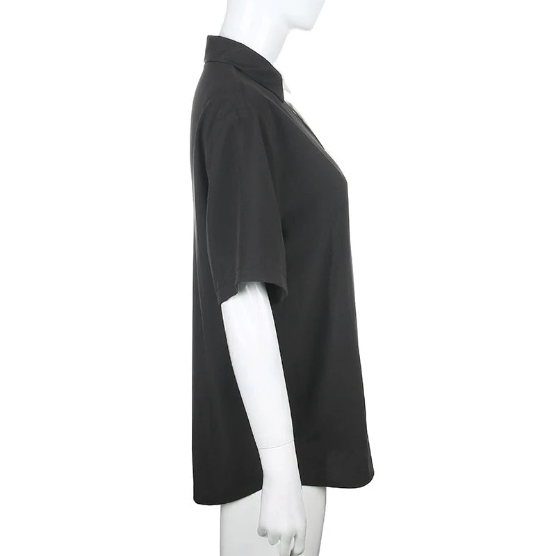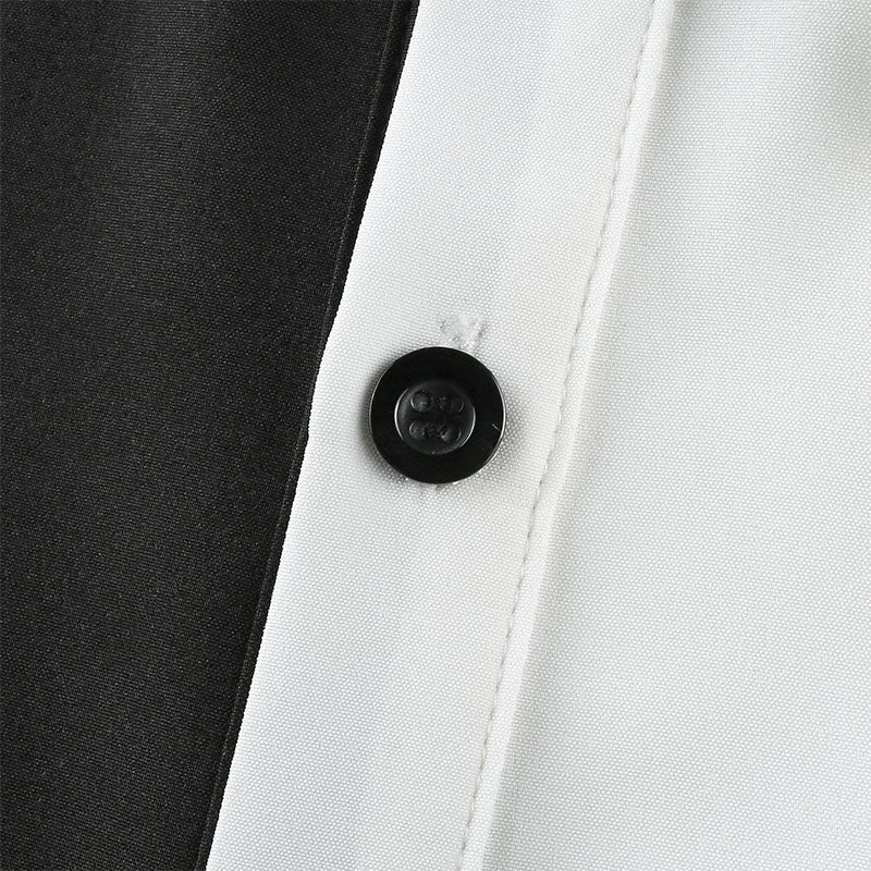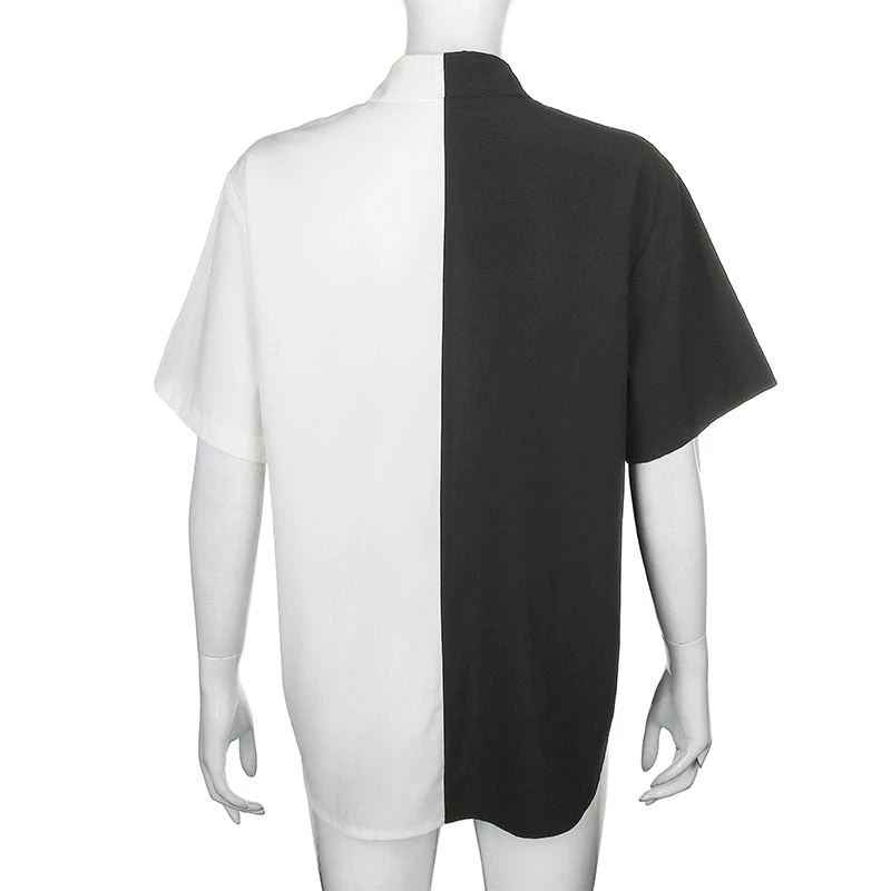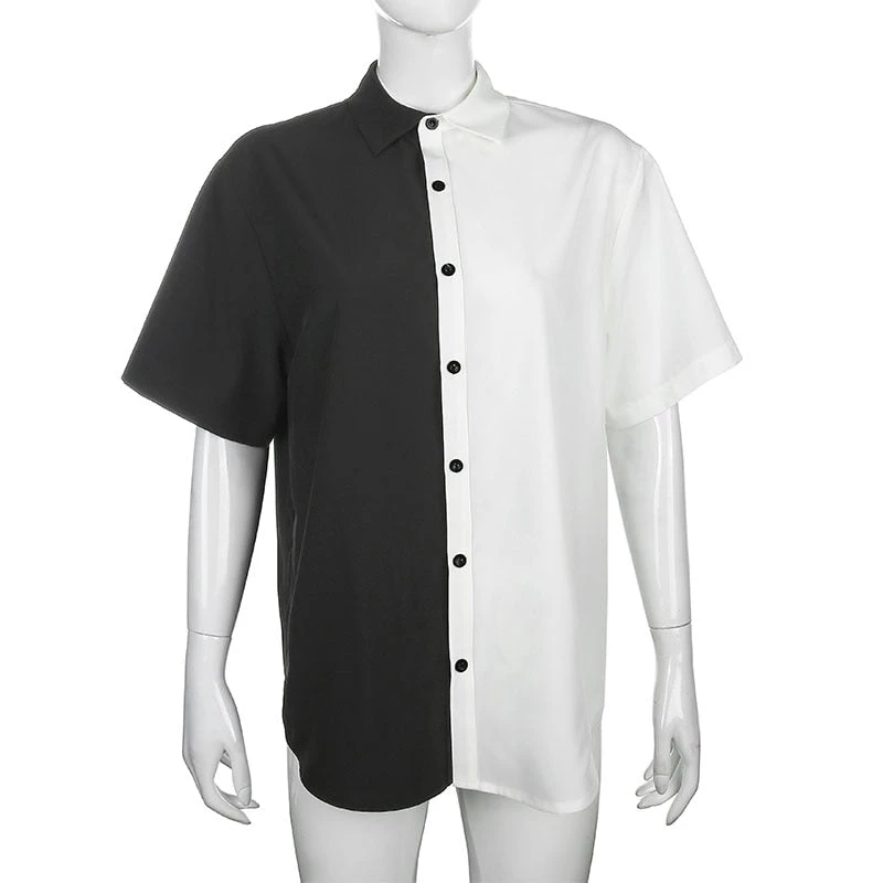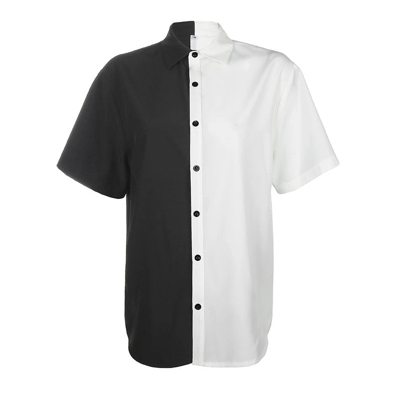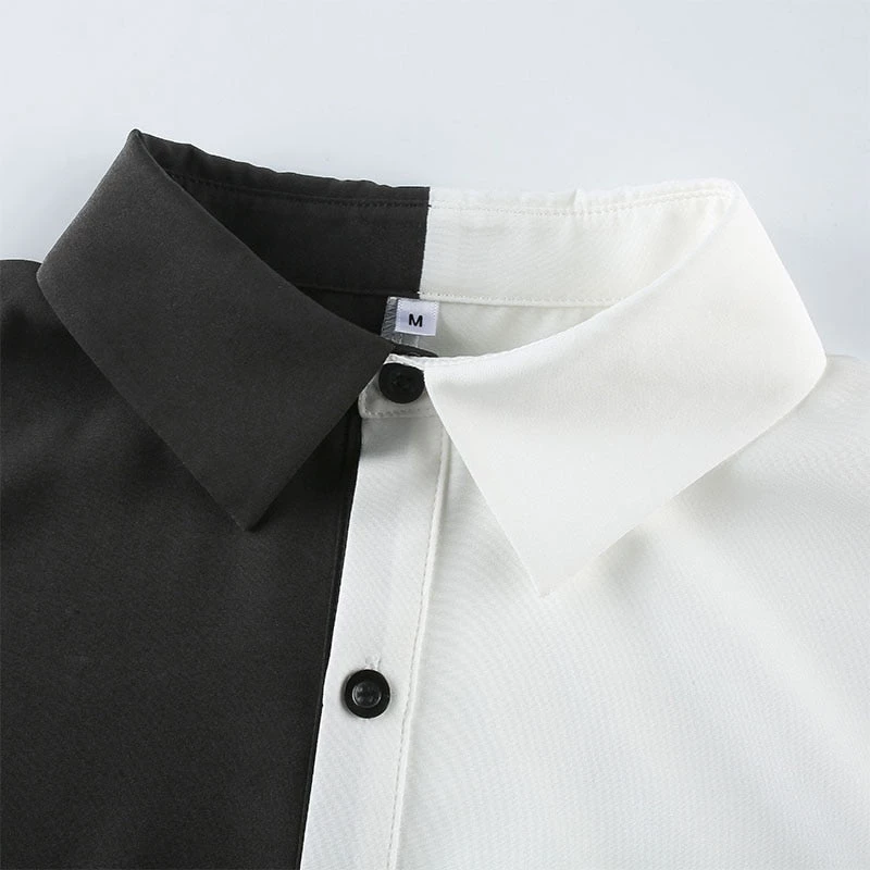Black and white spliced long shirt with black buttons.