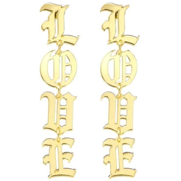 ‘LOVE’ letter drop earrings in a gold colour.