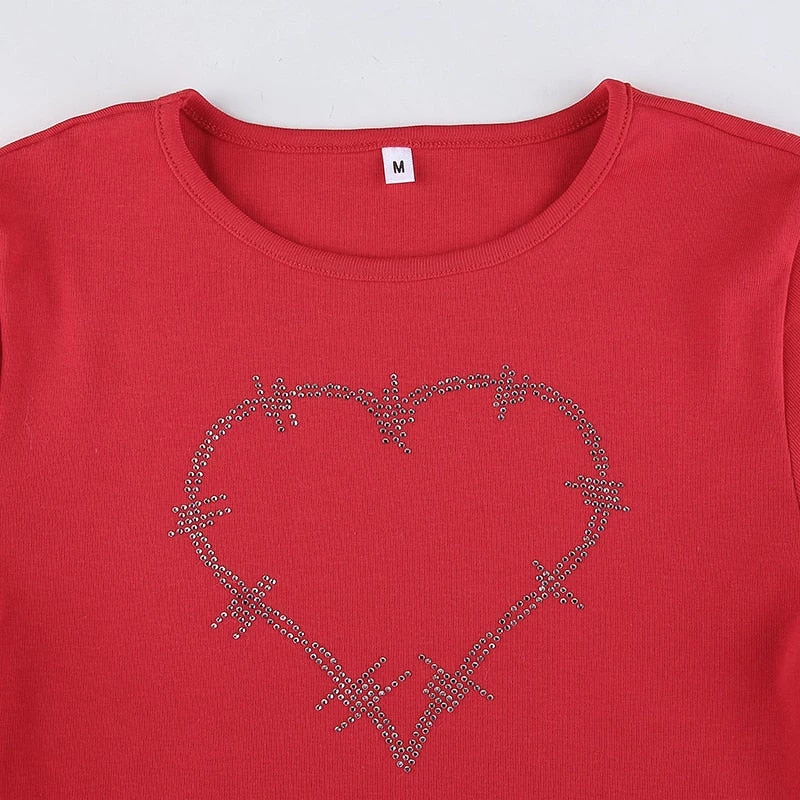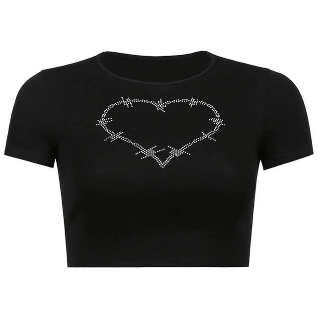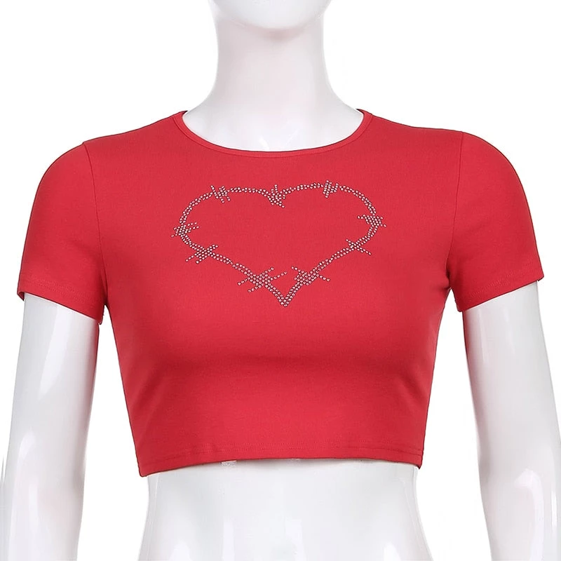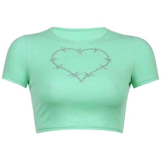 Various colour short sleeved crop top with a diamante barbed wire heart design.
