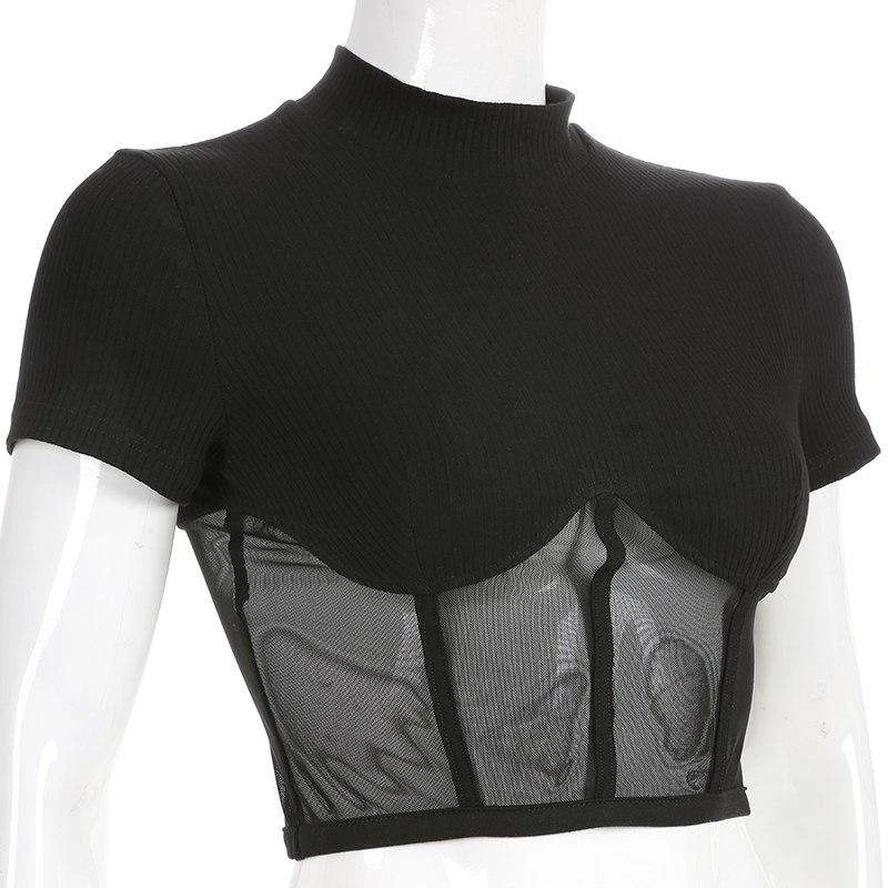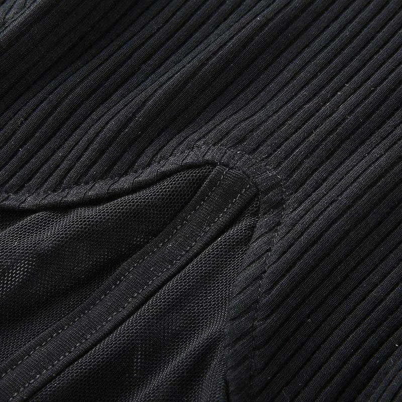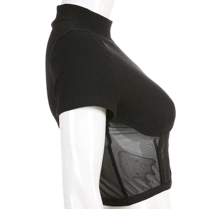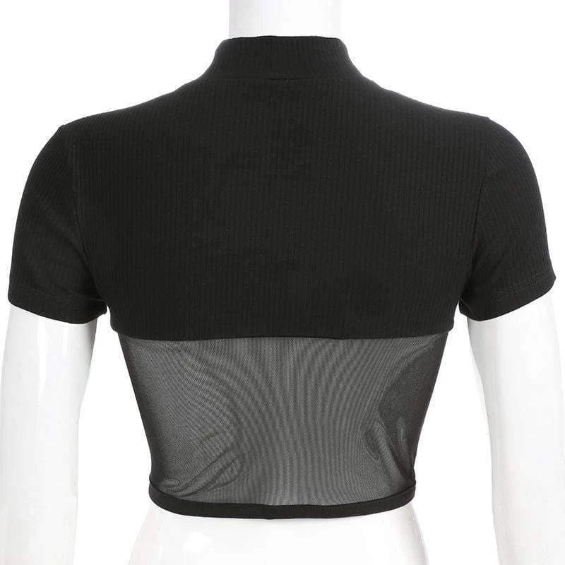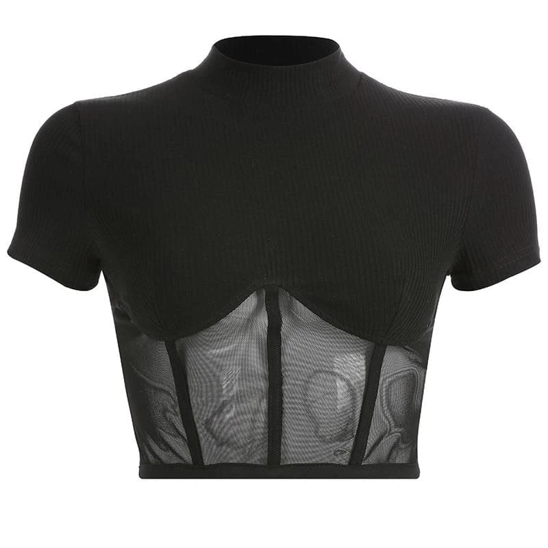 Black ribbed and high neck top with a mesh lower half.
