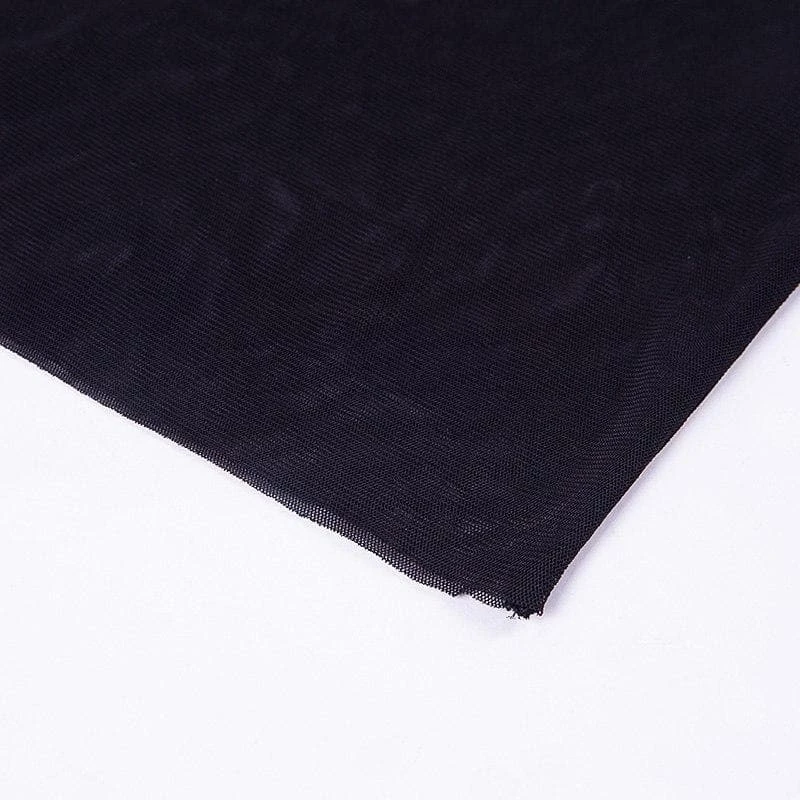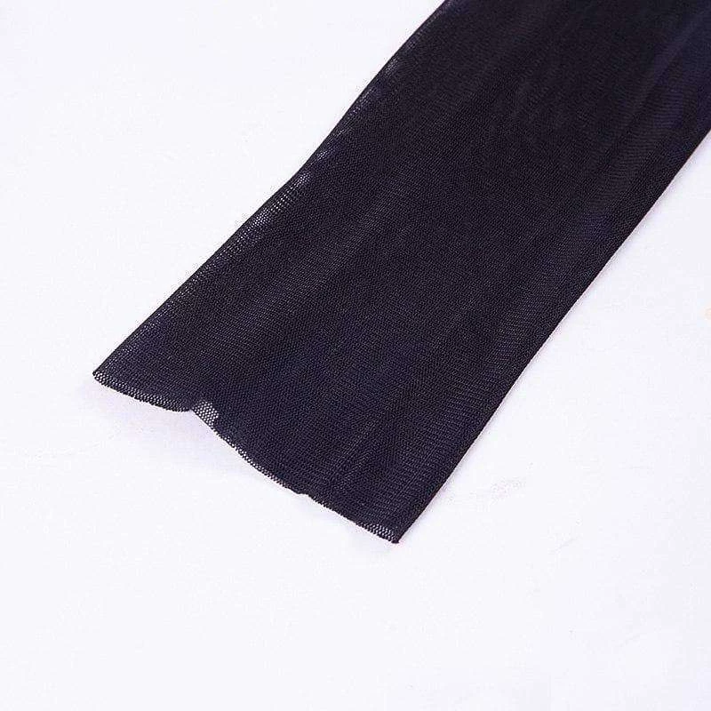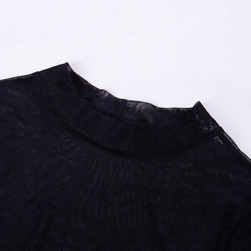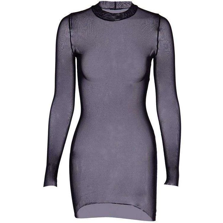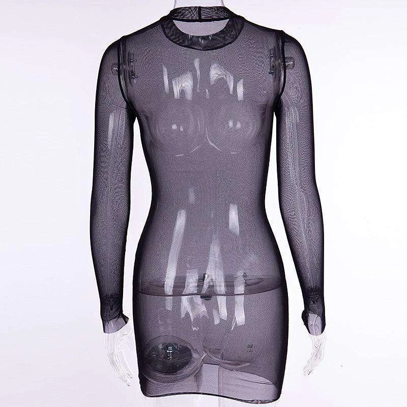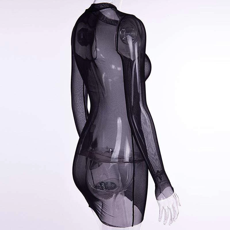 Long sleeved, sheer, black mesh mini dress.