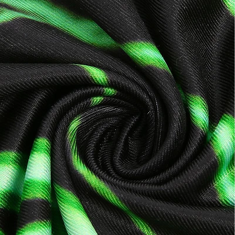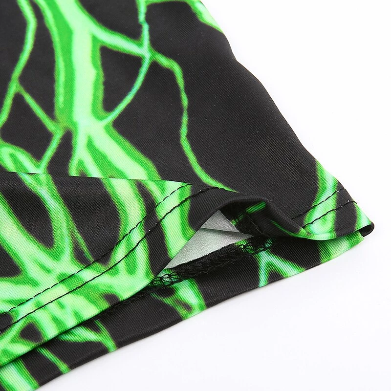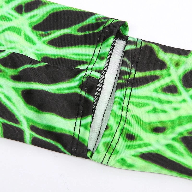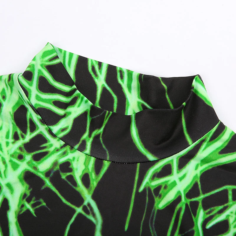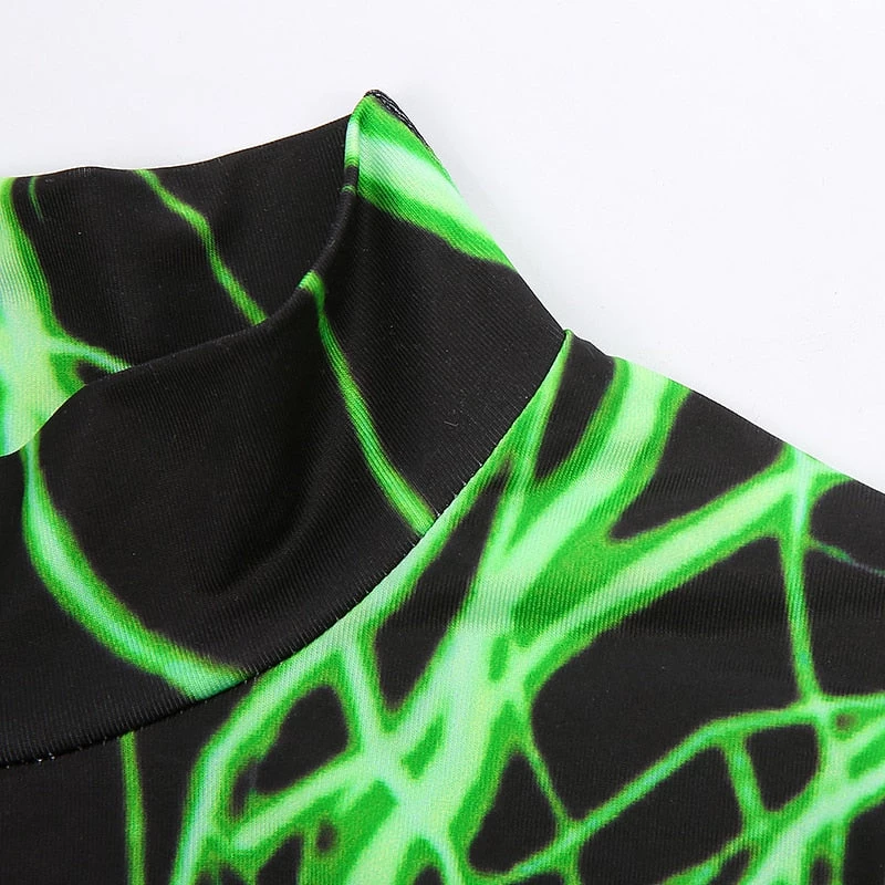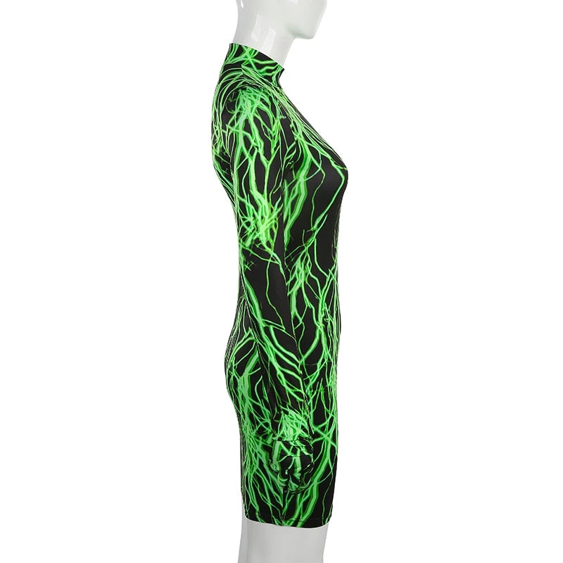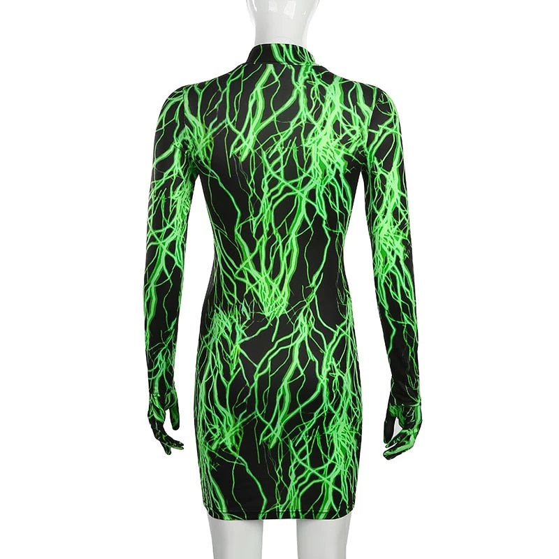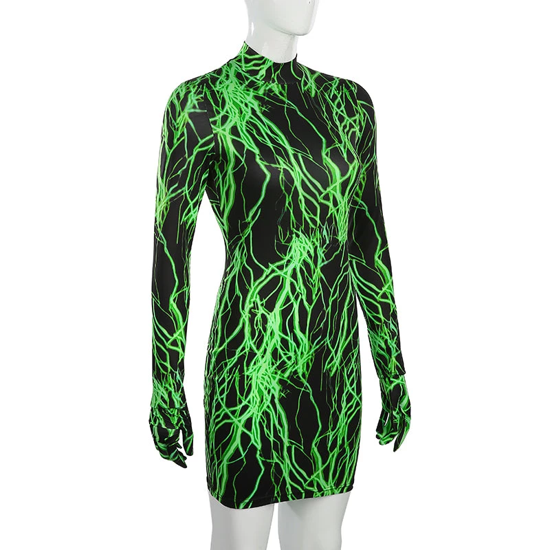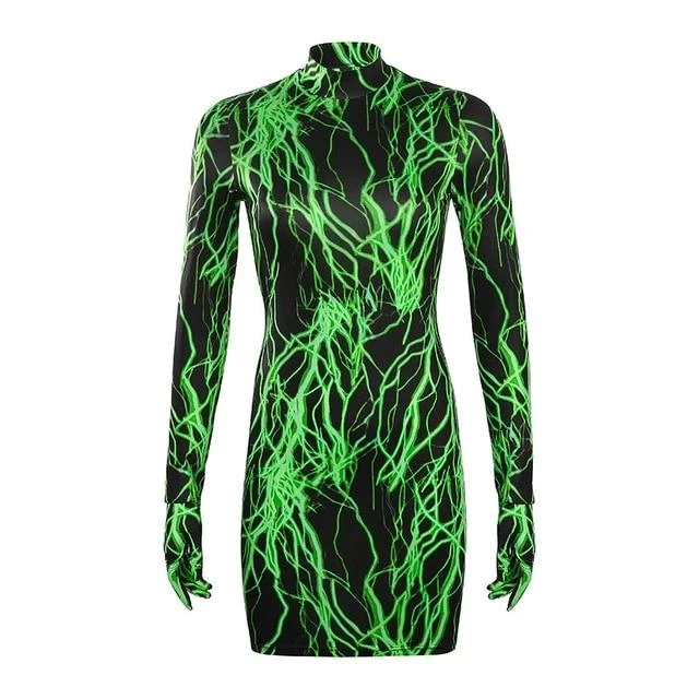 Black high neck mini dress with long sleeves leading into gloves and a neon green lightning print.