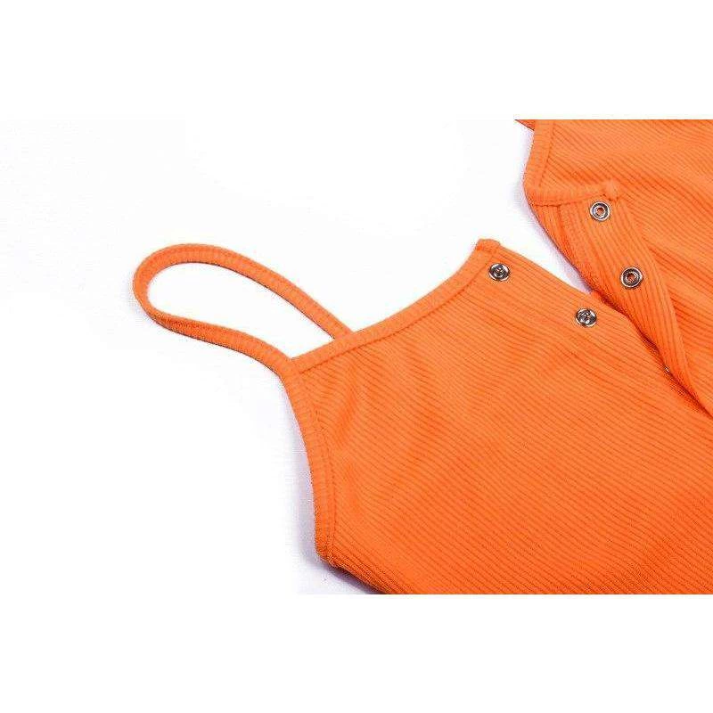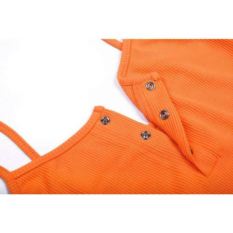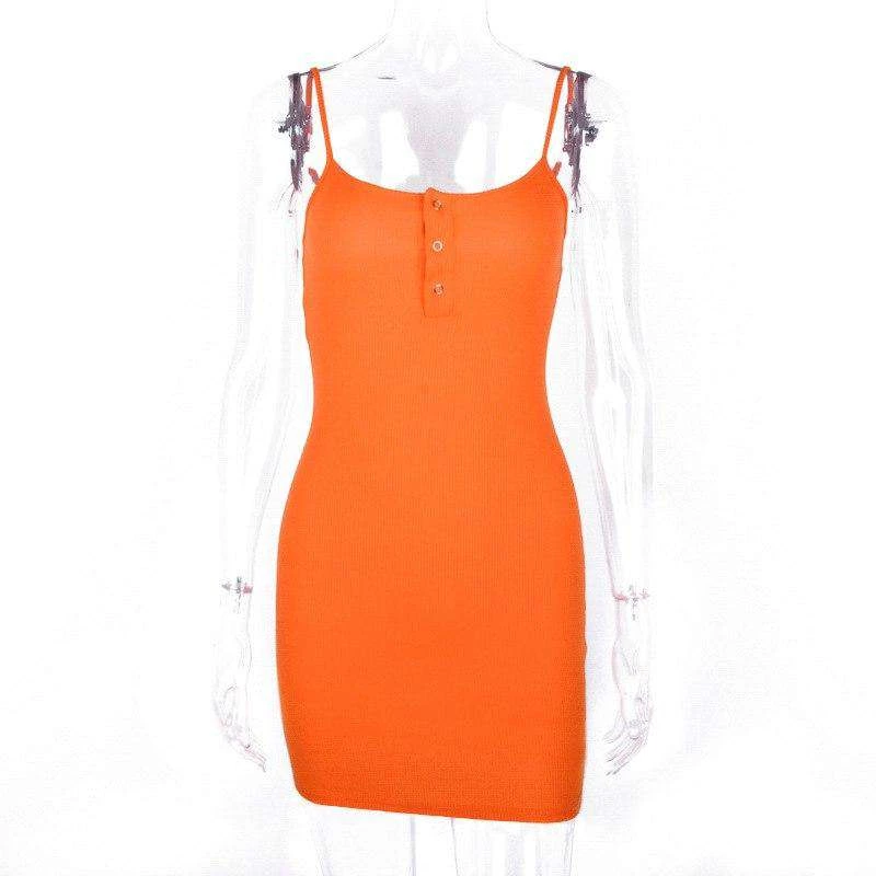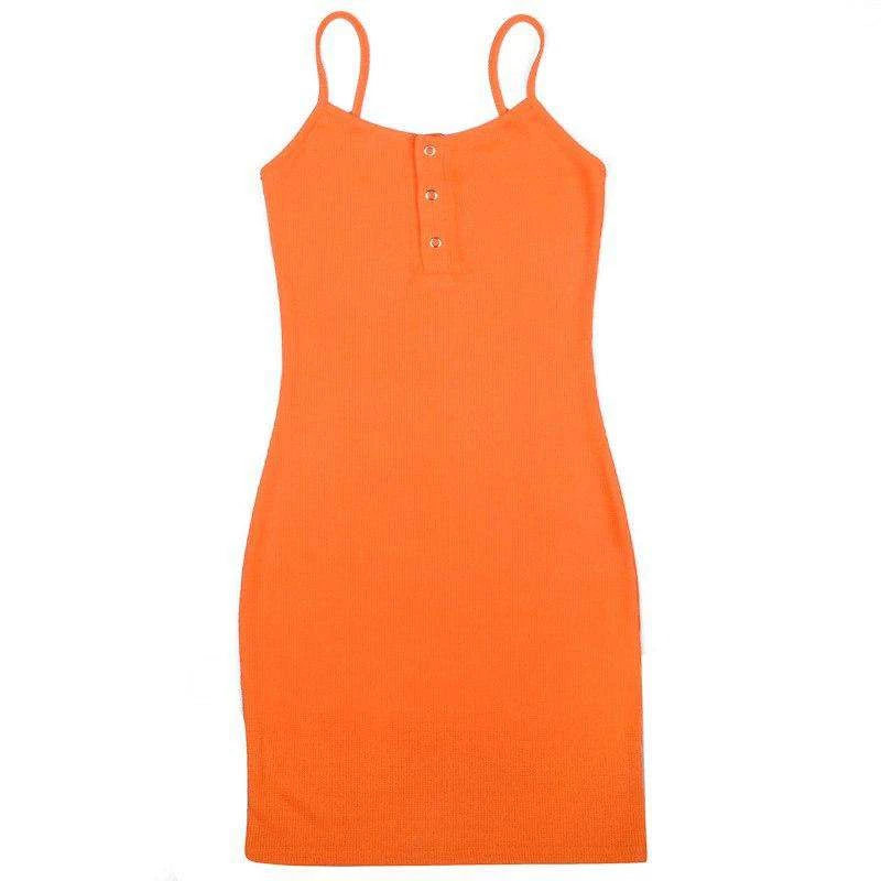Bright orange spaghetti strap mini dress with a popper button chest.