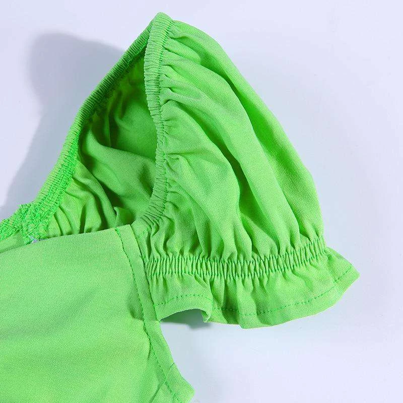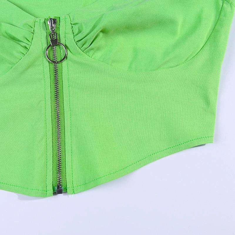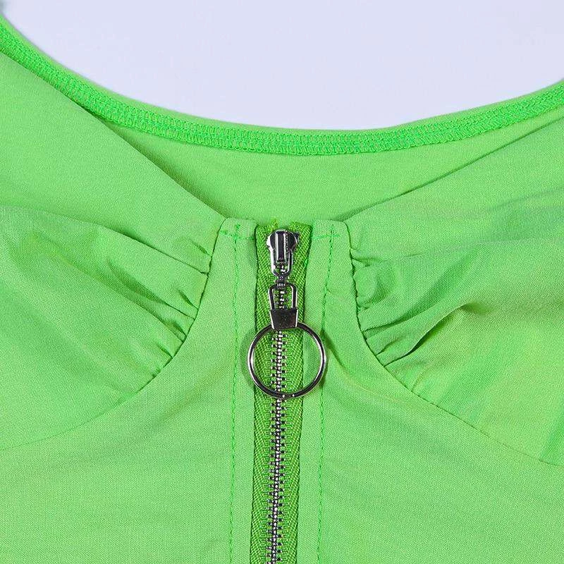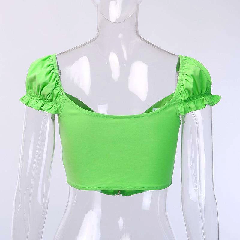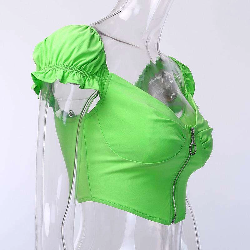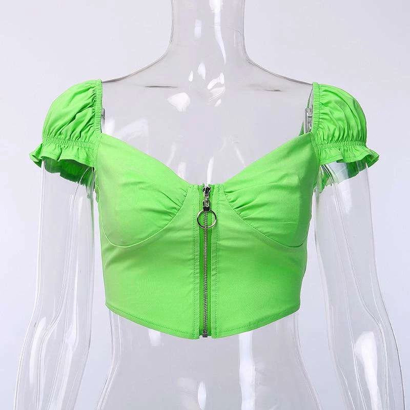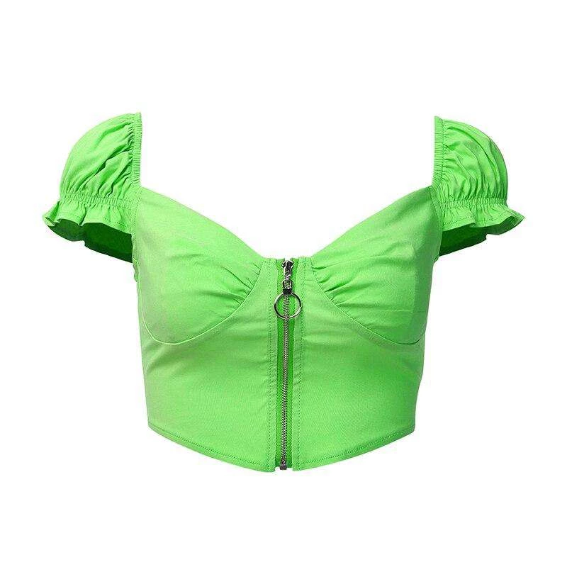Neon green or white puff sleeve, nineties-style crop with a pointed hemline and zip fastening.