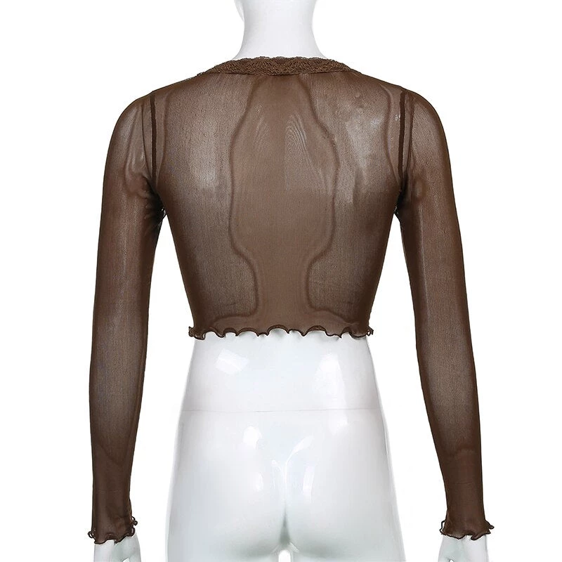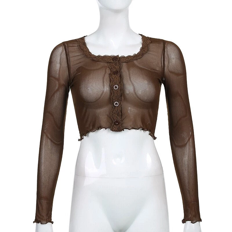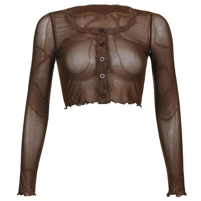 Brown mesh button up crop top. Fits small, consider sizing up.