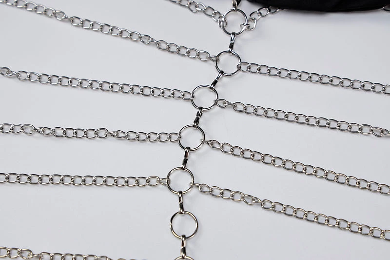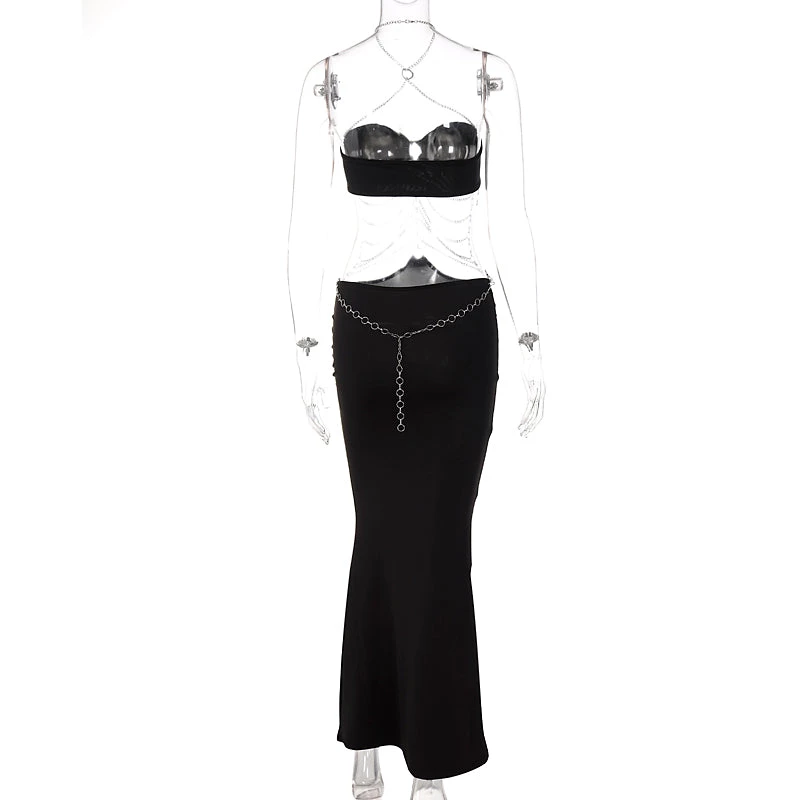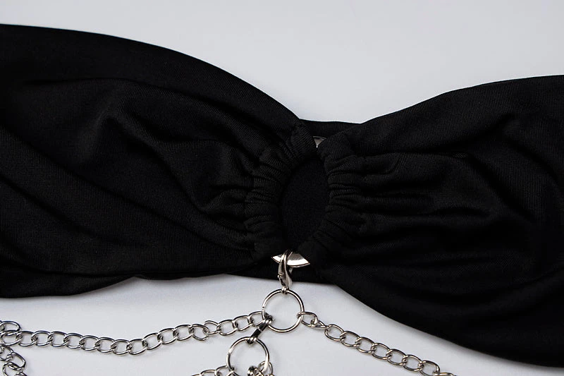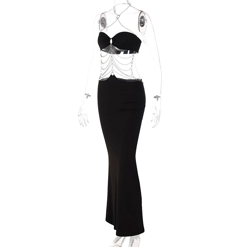 Backless black maxi dress with a cut out mid section and chain straps alongside a chain halter neck strap.