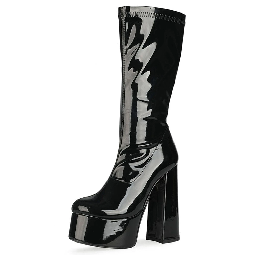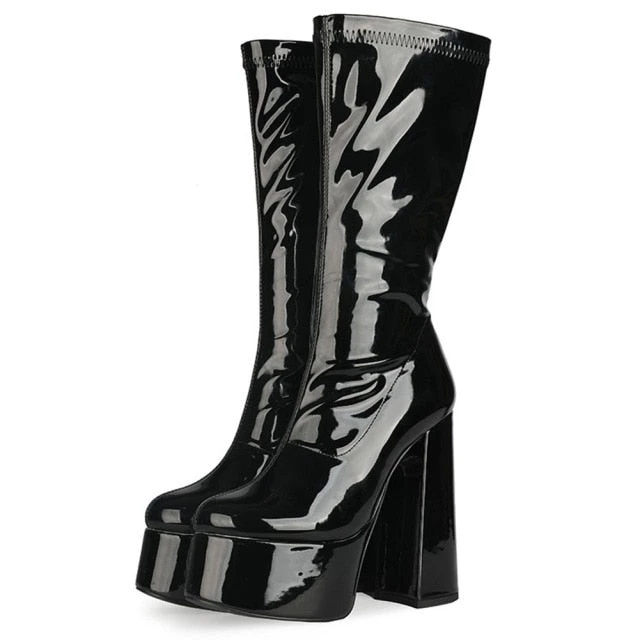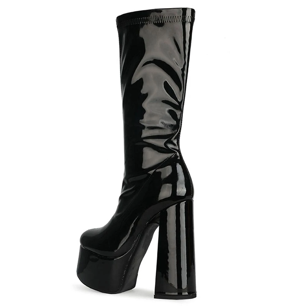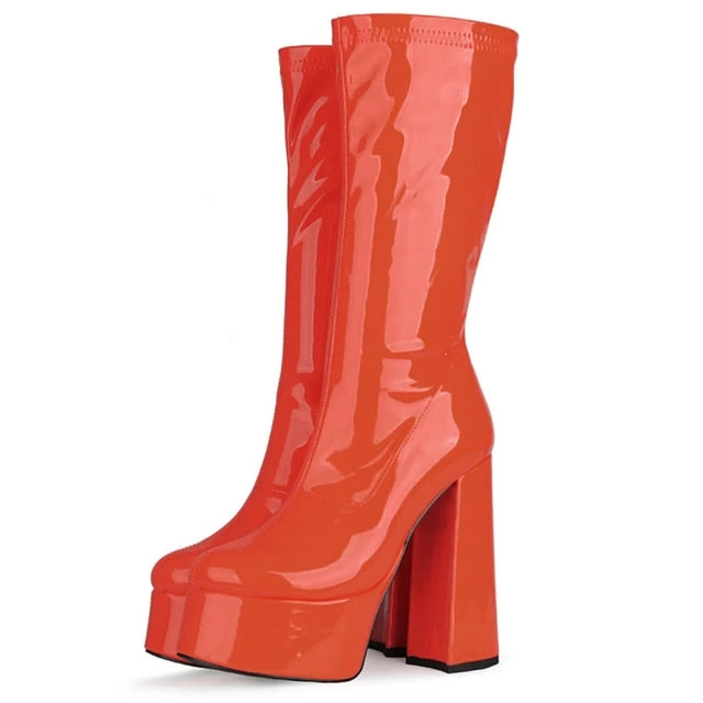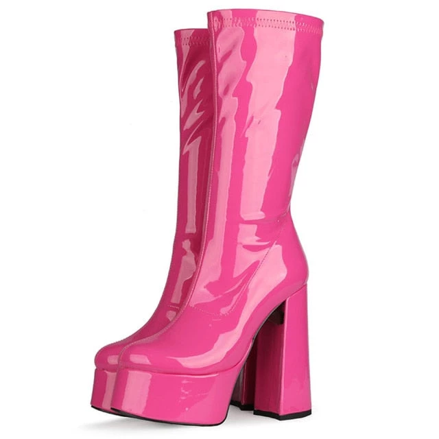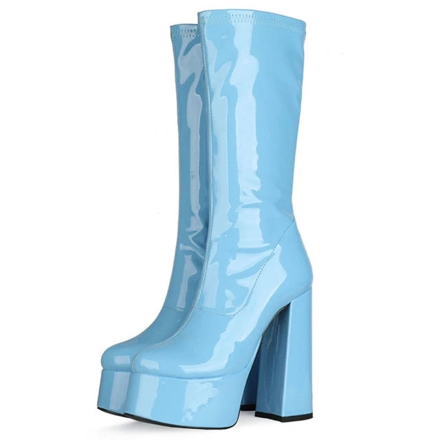 Retro-style patent coloured mid-calf platform heeled boots. Zip fastening.